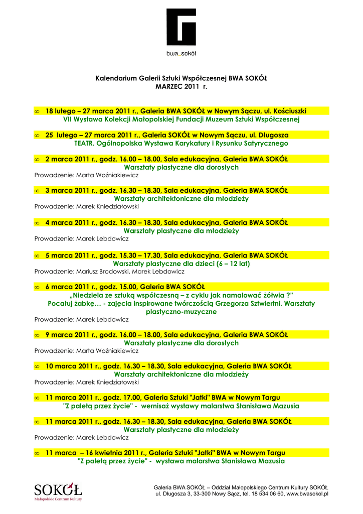 Kalendarium Galerii Sztuki Współczesnej BWA SOKÓŁ MARZEC 2011 r. • 18 lutego – 27 marca 2011 r., Galeria BWA SOKÓŁ w Nowym Sączu, ul. Kościuszki VII Wystawa Kolekcji Małopolskiej Fundacji Muzeum Sztuki Współczesnej • 25 lutego – 27 marca 2011 r., Galeria SOKÓŁ w Nowym Sączu, ul. Długosza TEATR. Ogólnopolska Wystawa Karykatury i Rysunku Satyrycznego • 2 marca 2011 r., godz. 16.00 – 18.00, Sala edukacyjna, Galeria BWA SOKÓŁ Warsztaty plastyczne dla dorosłych Prowadzenie: Marta Woźniakiewicz • 3 marca 2011 r., godz. 16.30 – 18.30, Sala edukacyjna, Galeria BWA SOKÓŁ Warsztaty architektoniczne dla młodzieŜy Prowadzenie: Marek Kniedziałowski • 4 marca 2011 r., godz. 16.30 – 18.30, Sala edukacyjna, Galeria BWA SOKÓŁ Warsztaty plastyczne dla młodzieŜy Prowadzenie: Marek Lebdowicz • 5 marca 2011 r., godz. 15.30 – 17.30, Sala edukacyjna, Galeria BWA SOKÓŁ Warsztaty plastyczne dla dzieci (6 – 12 lat) Prowadzenie: Mariusz Brodowski, Marek Lebdowicz • 6 marca 2011 r., godz. 15.00, Galeria BWA SOKÓŁ „Niedziela ze sztuką współczesną – z cyklu jak namalować Ŝółwia ?” Pocałuj Ŝabkę… - zajęcia inspirowane twórczością Grzegorza Sztwiertni. Warsztaty plastyczno-muzyczne Prowadzenie: Marek Lebdowicz • 9 marca 2011 r., godz. 16.00 – 18.00, Sala edukacyjna, Galeria BWA SOKÓŁ Warsztaty plastyczne dla dorosłych Prowadzenie: Marta Woźniakiewicz • 10 marca 2011 r., godz. 16.30 – 18.30, Sala edukacyjna, Galeria BWA SOKÓŁ Warsztaty architektoniczne dla młodzieŜy Prowadzenie: Marek Kniedziałowski • 11 marca 2011 r., godz. 17.00, Galeria Sztuki "Jatki" BWA w Nowym Targu "Z paletą przez Ŝycie" - wernisaŜ wystawy malarstwa Stanisława Mazusia • 11 marca 2011 r., godz. 16.30 – 18.30, Sala edukacyjna, Galeria BWA SOKÓŁ Warsztaty plastyczne dla młodzieŜy Prowadzenie: Marek Lebdowicz • 11 marca – 16 kwietnia 2011 r., Galeria Sztuki "Jatki" BWA w Nowym Targu "Z paletą przez Ŝycie" - wystawa malarstwa Stanisława Mazusia Galeria BWA SOKÓŁ – Oddział Małopolskiego Centrum Kultury SOKÓŁ ul. Długosza 3, 33-300 Nowy Sącz, tel. 18 534 06 60, www.bwasokol.pl • 12 marca 2011 r., godz. 15.30 – 17.30, Sala edukacyjna, Galeria BWA SOKÓŁ Warsztaty plastyczne dla dzieci (6 – 12 lat) Prowadzenie: Mariusz Brodowski, Marek Lebdowicz • 13 marca 2011 r., godz. 15.00, Galeria BWA SOKÓŁ „Niedziela ze sztuką współczesną – z cyklu jak namalować Ŝółwia ?” Maluję jak równy z równym - warsztaty inspirowane twórczością Marka Szczęsnego Prowadzenie: Mariusz Brodowski • 16 marca 2011 r., godz. 16.00 – 18.00, Sala edukacyjna, Galeria BWA SOKÓŁ Warsztaty plastyczne dla dorosłych Prowadzenie: Marta Woźniakiewicz • 17 marca 2011 r., godz. 16.30 – 18.30, Sala edukacyjna, Galeria BWA SOKÓŁ Warsztaty architektoniczne dla młodzieŜy Prowadzenie: Marek Kniedziałowski • 18 marca 2011 r., godz. 16.30 – 18.30, Sala edukacyjna, Galeria BWA SOKÓŁ Warsztaty plastyczne dla młodzieŜy Prowadzenie: Marek Lebdowicz • 19 marca 2011 r., godz. 15.30 – 17.30 , Sala edukacyjna, Galeria BWA SOKÓŁ Warsztaty plastyczne dla dzieci (6 – 12 lat) Prowadzenie: Mariusz Brodowski, Marek Lebdowicz • 20 marca 2011 r., godz. 15.00, Galeria BWA SOKÓŁ „Niedziela ze sztuką współczesną – z cyklu jak namalować Ŝółwia ?” Dar artysty - tworzenie parafrazy sztuki współczesnej. Próba „namalowania definicji” pojęcia ‘artysta współczesny – głos społeczeństwa’ poprzez dźwięk i kolor. Prowadzenie: Szymon Marciniak i Katarzyna Smoleń • 23 marca 2011 r., godz. 17.00, Sala edukacyjna, Galeria BWA SOKÓŁ „Ikona dzisiaj” - wykład z zakresu historii sztuki Prowadzenie: dr Izabela Trzcińska • 24 marca 2011 r., godz. 16.30 – 18.30, Sala edukacyjna, Galeria BWA SOKÓŁ Warsztaty architektoniczne dla młodzieŜy Prowadzenie: Marek Kniedziałowski • 24 marca 2011 r., godz. 18.00, Galeria Sztuki "Jatki" BWA w Nowym Targu Spotkanie z cyklu "Mam Wam coś do powiedzenia" - Piotr Witosławski • 25 marca 2011 r., godz. 16.30 – 18.30, Sala edukacyjna, Galeria BWA SOKÓŁ Warsztaty plastyczne dla młodzieŜy Prowadzenie: Marek Lebdowicz • 25 marca 2011 r., godz. 19.00, Galeria Sztuki "Jatki" BWA w Nowym Targu I Podhalańskie Dni Gitary Klasycznej Nowy Targ 2011 – koncert Galeria BWA SOKÓŁ – Oddział Małopolskiego Centrum Kultury SOKÓŁ ul. Długosza 3, 33-300 Nowy Sącz, tel. 18 534 06 60, www.bwasokol.pl • 26 marca 2011 r., godz. 15.30 – 17.30, Sala edukacyjna, Galeria BWA SOKÓŁ Warsztaty plastyczne dla dzieci (6 – 12 lat) Prowadzenie: Mariusz Brodowski, Marek Lebdowicz • • 26 marca 2011 r., godz. 19.00, Galeria Sztuki "Jatki" BWA w Nowym Targu I Podhalańskie Dni Gitary Klasycznej Nowy Targ 2011 – koncert laureatów 27 marca 2011 r., godz. 15.00, Galeria BWA SOKÓŁ „Niedziela ze sztuką współczesną – z cyklu jak namalować Ŝółwia ?” Rekonstrukcje geometryczne… - warsztaty plastyczne inspirowane twórczością Teresy Bujnowskiej Prowadzenie: Mariusz Brodowski • 30 marca 2011 r., godz. 16.00 – 18.00, Sala edukacyjna, Galeria BWA SOKÓŁ Warsztaty plastyczne dla dorosłych Prowadzenie: Marta Woźniakiewicz • 31 marca 2011 r., godz. 16.30 – 18.30, Sala edukacyjna, Galeria BWA SOKÓŁ Warsztaty architektoniczne dla młodzieŜy Prowadzenie: Marek Kniedziałowski Galeria BWA SOKÓŁ – Oddział Małopolskiego Centrum Kultury SOKÓŁ ul. Długosza 3, 33-300 Nowy Sącz, tel. 18 534 06 60, www.bwasokol.pl