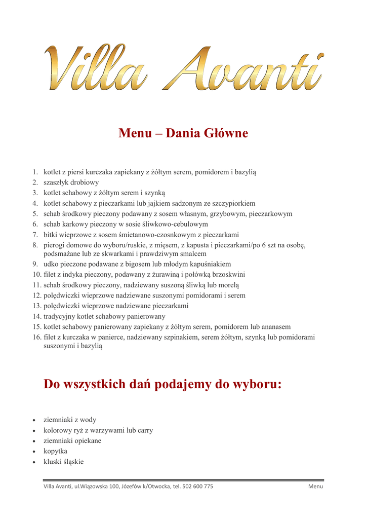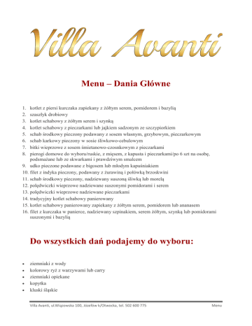 Menu – Dania Główne kotlet z piersi kurczaka zapiekany z żółtym serem, pomidorem i bazylią szaszłyk drobiowy kotlet schabowy z żółtym serem i szynką kotlet schabowy z pieczarkami lub jajkiem sadzonym ze szczypiorkiem schab środkowy pieczony podawany z sosem własnym, grzybowym, pieczarkowym schab karkowy pieczony w sosie śliwkowo-cebulowym bitki wieprzowe z sosem śmietanowo-czosnkowym z pieczarkami pierogi domowe do wyboru/ruskie, z mięsem, z kapusta i pieczarkami/po 6 szt na osobę, podsmażane lub ze skwarkami i prawdziwym smalcem 9. udko pieczone podawane z bigosem lub młodym kapuśniakiem 10. filet z indyka pieczony, podawany z żurawiną i połówką brzoskwini 11. schab środkowy pieczony, nadziewany suszoną śliwką lub morelą 12. polędwiczki wieprzowe nadziewane suszonymi pomidorami i serem 13. polędwiczki wieprzowe nadziewane pieczarkami 14. tradycyjny kotlet schabowy panierowany 15. kotlet schabowy panierowany zapiekany z żółtym serem, pomidorem lub ananasem 16. filet z kurczaka w panierce, nadziewany szpinakiem, serem żółtym, szynką lub pomidorami suszonymi i bazylią 1. 2. 3. 4. 5. 6. 7. 8. Do wszystkich dań podajemy do wyboru: ziemniaki z wody kolorowy ryż z warzywami lub carry ziemniaki opiekane kopytka kluski śląskie Villa Avanti, ul.Wiązowska 100, Józefów k/Otwocka, tel. 502 600 775 Menu gotowane warzywa /mix marchewka, kalafior, brokuł z masełkiem/ gotowane marchewki mini z masełkiem młoda kapustka /sezonowo/ bigos marchewka z groszkiem czerwona kapusta z jabłkiem /sezonowo/ surówka z białej kapusty surówka z kapusty pekińskiej surówka z cykorii z jabłkiem i śmietaną/sezonowo/ surówka z selera z rodzynkami i ananasem surówka z marchewki z chrzanem i śmietaną ogródek warzywny /różne warzywa z sosem vinegret/ mix sałat z sosem vinegret Villa Avanti, ul.Wiązowska 100, Józefów k/Otwocka, tel. 502 600 775 Menu