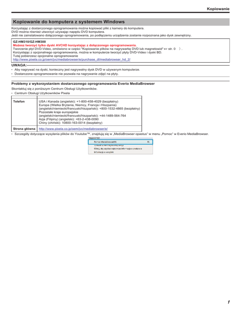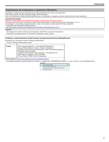 Kopiowanie Kopiowanie do komputera z systemem Windows Korzystając z dostarczonego oprogramowania można kopiować pliki z kamery do komputera. DVD można również utworzyć używając napędu DVD komputera. Jeśli nie zainstalowano dołączonego oprogramowania, po podłączeniu urządzenia zostanie rozpoznana jako dysk zewnętrzny. GZ-HM310/GZ-HM300 Możesz tworzyć tylko dyski AVCHD korzystając z dołączonego oprogramowania. Tworzenie płyt DVD-Video, omówiono w części "Kopiowanie plików na nagrywarkę DVD lub magnetowid" A str. 0 Korzystając z opcjonalnego oprogramowania, można w komputerze tworzyć płyty DVD-Video i dyski BD. Tutaj pobierzesz opcjonalne oprogramowanie http://www.pixela.co.jp/oem/jvc/mediabrowser/e/purchase_dl/mediabrowser_hd_2/ ). UWAGA: ● ● Aby nagrywać na dyski, konieczny jest nagrywalny dysk DVD w używanym komputerze. Dostarczone oprogramowanie nie pozwala na nagrywanie zdjęć na płyty. Problemy z wykorzystaniem dostarczonego oprogramowania Everio MediaBrowser Skontaktuj się z poniższym Centrum Obsługi Użytkowników. ● Centrum Obsługi Użytkowników Pixela USA i Kanada (angielski): +1-800-458-4029 (bezpłatny) Europa (Wielka Brytania, Niemcy, Francja i Hiszpania) (angielski/niemiecki/francuski/hiszpański): +800-1532-4865 (bezpłatny) Pozostałe kraje europejskie (angielski/niemiecki/francuski/hiszpański): +44-1489-564-764 Azja (Filipiny) (angielski): +63-2-438-0090 Chiny (chiński): 10800-163-0014 (bezpłatny) Strona główna http://www.pixela.co.jp/oem/jvc/mediabrowser/e/ Szczegóły dotyczące wysyłania plików do Youtube™, znajdują się w „MediaBrowser opastus” w menu „Pomoc” w Everio MediaBrowser. . ● Telefon 1