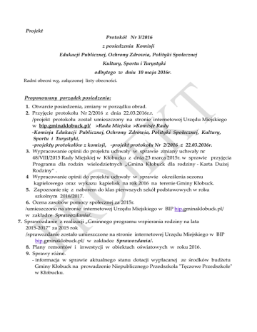 Projekt Protokół Nr 3/2016 z posiedzenia Komisji Edukacji Publicznej, Ochrony Zdrowia, Polityki Społecznej Kultury, Sportu i Turystyki odbytego w dniu 10 maja 2016r. Radni obecni wg. załączonej listy obecności. Proponowany porządek posiedzenia: 1. Otwarcie posiedzenia, zmiany w porządku obrad. 2. Przyjęcie protokołu Nr 2/2016 z dnia 22.03.2016r.r. /projekt protokołu został umieszczony na stronie internetowej Urzędu Miejskiego w bip.gminaklobuck.pl/ >Rada Miejska >Komisje Rady -Komisja Edukacji Publicznej, Ochrony Zdrowia, Polityki Społecznej, Kultury, Sportu i Turystyki, -projekty protokołów z komisji, -projekt protokołu Nr 2/2016 z 22.03.2016r. 3. Wypracowanie opinii do projektu uchwały w sprawie zmiany uchwały nr 48/VIII/2015 Rady Miejskiej w Kłobucku z dnia 23 marca 2015r. w sprawie przyjęcia Programu dla rodzin wielodzietnych „Gmina Kłobuck dla rodziny - Karta Dużej Rodziny” . 4 Wypracowanie opinii do projektu uchwały w sprawie określenia sezonu kąpielowego oraz wykazu kąpielisk na rok 2016 na terenie Gminy Kłobuck. 5. Zapoznanie się z naborem do klas pierwszych szkół podstawowych w roku szkolnym 2016/2017. 6. Ocena zasobów pomocy społecznej za 2015r. /umieszczono na stronie internetowej Urzędu Miejskiego w BIP bip.gminaklobuck.pl/ w zakładce Sprawozdania/. 7. Sprawozdanie z realizacji „Gminnego programu wspierania rodziny na lata 2015-2017” za 2015 rok /sprawozdanie zostało umieszczone na stronie internetowej Urzędu Miejskiego w BIP bip.gminaklobuck.pl/ w zakładce Sprawozdania/. 8. Plany remontów i inwestycji w obiektach oświatowych w roku 2016. 9. Sprawy różne. - informacja w sprawie aktualnego stanu dotacji wypłacanej ze środków budżetu Gminy Kłobuck na prowadzenie Niepublicznego Przedszkola "Tęczowe Przedszkole" w Kłobucku. Ad.1 Przewodniczący Komisji T. Kasprzyk - otworzył posiedzenie Komisji Edukacji Publicznej, Ochrony Zdrowia, Polityki Społecznej Kultury, Sportu i Turystyki . Powitał wszystkich przybyłych na komisję. Stwierdził, iż na posiedzeniu obecnych jest 8 członków komisji z 11 osobowego składu. Zgodnie z § 44 ust. 3 Statutu Gminy Kłobuck, posiedzenie komisji jest prawomocne. Odczytał proponowany porządek posiedzenia komisji. Komisja Edukacji Publicznej, Ochrony Zdrowia, Polityki Społecznej Kultury, Sportu i Turystyki T.Kasprzyk jednogłośnie przyjęła proponowany porządek komisji. Ad.2 Przyjęcie protokołu Nr 2/2016 z dnia 22.03.2016r.r. /projekt protokołu został umieszczony na stronie internetowej Urzędu Miejskiego w bip.gminaklobuck.pl/ Komisja Edukacji Publicznej, Ochrony Zdrowia, Polityki Społecznej Kultury, Sportu i Turystyki T.Kasprzyk jednogłośnie przyjęła protokół Nr 2/2016 z dnia 22.03.2016r. Ad. 3. Wypracowanie opinii do projektu uchwały w sprawie zmiany uchwały nr 48/VIII/2015 Rady Miejskiej w Kłobucku z dnia 23 marca 2015r. w sprawie przyjęcia Programu dla rodzin wielodzietnych „Gmina Kłobuck dla rodziny - Karta Dużej Rodziny” . Kierownik GOPS T.Duraj-Stefańska – przedłożony projekt uchwały dotyczy zmiany uchwały Rady Miejskiej w Kłobucku nr 48/VIII/2015 z dnia 23 marca 2015r. w sprawie przyjęcia Programu dla rodzin wielodzietnych „Gmina Kłobuck dla rodziny – Karta Dużej Rodziny”. W przedłożonej uchwale zmienia się załącznik Nr 2 do Programu z uwagi na fakt, iż do Programu mogą przystąpić podmioty trzecie z terenu Gminy Kłobuck oferujące ulgi i zwolnienia dla rodzin wielodzietnych. Aktualnie w katalogu podmiotów oraz wprowadzonych ulg i zwolnień znajduje się 21 podmiotów trzecich. W katalogu podmiotów oraz wprowadzonych ulg i zwolnień został wprowadzony również Zespół Ekonomiczno-Administracyjny Oświaty Samorządowej w Kłobucku oferujący 50% ulgi w opłacie za przedszkole. Do przedszkoli w Gminie Kłobuck uczęszcza 56 dzieci z rodzin wielodzietnych, miesięczny skutek finansowy przy wprowadzeniu powyższej ulgi wyniesie 2.864 zł miesięcznie. Komisja Edukacji Publicznej, Ochrony Zdrowia, Polityki Społecznej Kultury, Sportu i Turystyki jednogłośnie pozytywnie zaopiniowała projekt uchwały w sprawie zmiany uchwały nr 48/VIII/2015 Rady Miejskiej w Kłobucku z dnia 23 marca 2015r. w sprawie przyjęcia Programu dla rodzin wielodzietnych „Gmina Kłobuck dla rodziny-Karta Dużej Rodziny” . Ad. 4 Wypracowanie opinii do projektu uchwały w sprawie określenia sezonu kąpielowego oraz wykazu kąpielisk na rok 2016 na terenie Gminy Kłobuck. Kierownik GOR M.Borkowska – podjęcie uchwały w sprawie określenia czasu trwania sezonu kąpielowego oraz wykazu kąpielisk na terenie Gminy Kłobuck wynika z art. 34 a ust. 1 Ustawy Prawo wodne . Uchwałę taką podejmuje się na wniosek organizatora kąpieliska złożony w terminie do 31 grudnia roku poprzedzającego sezon kąpielowy. Dyrektor Ośrodka Sportu i Rekreacji w Kłobucku wystąpił z takim wnioskiem w dniu 22.12.2015r. o umieszczenie jednego kąpieliska położonego na zbiorniku wodnym „Zakrzew” w Kłobucku w wykazie kąpielisk na terenie Gminy Kłobuck. W związku z powyższym został przygotowany projekt uchwały, który zgodnie z art. 34 a ust.7 podano do publicznej wiadomości zgodnie z zarządzeniem Nr GOR.0050.3.2016 Burmistrza Kłobucka z dnia 12 stycznia 2016r. oraz przesłano do zaopiniowania: - Wojewódzkiemu Inspektorowi Ochrony Środowiska w Katowicach, Delegatura w Częstochowie, - Regionalnemu Dyrektorowi Gospodarki Wodnej w Poznaniu, - Państwowemu Powiatowemu Inspektorowi Sanitarnemu w Kłobucku, Projekt został pozytywnie zaopiniowany. Ponadto wniosła autopoprawkę w § 2 ust. 2 w którym określa się liczbę osób kąpiących się na maksymalnie 400 osób przez dodanie słowa „dzienne”. Komisja Edukacji Publicznej, Ochrony Zdrowia, Polityki Społecznej Kultury, Sportu i Turystyki jednogłośnie pozytywnie zaopiniowała projekt uchwały w sprawie określenia sezonu kąpielowego oraz wykazu kąpielisk na rok 2016 na terenie Gminy Kłobuck w