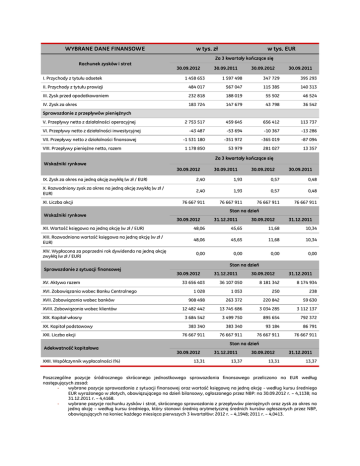 WYBRANE DANE FINANSOWE w tys. zł w tys. EUR Za 3 kwartały kończące się Rachunek zysków i strat 30.09.2012 30.09.2011 30.09.2012 30.09.2011 I. Przychody z tytułu odsetek 1 458 653 1 597 498 347 729 395 293 II. Przychody z tytułu prowizji 484 017 567 047 115 385 140 313 III. Zysk przed opodatkowaniem 232 818 188 019 55 502 46 524 IV. Zysk za okres 183 724 147 679 43 798 36 542 2 753 517 459 645 656 412 113 737 -43 487 -53 694 -10 367 -13 286 -1 531 180 -351 972 -365 019 -87 094 1 178 850 53 979 281 027 13 357 Sprawozdanie z przepływów pieniężnych V. Przepływy netto z działalności operacyjnej VI. Przepływy netto z działalności inwestycyjnej VII. Przepływy netto z działalności finansowej VIII. Przepływy pieniężne netto, razem Za 3 kwartały kończące się Wskaźniki rynkowe 30.09.2012 30.09.2011 30.09.2012 30.09.2011 IX. Zysk za okres na jedną akcję zwykłą (w zł / EUR) 2,40 1,93 0,57 0,48 X. Rozwodniony zysk za okres na jedną akcję zwykłą (w zł / EUR) 2,40 1,93 0,57 0,48 76 667 911 76 667 911 76 667 911 76 667 911 XI. Liczba akcji Wskaźniki rynkowe Stan na dzień 30.09.2012 31.12.2011 30.09.2012 31.12.2011 XII. Wartość księgowa na jedną akcję (w zł / EUR) 48,06 45,65 11,68 10,34 XIII. Rozwodniona wartość księgowa na jedną akcję (w zł / EUR) 48,06 45,65 11,68 10,34 0,00 0,00 0,00 0,00 XIV. Wypłacona za poprzedni rok dywidenda na jedną akcję zwykłą (w zł / EUR) Sprawozdanie z sytuacji finansowej XV. Aktywa razem XVI. Zobowiązania wobec Banku Centralnego XVII. Zobowiązania wobec banków XVIII. Zobowiązania wobec klientów XIX. Kapitał własny XX. Kapitał podstawowy XXI. Liczba akcji Adekwatność kapitałowa XXII. Współczynnik wypłacalności (%) Stan na dzień 30.09.2012 31.12.2011 30.09.2012 31.12.2011 33 656 403 36 107 050 8 181 342 8 174 934 1 028 1 053 250 238 908 498 263 372 220 842 59 630 12 482 442 13 745 686 3 034 285 3 112 137 3 684 542 3 499 750 895 654 792 372 383 340 383 340 93 184 86 791 76 667 911 76 667 911 76 667 911 76 667 911 Stan na dzień 30.09.2012 13,31 31.12.2011 13,37 30.09.2012 13,31 31.12.2011 13,37 Poszczególne pozycje śródrocznego skróconego jednostkowego sprawozdania finansowego przeliczono na EUR według następujących zasad: wybrane pozycje sprawozdania z sytuacji finansowej oraz wartość księgową na jedną akcję - według kursu średniego EUR wyrażonego w złotych, obowiązującego na dzień bilansowy, ogłoszonego przez NBP: na 30.09.2012 r. – 4,1138; na 31.12.2011 r. – 4,4168. wybrane pozycje rachunku zysków i strat, skróconego sprawozdania z przepływów pieniężnych oraz zysk za okres na jedną akcję – według kursu średniego, który stanowi średnią arytmetyczną średnich kursów ogłaszanych przez NBP, obowiązujących na koniec każdego miesiąca pierwszych 3 kwartałów: 2012 r. – 4,1948; 2011 r. – 4,0413.