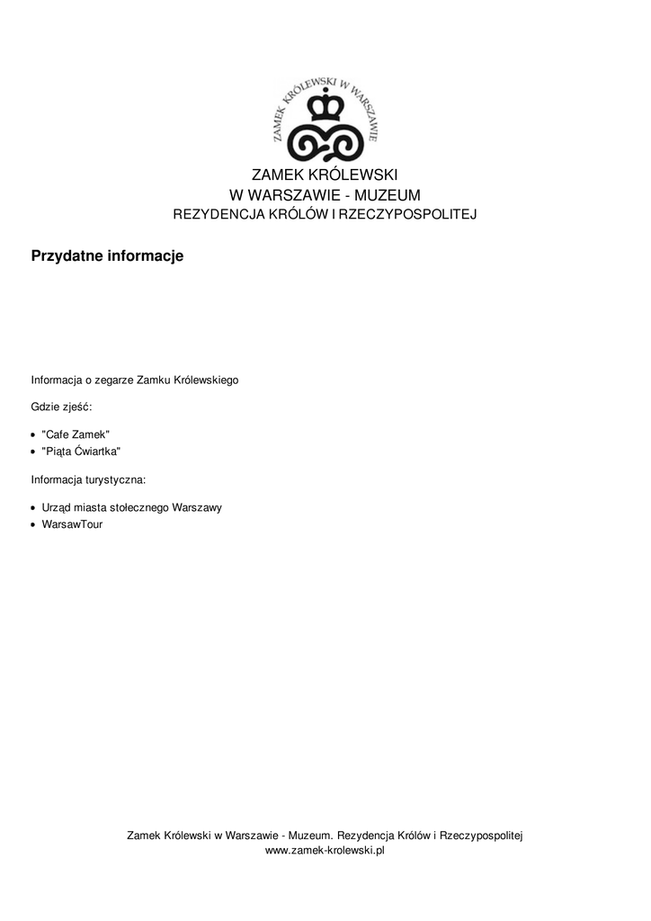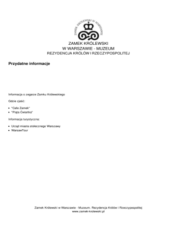 ZAMEK KRÓLEWSKI W WARSZAWIE - MUZEUM REZYDENCJA KRÓLÓW I RZECZYPOSPOLITEJ Przydatne informacje Informacja o zegarze Zamku Królewskiego Gdzie zjeść: "Cafe Zamek" "Piąta Ćwiartka" Informacja turystyczna: Urząd miasta stołecznego Warszawy WarsawTour Zamek Królewski w Warszawie - Muzeum. Rezydencja Królów i Rzeczypospolitej www.zamek-krolewski.pl