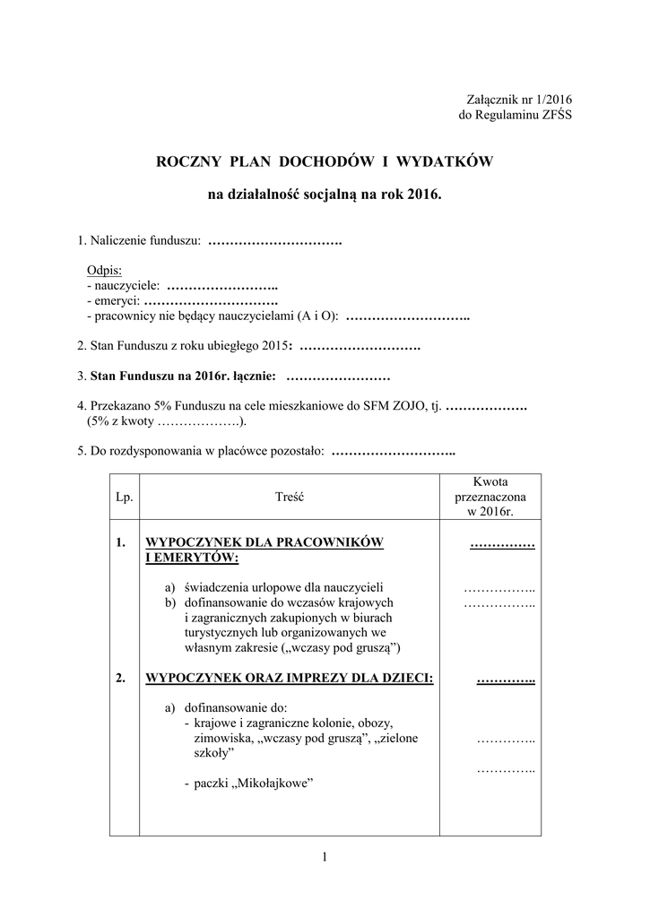 Załącznik nr 1/2016 do Regulaminu ZFŚS ROCZNY PLAN DOCHODÓW I WYDATKÓW na działalność socjalną na rok 2016. 1. Naliczenie funduszu: …………………………. Odpis: - nauczyciele: …………………….. - emeryci: …………………………. - pracownicy nie będący nauczycielami (A i O): ……………………….. 2. Stan Funduszu z roku ubiegłego 2015: ………………………. 3. Stan Funduszu na 2016r. łącznie: …………………… 4. Przekazano 5% Funduszu na cele mieszkaniowe do SFM ZOJO, tj. ………………. (5% z kwoty ……………….). 5. Do rozdysponowania w placówce pozostało: ……………………….. Lp. 1. Kwota przeznaczona w 2016r. Treść WYPOCZYNEK DLA PRACOWNIKÓW I EMERYTÓW: a) świadczenia urlopowe dla nauczycieli b) dofinansowanie do wczasów krajowych i zagranicznych zakupionych w biurach turystycznych lub organizowanych we własnym zakresie („wczasy pod gruszą”) 2. …………… …………….. …………….. WYPOCZYNEK ORAZ IMPREZY DLA DZIECI: ………….. a) dofinansowanie do: - krajowe i zagraniczne kolonie, obozy, zimowiska, „wczasy pod gruszą”, „zielone szkoły” ………….. ………….. - paczki „Mikołajkowe” 1 …………… 3. ZAPOMOGI: a) socjalne b) losowe c) socjalne-okolicznościowe (Boże Narodzenie, Wielkanoc OGÓŁEM: 2 …………. ………….. ………….. …………. Załącznik nr 2/2016 do Regulaminu ZFŚS TABELA WYSOKOŚCI DOPŁAT DO WYPOCZYNKU PRACOWNIKÓW, EMERYTÓW I RENCISTÓW ORAZ DZIECI UPRAWNIONYCH PRACOWNIKÓW ZGODNIE Z KRYTERIUM DOCHODOWYM w roku 2016 Dofinansowanie do wypoczynku Wysokość dochodu na osobę w rodzinie „Zielona szkoła” pracownik i emeryt dziecko do 1300,00 do 1000,00zł do 650,00zł 50% 1301,00 – 1750,00 do 900,00zł do 550,00zł 40% 1751,00 – 2300,00 do 800,00zł do 450,00zł 30% 2301,00 – 2800,00 do 700,00zł do 350,00zł 25% 2801,00 – 3300,00 do 600,00zł do 250,00zł 20% 3301,00 – 5000,00 do 500,00zł do 150,00zł 15% 3 Załącznik nr 3/2016 do Regulaminu ZFŚS TABELA WYSOKOŚCI ZAPOMOGI SOCJALNEJ DLA PRACOWNIKÓW I EMERYTÓW ZGODNIE Z KRYTERIUM DOCHODOWYM w roku 2016 Lp. Wysokość dochodu na osobę w rodzinie Wysokość świadczenia 1. do 1300,00 do 750,00 2. 1301,00 – 1750,00 do 650,00 3. 1751,00 – 2300,00 do 550,00 4. 2301,00 – 2800,00 do 450,00 5. 2801,00 – 3300,00 do 350,00 6. 3301,00 – 5000,00 do 250,00 4 Załącznik nr 4/2016 do Regulaminu ZFŚS TABELA WYSOKOŚCI ZAPOMOGI FINANSOWEJ - LOSOWEJ DLA PRACOWNIKÓW I EMERYTÓW ZGODNIE Z KRYTERIUM DOCHODOWYM w roku 2016 Lp. Wysokość dochodu na osobę w rodzinie Wysokość świadczenia 1. do 1300,00 do 1000,00 2. 1301,00 – 2800,00 do 700,00 3. 2801,00 – 5000,00 do 400,00 5 Załącznik nr 5/2016 do Regulaminu ZFŚS TABELA WYSOKOŚCI ZAPOMOGI SOCJALNEJ-OKOLICZNOŚCIOWEJ DLA PRACOWNIKÓW I EMERYTÓW ZGODNIE Z KRYTERIUM DOCHODOWYM w roku 2016 Lp. Wysokość dochodu na osobę w rodzinie Wysokość świadczenia 1. do 1300,00 do 500,00 2. 1301,00 – 1750,00 do 400,00 3. 1751,00 – 2300,00 do 300,00 4. 2301,00 – 2800,00 do 200,00 5. 2801,00 – 3300,00 do 150,00 6. 3301,00 – 5000,00 do 100,00 6 Załącznik nr 6/2016 do Regulaminu ZFŚS POMOC SOCJALNA W FORMIE PACZEK „MIKOŁAJKOWYCH” DLA DZIECI PRACOWNIKÓW ZGODNIE Z KRYTERIUM DOCHODOWYM w roku 2016 Kwota przeznaczona na zakup paczek „Mikołajkowych” dla dzieci uprawnionych pracowników w roku 2016 wynosi: Wysokość dochodu na osobę w rodzinie Kwota przeznaczona na świadczenie socjalne do 1300,00 Wysokość świadczenia w postaci „paczki mikołajkowej” wynosi 100,00 zł od1301,00 – do 3500,00 Wysokość świadczenia w postaci „paczki mikołajkowej” wynosi 80,00 zł od 3501,00 – 5000,00 Wysokość świadczenia w postaci „paczki mikołajkowej” wynosi 60,00 zł 7