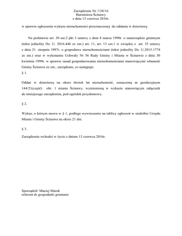 Zarządzenie Nr /138/16 Burmistrza Ścinawy z dnia 13 czerwca