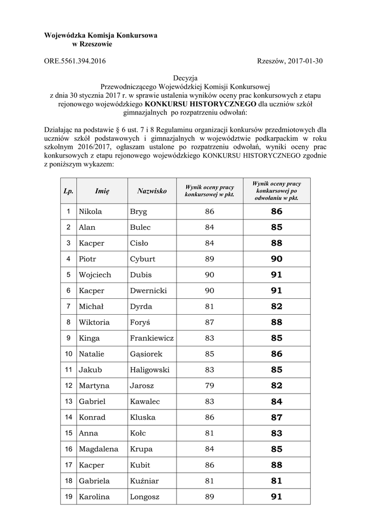 Wojewódzka Komisja Konkursowa w Rzeszowie Rzeszów, 2017-01-30 ORE.5561.394.2016 Decyzja Przewodniczącego Wojewódzkiej Komisji Konkursowej z dnia 30 stycznia 2017 r. w sprawie ustalenia wyników oceny prac konkursowych z etapu rejonowego wojewódzkiego KONKURSU HISTORYCZNEGO dla uczniów szkół gimnazjalnych po rozpatrzeniu odwołań: Działając na podstawie § 6 ust. 7 i 8 Regulaminu organizacji konkursów przedmiotowych dla uczniów szkół podstawowych i gimnazjalnych w województwie podkarpackim w roku szkolnym 2016/2017, ogłaszam ustalone po rozpatrzeniu odwołań, wyniki oceny prac konkursowych z etapu rejonowego wojewódzkiego KONKURSU HISTORYCZNEGO zgodnie z poniższym wykazem: Lp. Imię Nazwisko Wynik oceny pracy konkursowej w pkt. Wynik oceny pracy konkursowej po odwołaniu w pkt. 1 Nikola Bryg 86 86 2 Alan Bulec 84 85 3 Kacper Cisło 84 88 4 Piotr Cyburt 89 90 5 Wojciech Dubis 90 91 6 Kacper Dwernicki 90 91 7 Michał Dyrda 81 82 8 Wiktoria Foryś 87 88 9 Kinga Frankiewicz 83 85 10 Natalie Gąsiorek 85 86 11 Jakub Haligowski 83 85 12 Martyna Jarosz 79 82 13 Gabriel Kawalec 83 84 14 Konrad Kluska 86 87 15 Anna Kołc 81 83 16 Magdalena Krupa 84 85 17 Kacper Kubit 86 88 18 Gabriela Kuźniar 81 81 19 Karolina Longosz 89 91 20 Nikola Majgier 85 86 21 Maciej Marciniec 83 84 22 Katarzyna Markuszka 86 89 23 Weronika Moskwa 86 87 24 Patryk Nieroda 82 82 25 Julia Nowak 86 87 26 Bartłomiej Okińczyc 86 87 27 Krzysztof Pieróg 85 88 28 Katarzyna Proszek 81 82 29 Paulina Rabczak 90 90 30 Julia Siek 84 86 31 Weronika Solarska 87 88 32 Justyna Sroka 82 82 33 Michał Szela 85 86 34 Krystyna Szwedo 88 92 35 Weronika Ślusarczyk 81 82 36 Maksymilian Tabian 84 86 37 Zofia Tetela 86 88 38 Arkadiusz Zając 88 89 39 Aleksandra Zajdel 84 87 40 Jan Zaremba 85 89 41 Andrzej Ziobro 84 87 42 Kacper Ziobro 83 86 43 Gabriela Ziobro 84 85 Przewodniczący WKK Stanisław Fundakowski