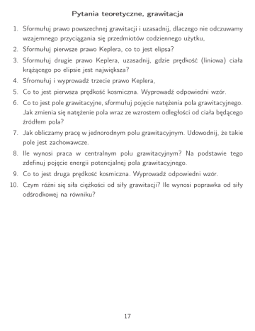 Pytania teoretyczne, grawitacja 1. Sformułuj prawo powszechnej grawitacji i uzasadnij, dlaczego nie odczuwamy wzajemnego przyciągania się przedmiotów codziennego użytku, 2. Sformułuj pierwsze prawo Keplera, co to jest elipsa? 3. Sformułuj drugie prawo Keplera, uzasadnij, gdzie prędkość (liniowa) ciała krążącego po elipsie jest największa? 4. Sfromułuj i wyprowadź trzecie prawo Keplera, 5. Co to jest pierwsza prędkość kosmiczna. Wyprowadź odpowiedni wzór. 6. Co to jest pole grawitacyjne, sformułuj pojęcie natężenia pola grawitacyjnego. Jak zmienia się natężenie pola wraz ze wzrostem odległości od ciała będącego źródłem pola? 7. Jak obliczamy pracę w jednorodnym polu grawitacyjnym. Udowodnij, że takie pole jest zachowawcze. 8. Ile wynosi praca w centralnym polu grawitacyjnym? Na podstawie tego zdefinuj pojęcie energii potencjalnej pola grawitacyjnego. 9. Co to jest druga prędkość kosmiczna. Wyprowadź odpowiedni wzór. 10. Czym różni się siła ciężkości od siły grawitacji? Ile wynosi poprawka od siły odśrodkowej na równiku? 17
