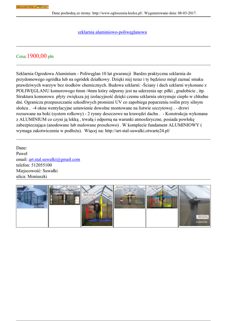 Dane pochodzą ze strony: http://www.ogloszenia-kielce.pl/. Wygenerowano dnia: 08-03-2017. szklarnia aluminiowo-poliwęglanowa Cena:1900,00 pln Szklarnia Ogrodowa Aluminium - Poliwęglan 10 lat gwarancji Bardzo praktyczna szklarnia do przydomowego ogródka lub na ogródek działkowy. Dzięki niej teraz i ty będziesz mógł zaznać smaku prawdziwych warzyw bez środków chemicznych. Budowa szklarni: -Ściany i dach szklarni wykonane z POLIWĘGLANU komorowego 6mm /4mm który odporny jest na uderzenia np: piłki , gradobicie , itp. Struktura komorowa płyty zwiększa jej izolacyjność dzięki czemu szklarnia utrzymuje ciepło w chłodne dni. Ogranicza przepuszczanie szkodliwych promieni UV co zapobiega poparzeniu roślin przy silnym słońcu . -4 okna wentylacyjne ustawienie dowolne montowane na listwie szczytowej . - drzwi rozsuwane na boki (system rolkowy) - 2 rynny deszczowe na krawędzi dachu . - Konstrukcja wykonana z ALUMINIUM co czyni ją lekką , trwałą i odporną na warunki atmosferyczne, posiada powłokę zabezpieczająca (anodowane lub malowane proszkowo) . W komplecie fundament ALUMINIOWY ( wymaga zakotwiczenia w podłożu). Więcej na: http://art-stal-suwalki.otwarte24.pl/ Dane: Paweł email: [email protected] telefon: 512055100 Miejscowość: Suwałki ulica: Moniuszki