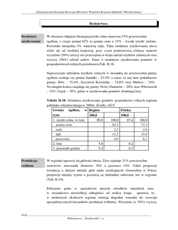 „Zintegrowana Strategia Rozwoju Obszarów Wiejskich Regionu GąbińskoWłocławskiego” Rolnictwo Struktura W obszarze objętym Strategią użytki rolne stanowią 57% powierzchni użytkowania ogółem, z czego ponad 82% to grunty orne a 15% trwałe użytki zielone. Pozostałe niespełna 3% stanowią sady. Taka struktura użytkowania nieco różni się od średniej krajowej, przy czym podstawową różnicę stanowi wyraźnie (39%) niższy niż przeciętnie w kraju udział użytków zielonych oraz wyższy (56%) udział sadów. Dane o strukturze użytkowania gruntów w gospodarstwach rolnych przedstawia Tab. II.18. Najwyższym udziałem użytków rolnych w stosunku do powierzchni gminy ogółem cechuje się gmina Sanniki – 87,9% a zaraz za nią inne południowe gminy: Iłów – 75,4%, Szczawin Kościelny – 74,8% oraz Słubice – 74%. Na drugim końcu znajdują się gminy Nowy Duninów – 20% oraz Włocławek – 32% i Łąck – 38%, gdzie w użytkowaniu gruntów dominują lasy. Tabela II.18. Struktura użytkowania gruntów gospodarstw rolnych regionu gąbińskowłocławskiego w 2004r. Źródło: GUS Grunty ogółem, w Region Polska tym: 100,0 100,0 1. użytki rolne, w tym: grunty orne sady łąki pastwiska 2. lasy 3. pozostałe grunty 89,0 5,6 5,4 100,0 82,3 2,5 11,2 4,0 87,4 6,2 6,3 100,0 77,3 1,6 15,0 6,1 Produkcja W regionie uprawia się głównie zboża. Żyto zajmuje 21% powierzchni roślinna zasiewów, mieszanki zbożowe 19% a pszenica 14%. Takie proporcje świadczą o dużym udziale gleb mało urodzajnych. Generalnie w Polsce proporcje między żytem a pszenicą są dokładnie odwrotne niż w regionie (Tab. II.19). Położenie gmin w sąsiedztwie dużych ośrodków miejskich oraz w stosunkowo niewielkiej odległości od stolicy kraju, sprawia, że w niektórych okolicach regionu istnieją dogodne warunki do rozwoju specjalistycznych kierunków produkcji roślinnej. Wyraźnie (o 70%) wyższy 114___________________________________________________________________________________ Wykonawca: „Środowisko” s.c. „Zintegrowana Strategia Rozwoju Obszarów Wiejskich Regionu GąbińskoWłocławskiego” niż przeciętnie w kraju jest udział warzyw gruntowych, natomiast udział truskawek jest aż sześciokrotnie wyższy od średniej krajowej. Przestrzenne rozmieszczenie produkcji pszenicy i buraków cukrowych, a więc upraw o wysokich wymaganiach glebowych, przedstawia Rys. II.23. Tego typu produkcja jest wyraźnie skoncentrowana w dwóch najdalej na północ leżących, kujawskich gminach regionu, tj. w gminach Włocławek i Kowal. W trzeciej kujawskiej gminie tj, w Baruchowie, oraz w gminie Szczawin Kościelny, łączny udział pszenicy i buraków jest zbliżony do średniej krajowej. W pozostałych ośmiu gminach jest on niewielki lub znikomy. Warto zauważyć, że wysoki udział pszenicy i buraków na terenie lesistej gminy Włocławek świadczy o tym, jak ostra jest tutaj granica pomiędzy zalesionymi glebami bielicowymi i rdzawymi a żyznymi glebami brunatnymi zachodniej części gminy. Tabela II.19. Udział ważniejszych roślin w powierzchni zasiewów w regionie i w Polsce w 2002 r. Źródło: GUS, PSR 2002 Uprawa pszenica ogółem żyto mieszanki zbożowe ogółem ziemniaki buraki cukrowe warzywa gruntowe truskawki Region Polska % 13,7 22,4 21,3 14,5 18,7 12,7 6,3 7,5 3,8 2,8 2,7 1,6 2,5 0,4 Rysunek II.23. Rozmieszczenie upraw pszenicy i buraków cukrowych w regionie w 2002 r [% ogólnej powierzchni zasiewów]. Źródło GUS, PSP 2002 ___________________________________________________________________________________ 115 Wykonawca: „Środowisko” s.c. „Zintegrowana Strategia Rozwoju Obszarów Wiejskich Regionu GąbińskoWłocławskiego” Rozmieszczenie mało wymagających upraw żyta i ziemniaków przedstawia Rys. II.24. Niemal w całym regionie udział tych roślin w zasiewach jest wyższy niż przeciętnie w kraju a w położonej niemal w całości na wydmach gminie Nowy Duninów wynosi on ponad 50%. Uprawa warzyw gruntowych z jednej strony wymaga dobrych warunków glebowych a z drugiej – możliwości zbytu. Dlatego tradycyjnie uprawy warzyw skupiają się w pobliżu dużych miast. W regionie gąbińsko włocławskim takim zagłębiem warzywnym jest gmina Włocławek na północy i gmina Iłów na południu, natomiast ze względu na złe gleby prawie zupełnie nie uprawia się warzyw w gminach centralnych, sąsiadujących z Płockiem i Gostyninem (Rys. II.25). Rysunek II.24. Rozmieszczenie upraw żyta i ziemniaków w regionie w 2002 r [% ogólnej powierzchni zasiewów]. Źródło GUS, PSP 2002 116___________________________________________________________________________________ Wykonawca: „Środowisko” s.c. „Zintegrowana Strategia Rozwoju Obszarów Wiejskich Regionu GąbińskoWłocławskiego” Rysunek II.25. Rozmieszczenie upraw warzyw gruntowych w regionie w 2002 r [% ogólnej powierzchni zasiewów]. Źródło GUS, PSP 2002 Bodajże najsłynniejszym rolnym produktem eksportowym regionu, a ściślej biorąc, jego południowej części, są truskawki. Tutaj znajdują one bardzo dogodne warunki dzięki obecności lekkich, ale dość żyznych i zasobnych w materię organiczną gleb murszowatych, powstałych na osuszonych zalewiskach Wisły. Warunki glebowe, bliskość stolicy i wysoki poziom samoorganizacji rolników (truskawkowa giełda sannicka) sprawiają, że w niektórych gminach powierzchnia upraw truskawek aż piętnastokrotnie przekracza średnią krajową (Rys. II.26). ___________________________________________________________________________________ 117 Wykonawca: „Środowisko” s.c. „Zintegrowana Strategia Rozwoju Obszarów Wiejskich Regionu GąbińskoWłocławskiego” Na terenach czterech południowych gmin z uprawami truskawek często sąsiadują sady. W Gąbinie, Sannikach i Słubicach ich udział w użytkowaniu gruntów wynosi ponad 2% a w Iłowie aż 11%. Rysunek II.26. Rozmieszczenie upraw truskawek w regionie w 2002 r [% ogólnej