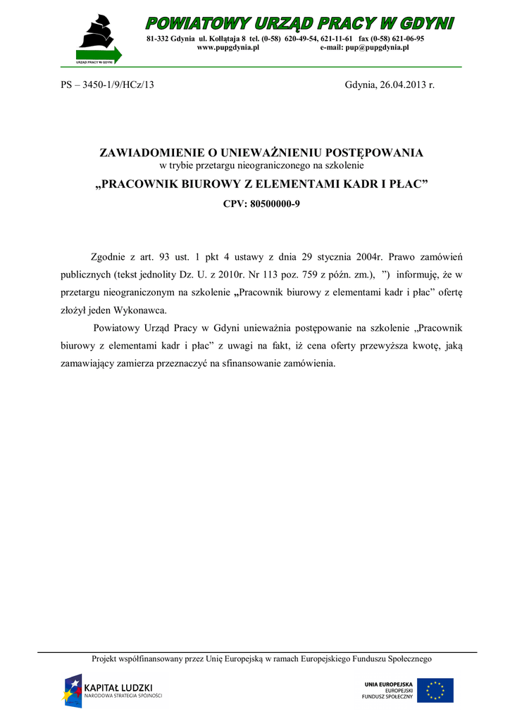 81-332 Gdynia ul. Kołłątaja 8 tel. (0-58) 620-49-54, 621-11-61 fax (0-58) 621-06-95 www.pupgdynia.pl e-mail: [email protected] PS – 3450-1/9/HCz/13 Gdynia, 26.04.2013 r. ZAWIADOMIENIE O UNIEWAŻNIENIU POSTĘPOWANIA w trybie przetargu nieograniczonego na szkolenie „PRACOWNIK BIUROWY Z ELEMENTAMI KADR I PŁAC” CPV: 80500000-9 Zgodnie z art. 93 ust. 1 pkt 4 ustawy z dnia 29 stycznia 2004r. Prawo zamówień publicznych (tekst jednolity Dz. U. z 2010r. Nr 113 poz. 759 z późn. zm.), ”) informuję, że w przetargu nieograniczonym na szkolenie „Pracownik biurowy z elementami kadr i płac” ofertę złożył jeden Wykonawca. Powiatowy Urząd Pracy w Gdyni unieważnia postępowanie na szkolenie „Pracownik biurowy z elementami kadr i płac” z uwagi na fakt, iż cena oferty przewyższa kwotę, jaką zamawiający zamierza przeznaczyć na sfinansowanie zamówienia. Projekt współfinansowany przez Unię Europejską w ramach Europejskiego Funduszu Społecznego