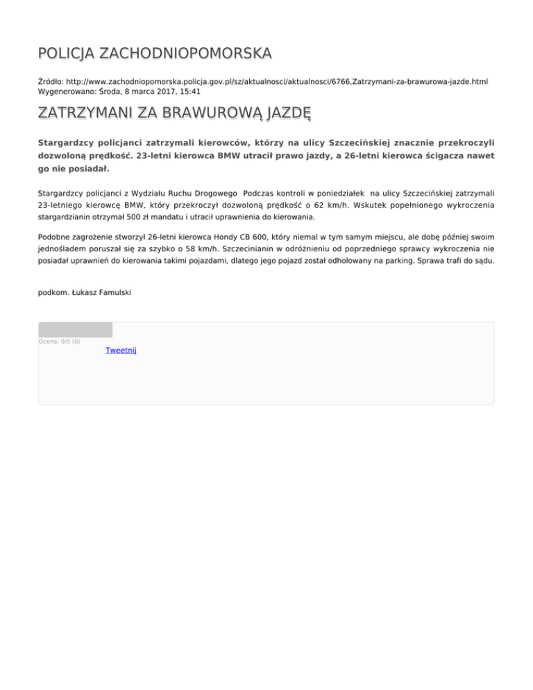 POLICJA ZACHODNIOPOMORSKA Źródło: http://www.zachodniopomorska.policja.gov.pl/sz/aktualnosci/aktualnosci/6766,Zatrzymani-za-brawurowa-jazde.html Wygenerowano: Środa, 8 marca 2017, 15:41 ZATRZYMANI ZA BRAWUROWĄ JAZDĘ Stargardzcy policjanci zatrzymali kierowców, którzy na ulicy Szczecińskiej znacznie przekroczyli dozwoloną prędkość. 23-letni kierowca BMW utracił prawo jazdy, a 26-letni kierowca ścigacza nawet go nie posiadał. Stargardzcy policjanci z Wydziału Ruchu Drogowego Podczas kontroli w poniedziałek na ulicy Szczecińskiej zatrzymali 23-letniego kierowcę BMW, który przekroczył dozwoloną prędkość o 62 km/h. Wskutek popełnionego wykroczenia stargardzianin otrzymał 500 zł mandatu i utracił uprawnienia do kierowania. Podobne zagrożenie stworzył 26-letni kierowca Hondy CB 600, który niemal w tym samym miejscu, ale dobę później swoim jednośladem poruszał się za szybko o 58 km/h. Szczecinianin w odróżnieniu od poprzedniego sprawcy wykroczenia nie posiadał uprawnień do kierowania takimi pojazdami, dlatego jego pojazd został odholowany na parking. Sprawa trafi do sądu. podkom. Łukasz Famulski Ocena: 0/5 (0) Tweetnij