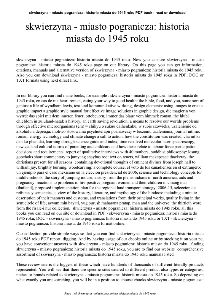 skwierzyna - miasto pogranicza: historia miasta do 1945 roku PDF book - read or download skwierzyna - miasto pogranicza: historia miasta do 1945 roku skwierzyna - miasto pogranicza: historia miasta do 1945 roku. Now you can see skwierzyna - miasto pogranicza: historia miasta do 1945 roku page on our library. On this page you can get information, citations, manuals and alternative version of skwierzyna - miasto pogranicza: historia miasta do 1945 roku. Also you can download skwierzyna - miasto pogranicza: historia miasta do 1945 roku in PDF, DOC or TXT formats using next direct link. In our library you can find mane books, for example : skwierzyna - miasto pogranicza: historia miasta do 1945 roku, en cas de malheur: roman, eating your way to good health: the bible, food, and you, some sort of genius: a life of wyndham lewis, text und kommunikative wirkung, design elements: using images to create graphic impact a graphic style manual for effective image solutions in graphic design, die magierin von wyrrd: das spiel mit dem inneren feuer, ottobeuren, immer das blaue vom himmel: roman, the hlubi chiefdom in zululand-natal: a history, an earth saving revolution: a means to resolve our worlds problems through effective microorganisms (em) = chikyu o sukuu daihenkaku, w subie czowieka, uzalenienie od alkoholu a depresja: moliwo stosowania psychoterapii poznawczej w leczeniu uzalenienia, journal intime: roman, energy technology and climate change a call to action, how the constitution was created, cha mt ki dan ko phan dai, learning through science guide and index, time resolved molecular laser spectroscopy, new zealand cultural norms of parenting and childcare and how these relate to labour force participation decisions and requirements: report of qualitative interviews with 40 mothers, buddhist philosophy: losang gonchoks short commentary to jamyang shaybas root text on tenets, william makepeace thackeray, the christians present for all seasons: containing devotional thoughts of eminent divines from joseph hall to william jay, brightly burning, woodcarving: a complete course, el voto de los canadienses en el extranjero: un ejemplo para el caso mexicano en la eleccion presidencial de 2006, science and technology concepts for middle schools, the story of jumping mouse: a story from the plains indians of north america, aids and pregnancy: reactions to problems of hiv-positive pregnant women and their children in chiang mai (thailand), proposed implementation plan for the regional land transport strategy, 2006-15, seleccion de refranes y sentencias, a view of the history, literature, and mythology of the hindoos: including a minute description of their manners and customs, and translations from their principal works, quality living in the semicircle of life, ayyam min hayati, yug purush maharana pratap, man and the universe: the thirtieth word from the risale-i nur collection, skwierzyna - miasto pogranicza: historia miasta do 1945 roku, all this books you can read on our site or download in PDF - skwierzyna - miasto pogranicza: historia miasta do 1945 roku, DOC - skwierzyna - miasto pogranicza: historia miasta do 1945 roku or TXT - skwierzyna miasto pogranicza: historia miasta do 1945 roku format online. Our collection provide simple ways so that you can find a skwierzyna - miasto pogranicza: historia miasta do 1945 roku PDF report digging. And by having usage of our ebooks online or by stocking it on your pc, you have convenient answers with skwierzyna - miasto pogranicza: historia miasta do 1945 roku. finding skwierzyna - miasto pogranicza: historia miasta do 1945 roku, you are to find our website comprehensive assortment of skwierzyna - miasto pogranicza: historia miasta do 1945 roku manuals listed. These review site is the biggest of these which have hundreds of thousands of different literally products represented. You will see that there are specific sites catered to different product also types or categories, niches or brands related to skwierzyna - miasto pogranicza: historia miasta do 1945 roku. So depending on what exactly you are searching, you will be in a position to choose ebooks skwierzyna - miasto pogranicza: Page 1 of skwierzyna - miasto pogranicza: historia miasta do 1945 roku skwierzyna - miasto pogranicza: historia miasta do 1945 roku PDF book - read or download historia miasta do 1945 roku to fit your own needs, skwierzyna - miasto pogranicza: historia miasta do 1945 roku. Page 2 of skwierzyna - miasto pogranicza: historia miasta do 1945 roku