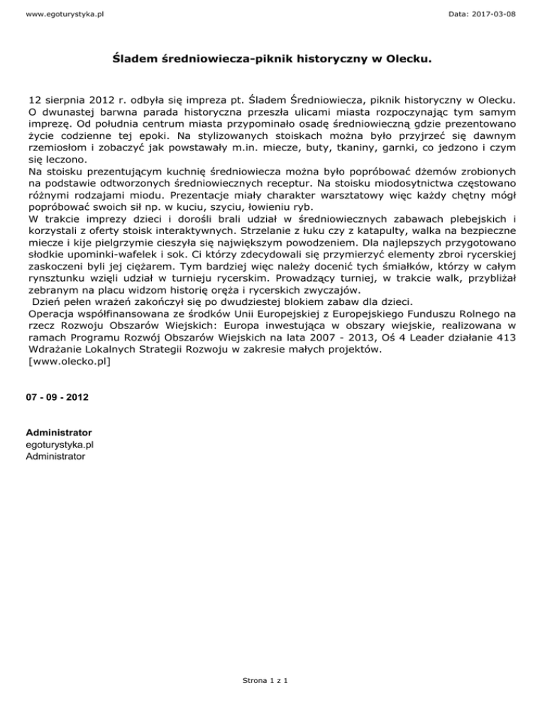 www.egoturystyka.pl Data: 2017-03-08 Śladem średniowiecza-piknik historyczny w Olecku. 12 sierpnia 2012 r. odbyła się impreza pt. Śladem Średniowiecza, piknik historyczny w Olecku. O dwunastej barwna parada historyczna przeszła ulicami miasta rozpoczynając tym samym imprezę. Od południa centrum miasta przypominało osadę średniowieczną gdzie prezentowano życie codzienne tej epoki. Na stylizowanych stoiskach można było przyjrzeć się dawnym rzemiosłom i zobaczyć jak powstawały m.in. miecze, buty, tkaniny, garnki, co jedzono i czym się leczono. Na stoisku prezentującym kuchnię średniowiecza można było popróbować dżemów zrobionych na podstawie odtworzonych średniowiecznych receptur. Na stoisku miodosytnictwa częstowano różnymi rodzajami miodu. Prezentacje miały charakter warsztatowy więc każdy chętny mógł popróbować swoich sił np. w kuciu, szyciu, łowieniu ryb. W trakcie imprezy dzieci i dorośli brali udział w średniowiecznych zabawach plebejskich i korzystali z oferty stoisk interaktywnych. Strzelanie z łuku czy z katapulty, walka na bezpieczne miecze i kije pielgrzymie cieszyła się największym powodzeniem. Dla najlepszych przygotowano słodkie upominki-wafelek i sok. Ci którzy zdecydowali się przymierzyć elementy zbroi rycerskiej zaskoczeni byli jej ciężarem. Tym bardziej więc należy docenić tych śmiałków, którzy w całym rynsztunku wzięli udział w turnieju rycerskim. Prowadzący turniej, w trakcie walk, przybliżał zebranym na placu widzom historię oręża i rycerskich zwyczajów. Dzień pełen wrażeń zakończył się po dwudziestej blokiem zabaw dla dzieci. Operacja współfinansowana ze środków Unii Europejskiej z Europejskiego Funduszu Rolnego na rzecz Rozwoju Obszarów Wiejskich: Europa inwestująca w obszary wiejskie, realizowana w ramach Programu Rozwój Obszarów Wiejskich na lata 2007 - 2013, Oś 4 Leader działanie 413 Wdrażanie Lokalnych Strategii Rozwoju w zakresie małych projektów. [www.olecko.pl] 07 - 09 - 2012 Administrator egoturystyka.pl Administrator Strona 1 z 1