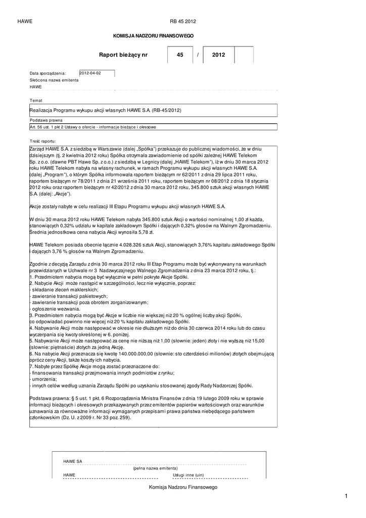 HAWE RB 45 2012 KOMISJA NADZORU FINANSOWEGO Raport bieżący nr Data sporządzenia: 45 / 2012 2012-04-02 Skrócona nazwa emitenta HAWE Temat Realizacja Programu wykupu akcji własnych HAWE S.A. (RB-45/2012) Podstawa prawna Art. 56 ust. 1 pkt 2 Ustawy o ofercie - informacje bieżące i okresowe Treść raportu: Zarząd HAWE S.A. z siedzibą w Warszawie (dalej „Spółka”) przekazuje do publicznej wiadomości, że w dniu dzisiejszym (tj. 2 kwietnia 2012 roku) Spółka otrzymała zawiadomienie od spółki zależnej HAWE Telekom Sp. z o.o. (dawne PBT Hawe Sp. z o.o.) z siedzibą w Legnicy (dalej „HAWE Telekom”), iż w dniu 30 marca 2012 roku HAWE Telekom nabyła na własny rachunek, w ramach Programu wykupu akcji własnych HAWE S.A. (dalej „Program”), o którym Spółka informowała raportem bieżącym nr 62/2011 z dnia 29 lipca 2011 roku, raportem bieżącym nr 78/2011 z dnia 21 września 2011 roku, raportem bieżącym nr 08/2012 z dnia 18 stycznia 2012 roku oraz raportem bieżącym nr 42/2012 z dnia 30 marca 2012 roku, 345.800 sztuk akcji własnych HAWE S.A. (dalej: „Akcje”). Akcje zostały nabyte w celu realizacji III Etapu Programu wykupu akcji własnych HAWE S.A. W dniu 30 marca 2012 roku HAWE Telekom nabyła 345.800 sztuk Akcji o wartości nominalnej 1,00 zł każda, stanowiących 0,32% udziału w kapitale zakładowym Spółki i dających 0,32% głosów na Walnym Zgromadzeniu. Średnia jednostkowa cena nabycia Akcji wynosiła 5,78 zł. HAWE Telekom posiada obecnie łącznie 4.028.326 sztuk Akcji, stanowiących 3,76% kapitału zakładowego Spółki i dających 3,76 % głosów na Walnym Zgromadzeniu. Zgodnie z decyzją Zarządu z dnia 30 marca 2012 roku III Etap Programu może być wykonywany na warunkach przewidzianych w Uchwale nr 3 Nadzwyczajnego Walnego Zgromadzenia z dnia 23 marca 2012 roku, tj.: 1. Przedmiotem nabycia mogą być wyłącznie w pełni pokryte Akcje Spółki. 2. Nabycie Akcji może nastąpić w szczególności, lecz nie wyłącznie, poprzez: - składanie zleceń maklerskich; - zawieranie transakcji pakietowych; - zawieranie transakcji poza obrotem zorganizowanym; - ogłoszenie wezwania. 3. Przedmiotem nabycia mogą być Akcje w liczbie nie większej niż 20 % ogólnej liczby akcji Spółki, co odpowiadać powinno nie więcej niż 20 % kapitału zakładowego Spółki. 4. Nabywanie Akcji może następować w okresie nie dłuższym niż do dnia 30 czerwca 2014 roku lub do czasu wyczerpania się kwoty określonej w 6. poniżej. 5. Nabywanie Akcji może następować za cenę nie niższą niż 1,00 (słownie: jeden) złoty i nie wyższą niż 15,00 (słownie: piętnaście) złotych za jedną Akcję. 6. Na nabycie Akcji przeznacza się kwotę 140.000.000,00 (słownie: sto czterdzieści milionów) złotych obejmującą oprócz ceny Akcji, także koszty ich nabycia. 7. Nabyte przez Spółkę Akcje mogą zostać przeznaczone do: - finansowania transakcji przejmowania innych podmiotów z rynku; - umorzenia; - innych celów według uznania Zarządu Spółki po uzyskaniu stosowanej zgody Rady Nadzorczej Spółki. Podstawa prawna: § 5 ust. 1 pkt. 6 Rozporządzenia Ministra Finansów z dnia 19 lutego 2009 roku w sprawie informacji bieżących i okresowych przekazywanych przez emitentów papierów wartościowych oraz warunków uznawania za równoważne informacji wymaganych przepisami prawa państwa niebędącego państwem członkowskim (Dz. U. z 2009 r. Nr 33 poz. 259). HAWE SA (pełna nazwa emitenta) HAWE Usługi inne (uin) Komisja Nadzoru Finansowego 1 HAWE RB 45 2012 (skróc ona nazwa emitenta) 00-486 (sektor wg. klasyfikacji GPW w W-wie) Warszawa (kod pocztowy) (miejscowość) ul. Franc iszka Nullo 2 (ulica) (numer) 022 501 55 00 022 501 55 01 (telefon) (fax) [email protected] www.hawesa.pl (e-mail) (www) 527-23-80-580 015197353 (NIP) (REGON) PODPISY OSÓB REPREZENTUJĄCYCH SPÓŁKĘ Data Imię i Nazwisko Stanowisko/Funkc ja 2012-04-02 Jerzy Karney Prezes Zarządu 2012-04-02 Krzysztof Rybka Wiceprezes Zarządu Podpis Komisja Nadzoru Finansowego 2
