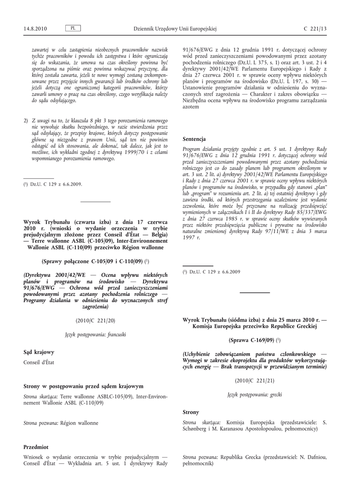 14.8.2010 PL Dziennik Urzędowy Unii Europejskiej zawartej w celu zastąpienia nieobecnych pracowników nazwisk tychże pracowników i powodu ich zastępstwa i które ograniczają się do wskazania, że umowa na czas określony powinna być sporządzona na piśmie oraz powinna wskazywać przyczynę, dla której została zawarta, jeżeli te nowe wymogi zostaną zrekompen sowane przez przyjęcie innych gwarancji lub środków ochrony lub jeżeli dotyczą one ograniczonej kategorii pracowników, którzy zawarli umowy o pracę na czas określony, czego weryfikacja należy do sądu odsyłającego. 2) Z uwagi na to, że klauzula 8 pkt 3 tego porozumienia ramowego nie wywołuje skutku bezpośredniego, w razie stwierdzenia przez sąd odsyłający, że przepisy krajowe, których dotyczy postępowanie główne są niezgodne z prawem Unii, sąd ten nie powinien odstąpić od ich stosowania, ale dokonać, tak dalece, jak jest to możliwe, ich wykładni zgodnej z dyrektywą 1999/70 i z celami wspomnianego porozumienia ramowego. (1) Dz.U. C 129 z 6.6.2009. Wyrok Trybunału (czwarta izba) z dnia 17 czerwca 2010 r. (wnioski o wydanie orzeczenia w trybie prejudycjalnym złożone przez Conseil d’État — Belgia) — Terre wallonne ASBL (C-105/09), Inter-Environnement Wallonie ASBL (C-110/09) przeciwko Région wallonne C 221/13 91/676/EWG z dnia 12 grudnia 1991 r. dotyczącej ochrony wód przed zanieczyszczeniami powodowanymi przez azotany pochodzenia rolniczego (Dz.U. L 375, s. 1) oraz art. 3 ust. 2 i 4 dyrektywy 2001/42/WE Parlamentu Europejskiego i Rady z dnia 27 czerwca 2001 r. w sprawie oceny wpływu niektórych planów i programów na środowisko (Dz.U. L 197, s. 30) — Ustanowienie programów działania w odniesieniu do wyzna czonych stref zagrożenia — Charakter i zakres obowiązku — Niezbędna ocena wpływu na środowisko programu zarządzania azotem Sentencja Program działania przyjęty zgodnie z art. 5 ust. 1 dyrektywy Rady 91/676/EWG z dnia 12 grudnia 1991 r. dotyczącej ochrony wód przed zanieczyszczeniami powodowanymi przez azotany pochodzenia rolniczego jest co do zasady planem lub programem określonym w art. 3 ust. 2 lit. a) dyrektywy 2001/42/WE Parlamentu Europejskiego i Rady z dnia 27 czerwca 2001 r. w sprawie oceny wpływu niektórych planów i programów na środowisko, w przypadku gdy stanowi „plan” lub „program” w rozumieniu art. 2 lit. a) tej ostatniej dyrektywy i gdy zawiera środki, od których przestrzegania uzależnione jest wydanie zezwolenia, które może być przyznane na realizację przedsięwzięć wymienionych w załącznikach I i II do dyrektywy Rady 85/337/EWG z dnia 27 czerwca 1985 r. w sprawie oceny skutków wywieranych przez niektóre przedsięwzięcia publiczne i prywatne na środowisko naturalne zmienionej dyrektywą Rady 97/11/WE z dnia 3 marca 1997 r. (Sprawy połączone C-105/09 i C-110/09) (1) (Dyrektywa 2001/42/WE — Ocena wpływu niektórych planów i programów na środowisko — Dyrektywa 91/676/EWG — Ochrona wód przed zanieczyszczeniami powodowanymi przez azotany pochodzenia rolniczego — Programy działania w odniesieniu do wyznaczonych stref zagrożenia) (2010/C 221/20) (1) Dz.U. C 129 z 6.6.2009 Wyrok Trybunału (siódma izba) z dnia 25 marca 2010 r. — Komisja Europejska przeciwko Republice Greckiej Język postępowania: francuski Sąd krajowy Conseil d’État (Sprawa C-169/09) (1) (Uchybienie zobowiązaniom państwa członkowskiego — Wymogi w zakresie ekoprojektu dla produktów wykorzystują cych energię — Brak transpozycji w przewidzianym terminie) (2010/C 221/21) Strony w postępowaniu przed sądem krajowym Język postępowania: grecki Strona skarżąca: Terre wallonne ASBLC-105/09), Inter-Environ nement Wallonie ASBL (C-110/09) Strony Strona pozwana: Région wallonne Strona skarżąca: Komisja Europejska (przedstawiciele: S. Schønberg i M. Karanasou Apostolopoulou, pełnomocnicy) Przedmiot Wniosek o wydanie orzeczenia w trybie prejudycjalnym — Conseil d’État — Wykładnia art. 5 ust. 1 dyrektywy Rady Strona pozwana: Republika Grecka (przedstawiciel: N. Dafniou, pełnomocnik)