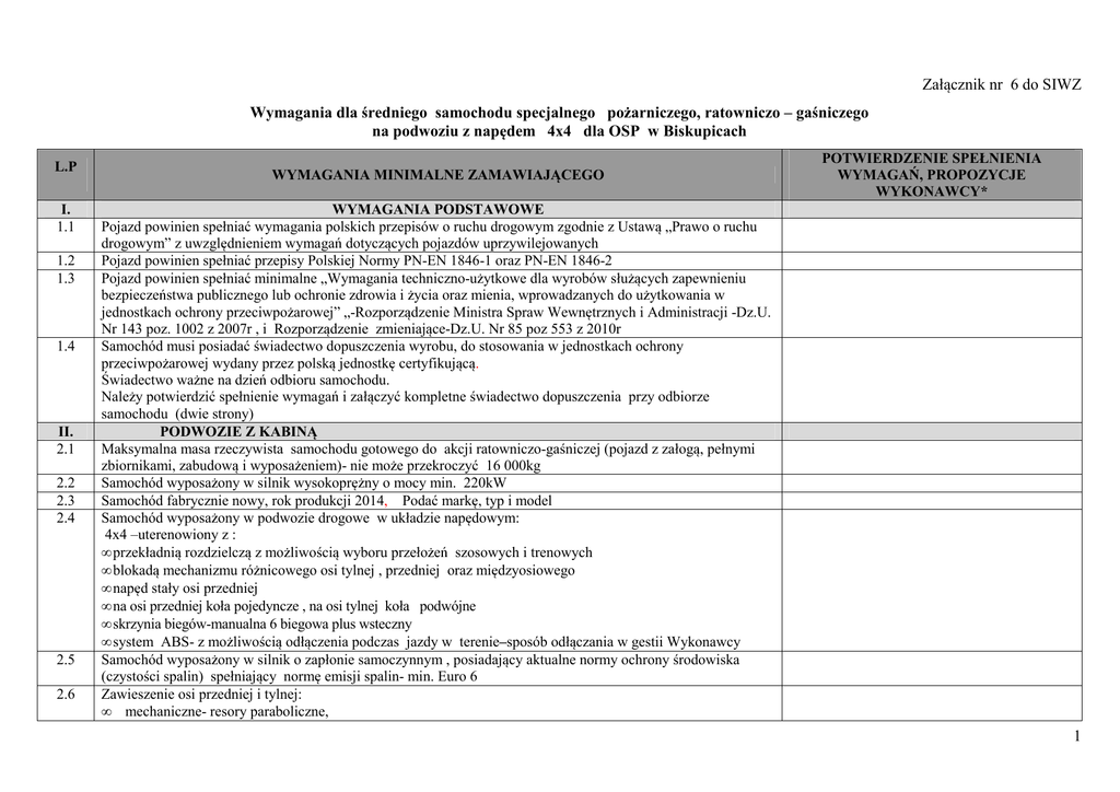 Załącznik nr 6 do SIWZ Wymagania dla średniego samochodu specjalnego pożarniczego, ratowniczo – gaśniczego na podwoziu z napędem 4x4 dla OSP w Biskupicach L.P I. 1.1 1.2 1.3 1.4 II. 2.1 2.2 2.3 2.4 2.5 2.6 WYMAGANIA MINIMALNE ZAMAWIAJĄCEGO POTWIERDZENIE SPEŁNIENIA WYMAGAŃ, PROPOZYCJE WYKONAWCY* WYMAGANIA PODSTAWOWE Pojazd powinien spełniać wymagania polskich przepisów o ruchu drogowym zgodnie z Ustawą „Prawo o ruchu drogowym” z uwzględnieniem wymagań dotyczących pojazdów uprzywilejowanych Pojazd powinien spełniać przepisy Polskiej Normy PN-EN 1846-1 oraz PN-EN 1846-2 Pojazd powinien spełniać minimalne „Wymagania techniczno-użytkowe dla wyrobów służących zapewnieniu bezpieczeństwa publicznego lub ochronie zdrowia i życia oraz mienia, wprowadzanych do użytkowania w jednostkach ochrony przeciwpożarowej” „-Rozporządzenie Ministra Spraw Wewnętrznych i Administracji -Dz.U. Nr 143 poz. 1002 z 2007r , i Rozporządzenie zmieniające-Dz.U. Nr 85 poz 553 z 2010r Samochód musi posiadać świadectwo dopuszczenia wyrobu, do stosowania w jednostkach ochrony przeciwpożarowej wydany przez polską jednostkę certyfikującą. Świadectwo ważne na dzień odbioru samochodu. Należy potwierdzić spełnienie wymagań i załączyć kompletne świadectwo dopuszczenia przy odbiorze samochodu (dwie strony) PODWOZIE Z KABINĄ Maksymalna masa rzeczywista samochodu gotowego do akcji ratowniczo-gaśniczej (pojazd z załogą, pełnymi zbiornikami, zabudową i wyposażeniem)- nie może przekroczyć 16 000kg Samochód wyposażony w silnik wysokoprężny o mocy min. 220kW Samochód fabrycznie nowy, rok produkcji 2014, Podać markę, typ i model Samochód wyposażony w podwozie drogowe w układzie napędowym: 4x4 –uterenowiony z : • przekładnią rozdzielczą z możliwością wyboru przełożeń szosowych i trenowych • blokadą mechanizmu różnicowego osi tylnej , przedniej oraz międzyosiowego • napęd stały osi przedniej • na osi przedniej koła pojedyncze , na osi tylnej koła podwójne • skrzynia biegów-manualna 6 biegowa plus wsteczny • system ABS- z możliwością odłączenia podczas jazdy w terenie–sposób odłączania w gestii Wykonawcy Samochód wyposażony w silnik o zapłonie samoczynnym , posiadający aktualne normy ochrony środowiska (czystości spalin) spełniający normę emisji spalin- min. Euro 6 Zawieszenie osi przedniej i tylnej: • mechaniczne- resory paraboliczne, 1 L.P 2.7 2.8 WYMAGANIA MINIMALNE ZAMAWIAJĄCEGO POTWIERDZENIE SPEŁNIENIA WYMAGAŃ, PROPOZYCJE WYKONAWCY* • amortyzatory teleskopowe, • stabilizatory przechyłów Kabina fabrycznie jednomodułowa czterodrzwiowa, zapewniająca dostęp do silnika, w układzie miejsc 1+1+4 (siedzenia przodem do kierunku jazdy), Kabina wyposażona w : • klimatyzację • indywidualne oświetlenie do czytania mapy dla pozycji dowódcy • niezależny układ ogrzewania, umożliwiający ogrzewanie kabiny przy wyłączonym silniku • reflektor pogorzeliskowy na zewnątrz kabiny z gniazdem elektrycznym z prawej strony • zewnętrzną osłonę przeciwsłoneczną z przodu dachu kabiny • elektrycznie sterowane szyby po stronie kierowcy i dowódcy • elektrycznie sterowane lusterka po stronie kierowcy i dowódcy • lusterka zewnętrzne, elektrycznie podgrzewane(główne i szerokokątne) • lusterko rampowe-krawężnikowe z prawej strony • lusterko rampowe- dojazdowe, przednie • poręcz do trzymania w tylnej części kabiny • wywietrznik dachowy Kabina wyposażona dodatkowo w: • uchwyty na 4 aparaty oddechowe, umieszczone w oparciach tylnych siedzeń. ( uchwyty na aparaty nie powinny zmniejszać przestrzeni załogi i ograniczać powierzchni siedziska) • odblokowanie każdego aparatu indywidualnie • dźwignia odblokowująca o konstrukcji uniemożliwiającej przypadkowe odblokowanie np. w czasie hamowania pojazdu • w przypadku gdy aparaty nie są przewożone, wstawienie oparć w miejscu mocowania aparatów • schowek pod siedzeniami w tylnej części kabiny Fotele wyposażone w bezwładnościowe pasy bezpieczeństwa. Siedzenia pokryte materiałem łatwozmywalnym, o zwiększonej odporności na ścieranie. Fotele wyposażone w zagłówki. Fotel dla kierowcy: • z pneumatyczną regulacją wysokości, • z regulacją dostosowania do ciężaru ciała • z regulacją odległości całego fotela • z regulacją pochylenia oparcia Fotel dla pasażera(dowódcy): 2 L.P 2.9 2.10 2.11 WYMAGANIA MINIMALNE ZAMAWIAJĄCEGO POTWIERDZENIE SPEŁNIENIA WYMAGAŃ, PROPOZYCJE WYKONAWCY* • z mechaniczną regulacją wysokości • z regulacją odległości całego fotela • z regulacją pochylenia oparcia W kabinie kierowcy zamontowane następujące urządzenia: • radiotelefon samochodowy o parametrach min: częstotliwość VHF 136-174 MHz, moc 1÷25 W, odstęp międzykanałowy 12,5 kHz • radio z odtwarzaczem • podest do ładowarek radiostacji przenośnych i latarek z wyłącznikiem. Dodatkowe urządzenia zamontowane w kabinie: • sygnalizacja otwarcia żaluzji skrytek i podestów, z alarmem dźwiękowym i słownym • sygnalizacja informująca o wysunięciu masztu, z alarmem dźwiękowym i słownym • Zamawiający wymaga alarmu słownego o treści: „otwarte żaluzje”, „otwarte podesty”, „wysunięty maszt”, „załączone gniazdo ładowania” • sygnalizacja załączonego gniazda ładowania i stan naładowania akumulatorów • główny wyłącznik oświetlenia skrytek • sterowanie zraszaczami • sterowanie niezależnym ogrzewaniem kabiny i przedziału pracy autopompy • kontrolka włączenia autopompy • wskaźnik poziomu wody w zbiorniku • wskaźnik poziomu środka pianotwórczego w zbiorniku • wskaźnik niskiego ciśnienia • wskaźnik wysokiego ciśnienia Pojazd wyposażony w urządzenie sygnalizacyjno- ostrzegawcze (akustyczne i świetlne), pojazdu uprzywilejowanego. Urządzenie akustyczne powinno umożliwiać podawanie komunikatów słownych. Głośnik lub g