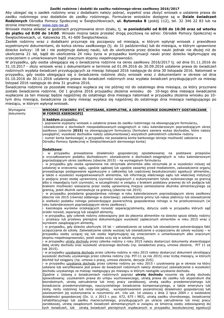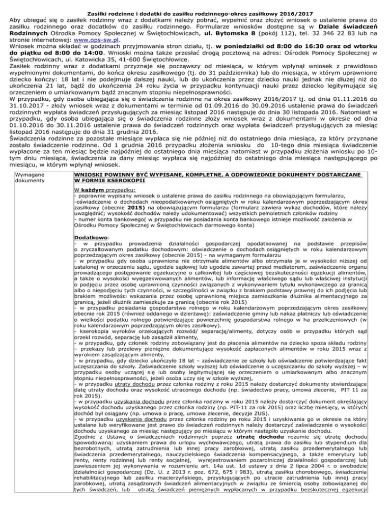 Zasiłki rodzinne i dodatki do zasiłku rodzinnego-okres zasiłkowy 2016/2017 Aby ubiegać się o zasiłek rodzinny wraz z dodatkami należy pobrać, wypełnić oraz złożyć wniosek o ustalenie prawa do zasiłku rodzinnego oraz dodatków do zasiłku rodzinnego. Formularze wniosków dostępne są w Dziale świadczeń Rodzinnych Ośrodka Pomocy Społecznej w Świętochłowicach, ul. Bytomska 8 (pokój 112), tel. 32 346 22 83 lub na stronie internetowej: www.ops-sw.pl. Wniosek można składać w godzinach przyjmowania stron działu, tj. w poniedziałki od 8:00 do 16:30 oraz od wtorku do piątku od 8:00 do 14:00. Wnioski można także przesłać drogą pocztową na adres: Ośrodek Pomocy Społecznej w Świętochłowicach, ul. Katowicka 35, 41-600 Świętochłowice. Zasiłek rodzinny wraz z dodatkami przyznaje się począwszy od miesiąca, w którym wpłynął wniosek z prawidłowo wypełnionymi dokumentami, do końca okresu zasiłkowego (tj. do 31 października) lub do miesiąca, w którym uprawnione dziecko kończy: 18 lat i nie podejmuje dalszej nauki, lub do ukończenia przez dziecko nauki jednak nie dłużej niż do ukończenia 21 lat, bądź do ukończenia 24 roku życia w przypadku kontynuacji nauki przez dziecko legitymujące się orzeczeniem o umiarkowanym bądź znacznym stopniu niepełnosprawności. W przypadku, gdy osoba ubiegająca się o świadczenia rodzinne na okres zasiłkowy 2016/2017 tj. od dnia 01.11.2016 do 31.10.2017 - złoży wniosek wraz z dokumentami w terminie od 01.09.2016 do 30.09.2016 ustalenie prawa do świadczeń rodzinnych wypłata świadczeń przysługujących za miesiąc listopad 2016 następuje do dnia 30 listopada 2016. Natomiast w przypadku, gdy osoba ubiegająca się o świadczenia rodzinne złoży wniosek wraz z dokumentami w okresie od dnia 01.10.2016 do 30.11.2016 ustalenie prawa do świadczeń rodzinnych oraz wypłata świadczeń przysługujących za miesiąc listopad 2016 następuje do dnia 31 grudnia 2016. Świadczenia rodzinne za pozostałe miesiące wypłaca się nie później niż do ostatniego dnia miesiąca, za który przyznane zostało świadczenie rodzinne. Od 1 grudnia 2016 przypadku złożenia wniosku do 10-tego dnia miesiąca świadczenie wypłacone za ten miesiąc będzie najpóźniej do ostatniego dnia miesiąca natomiast w przypadku złożenia wniosku po 10tym dniu miesiąca, świadczenia za dany miesiąc wypłaca się najpóźniej do ostatniego dnia miesiąca następującego po miesiącu, w którym wpłynął wniosek. Wymagane dokumenty WNIOSKI POWINNY BYĆ WYPISANE, KOMPLETNE, A ODPOWIEDNIE DOKUMENTY DOSTARCZANE W FORMIE KSEROKOPII W każdym przypadku: - poprawnie wypisany wniosek o ustalenie prawa do zasiłku rodzinnego na obowiązującym formularzu, -oświadczenie o dochodach nieopodatkowanych osiągniętych w roku kalendarzowym poprzedzającym okres zasiłkowy (obecnie 2015) na obowiązującym formularzu (formularz zawiera wykaz dochodów, które należy uwzględnić; wysokość dochodów należy udokumentować) wszystkich pełnoletnich członków rodziny - numer konta bankowego( w przypadku nie posiadania konta bankowego istnieje możliwość założenia w Ośrodku Pomocy Społecznej w Świętochłowicach darmowego konta) Dodatkowo: - w przypadku prowadzenia działalności gospodarczej opodatkowanej na podstawie przepisów o zryczałtowanym podatku dochodowym: oświadczenie o dochodach osiągniętych w roku kalendarzowym poprzedzającym okres zasiłkowy (obecnie 2015) - na wymaganym formularzu - w przypadku gdy osoba uprawniona nie otrzymała alimentów albo otrzymała je w wysokości niższej od ustalonej w orzeczeniu sądu, ugodzie sądowej lub ugodzie zawartej przed mediatorem, zaświadczenie organu prowadzącego postępowanie egzekucyjne o całkowitej lub częściowej bezskuteczności egzekucji alimentów, a także o wysokości wyegzekwowanych alimentów, lub informację właściwego sądu lub właściwej instytucji o podjęciu przez osobę uprawnioną czynności związanych z wykonywaniem tytułu wykonawczego za granicą albo o niepodjęciu tych czynności, w szczególności w związku z brakiem podstawy prawnej do ich podjęcia lub brakiem możliwości wskazania przez osobę uprawnioną miejsca zamieszkania dłużnika alimentacyjnego za granicą, jeżeli dłużnik zamieszkuje za granicą (obecnie rok 2015) - w przypadku posiadania gospodarstwa rolnego w roku kalendarzowym poprzedzającym okres zasiłkowy obecnie rok 2015 (również oddanego w dzierżawę): zaświadczenie gminy lub nakaz płatniczy lub oświadczenie o wielkości podatku rolnego potwierdzające powierzchnię gospodarstwa rolnego w ha przeliczeniowych (w roku kalendarzowym poprzedzającym okres zasiłkowy). - kserokopia wyroków orzekających rozwód/ separację/alimenty, dotyczy osób w przypadku których sąd orzekł rozwód, separację lub zasądził alimenty, - w przypadku, gdy członek rodziny zobowiązany jest do płacenia alimentów na dziecko spoza składu rodziny – przekazy lub przelewy pieniężne dokumentujące wysokość zapłaconych alimentów w roku 2015 wraz z wyrokiem zasądzającym alimenty, - w przypadku, gdy dziecko ukończyło 18 lat – zaświadczenie ze szkoły lub oświadczenie potwierdzające fakt uczęszczania do szkoły. Zaświadczenie szkoły wyższej lub oświadczenie o uczęszczaniu do szkoły wyższej – w przypadku osoby uczącej się lub osoby legitymującej się orzeczeniem o umiarkowanym albo znacznym stopniu niepełnosprawności, jeżeli osoba uczy się w szkole wyższej, - w przypadku utraty dochodu przez członka rodziny z roku 2015 należy dostarczyć dokumenty stwierdzające datę utraty dochodu oraz wysokość utraconego dochodu (np. świadectwo pracy, umowa zlecenie, PIT 11 za rok 2015). - w przypadku uzyskania dochodu przez członka rodziny w roku 2015 należy dostarczyć dokument określający wysokość dochodu uzyskanego przez członka rodziny (np. PIT-11 za rok 2015) oraz liczbę miesięcy, w których dochód b