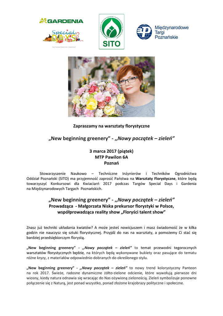 Zapraszamy na warsztaty florystyczne „New beginning greenery” - ,,Nowy początek – zieleń” 3 marca 2017 (piątek) MTP Pawilon 6A Poznań Stowarzyszenie Naukowo – Techniczne Inżynierów i Techników Ogrodnictwa Oddział Poznański (SITO) ma przyjemność zaprosić Państwa na Warsztaty Florystyczne, które będą towarzyszyć Konkursowi dla Kwiaciarń 2017 podczas Targów Special Days i Gardenia na Międzynarodowych Targach Poznańskich. „New beginning greenery” - ,,Nowy początek – zieleń” Prowadząca - Małgorzata Niska prekursor florystyki w Polsce, współprowadząca reality show „Floryści talent show” Znasz już techniki układania kwiatów? A może jesteś nowicjuszem i masz świadomość że w kilka godzin nie nauczysz się sztuki florystycznej. Przyjdź do nas na warsztaty, a pomożemy Ci stać się bardziej przedsiębiorczym florystą. „New beginning greenery” - ,,Nowy początek – zieleń” to temat przewodni tegorocznych warsztatów florystycznych będzie, na których będą wykonywane bukiety oraz pasujące do tematu różne kryzy, z materiałów odpowiednio dobranych do określonego stylu. „New beginning greenery” - ,,Nowy początek – zieleń” to nowy trend kolorystyczny Panteon na rok 2017. Świeże, radosne dynamiczne żółto-zielone odcienie, które wywołują pierwsze dni wiosny, kiedy natura odnawia się wracając do Nas ożywioną zielonością. Zieleń symbolizuje ponowne połączenie się z Naturą, jest ponad wszystko, ponad złożone krajobrazy polityczne i społeczne. Prowadzący Warsztaty Florystyczne Małgorzata Niska Prekursor florystyki w Polsce, współprowadząca reality show „Floryści talent show”. Współautorka podstaw programowych w zawodzie Florysta. Założycielka pierwszej autorskiej szkoły florystycznej w kraju. Mistrzyni Polski 1998 w układaniu kwiatów, Międzynarodowy Mistrz Polski 2000 r. Jako pierwszy florysta brała udział we Florystycznych Mistrzostwach Europy w 2000 r. zajmując 8 miejsce oraz w Pucharze Świata w 2002 r. 11 miejsce. Termin 3 marca 2017 r., godz. 11.00-15.00 Miejsce Międzynarodowe Targi Poznańskie, Pawilon 6A Cena opłata za udział w Warsztatach Florystycznych wynosi 190 zł + 23%VAT Płatność za Warsztaty Florystyczne: Należność prosimy przelać na konto SITO: PKO BP I O/Poznań 35 1020 4027 0000 1202 0031 1654 z dopiskiem: udział w Warsztatach Florystycznych. Uczestnicy otrzymają zaświadczenie o udziale w warsztatach oraz fakturę za opłacony udział. Organizator Stowarzyszenie Naukowo-Techniczne Inżynierów i Techników Ogrodnictwa Oddział Poznański ul. Wieniawskiego 5/9 61-712 Poznań Zgłoszenie udziału w Warsztatach Florystycznych należy przesłać pocztą na adres Stowarzyszenie Naukowo-Techniczne Inżynierów i Techników Ogrodnictwa Oddział Poznański ul. Wieniawskiego 5/9 61-712 Poznań lub drogą elektroniczną [email protected] Termin nadsyłania zgłoszeń: do 17 lutego 2017 roku Kontakt: Biuro SITO o/Poznań ul. Wieniawskiego 5/9 61-712 Poznań tel. 61 853 67 16 [email protected]
