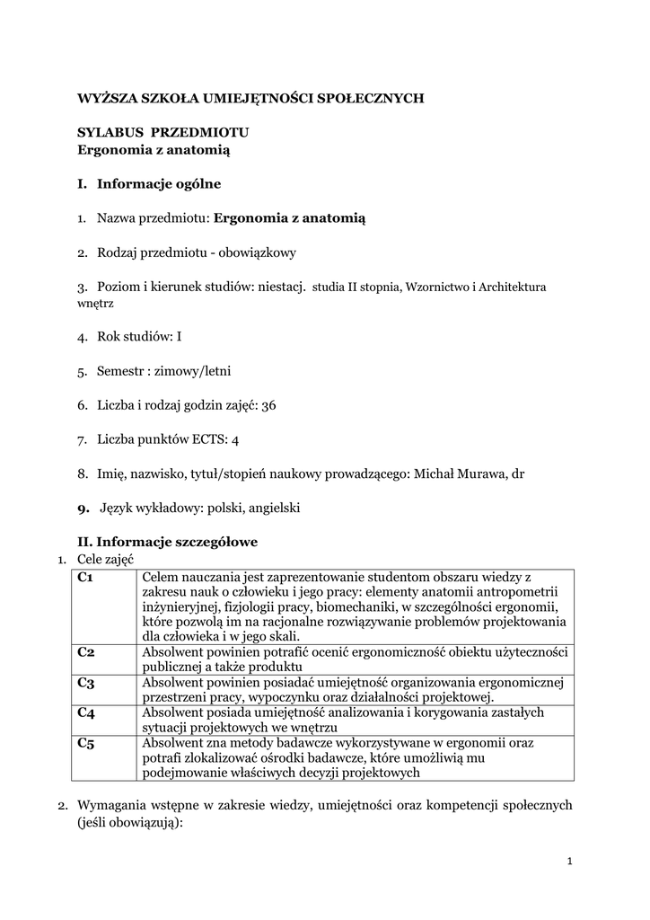 WYŻSZA SZKOŁA UMIEJĘTNOŚCI SPOŁECZNYCH SYLABUS PRZEDMIOTU Ergonomia z anatomią I. Informacje ogólne 1. Nazwa przedmiotu: Ergonomia z anatomią 2. Rodzaj przedmiotu - obowiązkowy 3. Poziom i kierunek studiów: niestacj. studia II stopnia, Wzornictwo i Architektura wnętrz 4. Rok studiów: I 5. Semestr : zimowy/letni 6. Liczba i rodzaj godzin zajęć: 36 7. Liczba punktów ECTS: 4 8. Imię, nazwisko, tytuł/stopień naukowy prowadzącego: Michał Murawa, dr 9. Język wykładowy: polski, angielski II. Informacje szczegółowe 1. Cele zajęć C1 Celem nauczania jest zaprezentowanie studentom obszaru wiedzy z zakresu nauk o człowieku i jego pracy: elementy anatomii antropometrii inżynieryjnej, fizjologii pracy, biomechaniki, w szczególności ergonomii, które pozwolą im na racjonalne rozwiązywanie problemów projektowania dla człowieka i w jego skali. C2 Absolwent powinien potrafić ocenić ergonomiczność obiektu użyteczności publicznej a także produktu C3 Absolwent powinien posiadać umiejętność organizowania ergonomicznej przestrzeni pracy, wypoczynku oraz działalności projektowej. C4 Absolwent posiada umiejętność analizowania i korygowania zastałych sytuacji projektowych we wnętrzu C5 Absolwent zna metody badawcze wykorzystywane w ergonomii oraz potrafi zlokalizować ośrodki badawcze, które umożliwią mu podejmowanie właściwych decyzji projektowych 2. Wymagania wstępne w zakresie wiedzy, umiejętności oraz kompetencji społecznych (jeśli obowiązują): 1 Studenci przed rozpoczęciem nauki przedmiotu powinni posiadać ugruntowaną wiedzę z zakresu podstaw fizyki i biologii 3. Efekty kształcenia w zakresie wiedzy, umiejętności oraz kompetencji społecznych Efekty kształcenia w odniesieniu do wiedzy Symbol Opis efektów kształcenia efektu kształcenia Ma szczegółową wiedzę w zakresie dotyczącym obszarów sztuki i EK1 nauki niezbędną do formułowania i rozwiązywania złożonych zagadnień w zakresie dyscyplin artystycznych właściwych dla studiowanego kierunku studiów Wykazuje zrozumienie wzajemnych relacji pomiędzy EK2 teoretycznymi i praktycznymi aspektami studiowanego kierunku studiów oraz wykorzystuje tę wiedzę dla dalszego artystycznego rozwoju Efekty kształcenia w odniesieniu do umiejętności Symbol Opis efektów kształcenia efektu kształcenia Umie podejmować samodzielnie decyzje odnośnie do EK3 projektowania i realizacji prac artystycznych Jest przygotowana do współdziałania z innymi osobami w EK4 ramach prac zespołowych i jest zdolna do podjęcia wiodącej roli w takich zespołach Posiada umiejętność przygotowania rozbudowanych prac EK5 pisemnych i wystąpień ustnych, dotyczących zagadnień szczegółowych związanych ze studiowanym kierunkiem studiów i specjalnością, z wykorzystaniem podstawowych ujęć teoretycznych, a także różnych źródeł Efekty kształcenia w odniesieniu do kompetencji społecznych Symbol efektu kształcenia EK6 4. Treści programowe Symbol treści programowych TP1 Opis efektów kształcenia Posiada umiejętność krytycznej oceny Opis treści programowych Odniesienie do efektów kształcenia dla przedmiotu (symbol efektów) Praktyczne zastosowanie metod badawczych w EK1, EK2,EK3 2 ergonomii. TP2 Anatomii układu ruchu człowieka. TP3 Biomechanika kręgosłupa. EK1, EK2, EK5 EK1, EK2 TP4 Biomechaniczne aspekty postawy ciała. EK1, EK2 TP5 Biomechaniczne aspekty pozycji siedzącej. EK1, EK2 TP6 Krytyczna analiza różnych typów siedzisk. EK1, EK2,EK6 TP7 Ergonomia stanowiska pracy. EK1, EK2,EK6 TP8 Metodyka projektowania stanowisk pracy. ergonomicznego EK1, EK2,EK6 TP9 Krytyczna analiza różnych stanowisk pracy. TP10 Ergonomia a osoby starsze i niepełnosprawne. TP11 Analiza barier architektonicznych w obiektach EK1, EK2,EK3, użyteczności publicznej. EK4, TP12 Aktualne trendy w niepełnosprawnych. EK1, EK2, EK4,EK6 EK1, EK2,EK6 EK5,EK6 ergonomii dla osób EK1, EK2, EK6 5. Literatura podstawowa: Batogowska A. (1998) Podstawy ergonomii. Wyd. WSP w Olsztynie, Olsztyn. Fiell Ch., Grandjean E. (1978) Ergonomia Mieszkania. Aspekty fizjologiczne i psychologiczne w projektowaniu. Wyd. Arkady. Warszawa. Ewa Górska, Edwin Tytyk(1996) Ergonomia w projektowaniu stanowisk pracy Warszawa: Oficyna Wydawnicza Politechniki Warszawskiej. Jabłoński J. (2006) Ergonomia produktu Ergonomiczne zasady projektowania produktów. Kania J. (1980) Metody ergonomiczne. PWE, Warszawa. Konarska Maria (2001) Ergonomia pracy biurowej, Warszawa CIOP. Mc Cormick E.J. (1957) Antropotechnika. Przystosowanie konstrukcji maszyn i urządzeń do człowieka. Wyd. NOT, Warszawa. Mayer-Bohe W. (1998) Budownictwo dla osób starszych i niepełnosprawnych. Arkady. Warszawa. Neufert E. (2000) Podręcznik Projektowania architektoniczno-budowlanego. Arkady, Warszawa. Rozporządzenie (1998) Rozporządzenie Ministra Gospodarki Przestrzennej i Budownictwa z dnia 14 grudnia 1994r. W sprawie warunków technicznych, jakim powinny odpowiadać budynki i ich usytuowanie. Aktualizacja 1998r. 3 Rozporządzenie (2002) Rozporządzenie Ministra Infrastruktury z dnia 12 kwietnia 2002 r. w sprawie warunków technicznych, jakimi powinny odpowiadać budynki i ich usytuowanie. Dziennik Ustaw Rzeczypospolitej Polskiej Nr 75. Warszawa, 15 czerwca 2002 r. Stępowski M. Siedziska. Wydawnictwo Związkowe CRZZ. Warszawa Tytyk E. (2001) Projektowanie ergonomiczne. PWN. Warszawa-Poznań. Ustawa (1998) Ustawa z dnia 7 lipca 1994r. Prawo budowlane. Aktualizacja 1998r. dodatkowa: Fiell P. (1997) 1000 Chairs. Taschen. Grandjean E. (1980) Fitting the task to the Man. An ergonomic approach. Taylor&Francis Ltd. London. Kuldschun H., Rossmann E.(1980) Budownictwo dla upośledzonych fizycznie. Arkady. Warszawa. Skaradzińska M. (1991) Vademecum Projektanta. Problemy osób niepełnosprawnych. 3. Mieszkanie i jego wyposażenie. Inst. Wzorn. Przemysłowego, Warszawa. Wykowska M. Ergonomia. Wydanie internetowe 6. Informacja o przewidywanej możliwości wykorzystania e-
