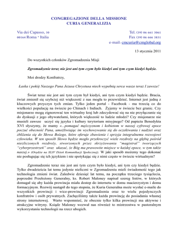 CONGREGAZIONE DELLA MISSIONE CURIA GENERALIZIA Via dei Capasso, 30 00164 Roma – Italia Tel. (39) 06 661 3061 Fax (39) 06 666 3831 e-mail: [email protected] 13 stycznia 2011 Do wszystkich członków Zgromadzenia Misji Zgromadzenie teraz nie jest ani tym czym było kiedyś ani tym czym kiedyś będzie. Moi drodzy Konfratrzy, Łaska i pokój Naszego Pana Jezusa Chrystusa niech wypełnią serca wasze teraz I zawsze! Świat teraz nie jest ani tym czym był kiedyś, ani tym czym kiedyś będzie. Bracia, świat zmienił się szybciej niż większość z nas mogła to przewidzieć. Internet jest jedną z kluczowych przyczyn tych zmian. Tylko jeden portal - Facebook - ma trzecią co do wielkości populację na świecie po Chinach i Indiach. Żyjemy w świecie bez granic. Czy misjonarze mogą zignorować ten wirtualny kraj lub zdecydować się na nie przyłączanie się do dyskusji z jego obywatelami, których większość to ludzie młodzi? Czy misjonarze nie musieli zawsze uczyć się języka i kultury terytorium misyjnego? Od papieża Benedykta XVI słyszymy, że mamy «...pomagać mężczyznom i kobietom w naszej cyfrowej epoce poczuć obecność Pana, umożliwiając im wychowywanie się do oczekiwania i nadziei oraz zbliżenia się do Słowa Bożego, które oferuje zbawienie i sprzyja integralnemu rozwojowi człowieka. W ten sposób Słowo będzie mogło przekroczyć wiele rozdroży na głębię pośród niezliczonych rozdroży, stworzonych przez skrzyżowania “magistral” tworzących “cyberprzestrzeń” oraz ukazać, że Bóg ma prawowite miejsce w każdej epoce, w tym także naszej.» (Orędzie na XLIV Dzień Komunikacji Społecznej). W jaki sposób możemy tego dokonać nie posługując się ich językiem i nie spotykając się z nimi często w świecie wirtualnym? Zgromadzenie teraz nie jest ani tym czym było kiedyś, ani tym czy kiedyś będzie. Tylko dwadzieścia lat temu jedynie nieliczni w Zgromadzeniu mieli świadomość tego jak technologia zmieni świat. Zaledwie dziesięć lat temu, na początku trzeciego tysiąclecia, poprzedni Przełożony Generalny, ks. Robert Maloney napisał szereg listów, w których domagał się aby każda prowincja miała dostep do internetu w domu macierzystym i domu formacyjnym. Rozwój nastąpił do tego stopnia, że Kuria Generalna może wysłać e-maile do wszystkich prowincji i wice-prowincji Zgromadzenia oraz to wielu pojedynczych konfratrów i osób prywatnych. Zachęciliśmy także każda prowincję do posiadania własnej strony internetowej. Warto wspomnieć, że obecnie tylko kilka prowincji ma aktywne i atrakcyjne witryny. Ksiądz Maloney wezwał nas również to mistrzostwa w pastoralnym wykorzystaniu technologii na rzecz ubogich. Do waszej refleksji, moi bracia, muszę przedstawić dwa pytania. Po pierwsze, jak różny będzie świat za sześć lat? Czy nam się to podoba czy nie technologia będzie coraz bardziej utkana w tkaninie naszego życia, a nawet w życiu najuboższych wśród nas. Po drugie, czy będziemy przygotowania do posługi w takim świecie? Linie Działania Konwentu Generalnego 2010 udzielają nam wskazówek skupiając się na: 1) Formacji -- przez zachętę dla Konfratrów do ukształtowania nastawienia i rozwoju umiejętności niezbędnych w duszpasterstwie w ciągu najbliższych sześciu lat; 2) Rekonfiguracji -- umożliwiając usprawnienie naszych struktur i procesów administracyjnych; 3) Dialogu -- poszerzając nasze horyzonty na odkrycie nowych potrzeb i form współpracy przy posłudze i ewangelizacji; 4) Kreatywności -- odważnie odpowiadając na nowe potrzeby świata bez granic; 5) Zmianie Systemowej -- nakierowanej na przyczyny ubóstwa. Każdy z tych celów może zostać osiągnięty przy wykorzystaniu internetu i technologii. Czy możemy wykorzystać nasze wincentyńskie zasoby technologiczne aby: • pracować wspólnie z innymi, przede wszystkim z członkami Rodziny Wincentyńskiej a ponadto, służąc ubogim i badając przyczyny ubóstwa? • Starać się o granty na utworzenie centrów edukacji komputerowej w najuboższych krajach? Mieliśmy taki projekt pilotażowy w Afryce, w szczegółach oparty na komputerach I centrach komputerowych, ale z powodu braku zaplecza finansowego projekt nie został rozwinięty. Było jednak osiem czy dziewięć krajów z naszych prowincji w Afryce zainteresowanych wprowadzeniem tych środków rozwoju jak narzędzi pomocnych w edukacji a tym samym czasie do ewangelizacji. • Nadal szkolić Konfratrów w technologii komputerowej? Wiem o pojedynczych Konfratrach w całym Zgromadzeniu, którzy interesują się tego typu technologia, są dobrze wyposażeni i rozwijają się. Dobrym przykładem jest ks. Aidan Rooney w Boliwii. W Boliwii ma on możliwość rozwijania technologii w dużym zakresie na potrzeby diecezji oraz w służbie ubogim którym on sam i osoby w tamtej misji posługują. • Wypracować metody dzięki którym starsi Konfratrzy mogliby pomóc w służbie ubogim przy pomocy technologii komputerowej? Musimy dokonać pewnego przeglądu i podjąć konkretne kroki aby: • Każda prowincja miała atrakcyjną stronę internetową zwłaszcza dla młodych i często uaktualnianą. Bez wątpienia wymaga to zaangażowania się osób. A także zaangażowania, które pozwoli jednemu lub wielu Konfratrom dotrzeć do grupy ludzi przy pomocy tej zaawansowanej technologii. 2 2%4.$5'6"@";2'0.'.$%'0D.'7.@@$#40&'1.$525*'4#7/$64#;'012'52@4#"%&?'-12'34540.%'.9'L$2%0 =.%026'012'5"6'#2D5'01"0'.#2'F"$;102%'.9':1"%40&'6426'"5'"'%25$/0'.9'012'2"%01B$"C2'"#6'" "5'4#J$%26?'-12'=%.I4#74"/'1.$52'.9'012'F"$;102%5'D"5'"/5.'7.@=/202/&'6250%.&26?'G"@4/425 .#9%2%25'1"I2'"/5.'/.50'0124%'1.@25? Na poziomie międzynarodowym jesteśmy gotowi do rozwinięcia tego typu szkoleń. • Postaramy się, na tyle na ile możliwe, pomóc Konfratrom aby mogli być wyposażeni "@'D%404#;'#.D'0.'51"%2'012'%29/2704.#5'9%.@'012'O2#2%"/':.$#74/'@2204#;'0145'@.%#4# w te środki ewangelizacji. $%=.52'.9'012'@