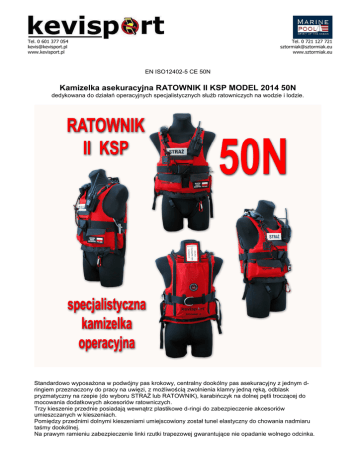 Tel. 0 601 377 054 [email protected] www.kevisport.pl Tel. 0 721 127 721 [email protected] www.sztormiak.eu EN ISO12402-5 CE 50N Kamizelka asekuracyjna RATOWNIK II KSP MODEL 2014 50N dedykowana do działań operacyjnych specjalistycznych służb ratowniczych na wodzie i lodzie. Standardowo wyposażona w podwójny pas krokowy, centralny dookólny pas asekuracyjny z jednym dringiem przeznaczony do pracy na uwięzi, z możliwością zwolnienia klamry jedną ręką, odblask pryzmatyczny na rzepie (do wyboru STRAŻ lub RATOWNIK), karabińczyk na dolnej pętli troczącej do mocowania dodatkowych akcesoriów ratowniczych. Trzy kieszenie przednie posiadają wewnątrz plastikowe d-ringi do zabezpieczenie akcesoriów umieszczanych w kieszeniach. Pomiędzy przednimi dolnymi kieszeniami umiejscowiony został tunel elastyczny do chowania nadmiaru taśmy dookólnej. Na prawym ramieniu zabezpieczenie linki rzutki trapezowej gwarantujące nie opadanie wolnego odcinka. Tel. 0 601 377 054 [email protected] www.kevisport.pl Tel. 0 721 127 721 [email protected] www.sztormiak.eu Opis: 6 kieszeni odpływowych na: śruby lodowe, latarkę, rzutkę, radio VHF, telefon wodoodporny w tym dwie duże funkcjonalne kieszenie na np. rękawiczki, nóż. Na plecach znajduje się dodatkowa siódma kieszeń odpływowa na rzutkę ratowniczą (dedykowana rzutka trapezowa). Tunel na przewód spiralny mikrofonogłośnika. Kilka uchwytów do troczenia dodatkowych elementów wyposażenia. Dostępne rozmiary: L, XL, XXL Dostępne kolory: czerwony Możliwość zamówienia barwnej plakietki haftowanej z rzepem zawierającej imię, nazwisko i narodowość użytkownika (+40 zł brutto). Przedstawione na ilustracji: rzutka trapezowa, plakietka haftowana, śruba lodowa, radio, mikrofonogłośnik oraz automatyczne światło sygnalizacyjne są dostępne osobno za dopłatą.