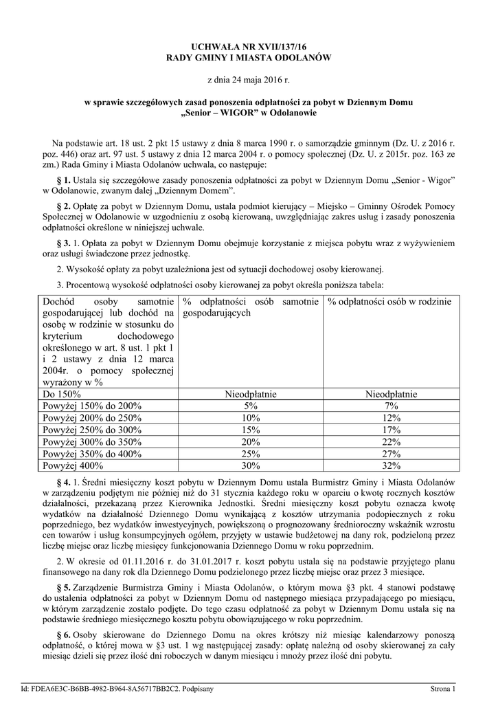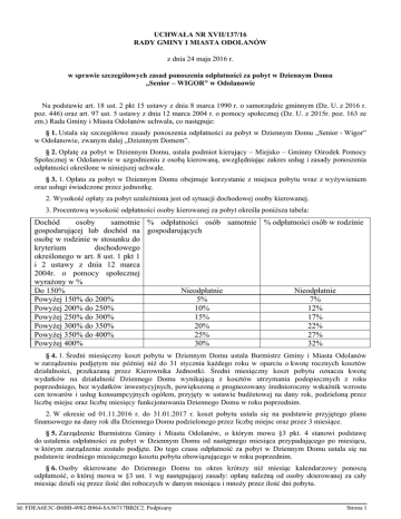 UCHWAŁA NR XVII/137/16 RADY GMINY I MIASTA ODOLANÓW z dnia 24 maja 2016 r. w sprawie szczegółowych zasad ponoszenia odpłatności za pobyt w Dziennym Domu „Senior – WIGOR” w Odolanowie Na podstawie art. 18 ust. 2 pkt 15 ustawy z dnia 8 marca 1990 r. o samorządzie gminnym (Dz. U. z 2016 r. poz. 446) oraz art. 97 ust. 5 ustawy z dnia 12 marca 2004 r. o pomocy społecznej (Dz. U. z 2015r. poz. 163 ze zm.) Rada Gminy i Miasta Odolanów uchwala, co następuje: § 1. Ustala się szczegółowe zasady ponoszenia odpłatności za pobyt w Dziennym Domu „Senior - Wigor” w Odolanowie, zwanym dalej „Dziennym Domem”. § 2. Opłatę za pobyt w Dziennym Domu, ustala podmiot kierujący – Miejsko – Gminny Ośrodek Pomocy Społecznej w Odolanowie w uzgodnieniu z osobą kierowaną, uwzględniając zakres usług i zasady ponoszenia odpłatności określone w niniejszej uchwale. § 3. 1. Opłata za pobyt w Dziennym Domu obejmuje korzystanie z miejsca pobytu wraz z wyżywieniem oraz usługi świadczone przez jednostkę. 2. Wysokość opłaty za pobyt uzależniona jest od sytuacji dochodowej osoby kierowanej. 3. Procentową wysokość odpłatności osoby kierowanej za pobyt określa poniższa tabela: Dochód osoby samotnie % odpłatności osób samotnie % odpłatności osób w rodzinie gospodarującej lub dochód na gospodarujących osobę w rodzinie w stosunku do kryterium dochodowego określonego w art. 8 ust. 1 pkt 1 i 2 ustawy z dnia 12 marca 2004r. o pomocy społecznej wyrażony w % Do 150% Nieodpłatnie Nieodpłatnie Powyżej 150% do 200% 5% 7% Powyżej 200% do 250% 10% 12% Powyżej 250% do 300% 15% 17% Powyżej 300% do 350% 20% 22% Powyżej 350% do 400% 25% 27% Powyżej 400% 30% 32% § 4. 1. Średni miesięczny koszt pobytu w Dziennym Domu ustala Burmistrz Gminy i Miasta Odolanów w zarządzeniu podjętym nie później niż do 31 stycznia każdego roku w oparciu o kwotę rocznych kosztów działalności, przekazaną przez Kierownika Jednostki. Średni miesięczny koszt pobytu oznacza kwotę wydatków na działalność Dziennego Domu wynikającą z kosztów utrzymania podopiecznych z roku poprzedniego, bez wydatków inwestycyjnych, powiększoną o prognozowany średnioroczny wskaźnik wzrostu cen towarów i usług konsumpcyjnych ogółem, przyjęty w ustawie budżetowej na dany rok, podzieloną przez liczbę miejsc oraz liczbę miesięcy funkcjonowania Dziennego Domu w roku poprzednim. 2. W okresie od 01.11.2016 r. do 31.01.2017 r. koszt pobytu ustala się na podstawie przyjętego planu finansowego na dany rok dla Dziennego Domu podzielonego przez liczbę miejsc oraz przez 3 miesiące. § 5. Zarządzenie Burmistrza Gminy i Miasta Odolanów, o którym mowa §3 pkt. 4 stanowi podstawę do ustalenia odpłatności za pobyt w Dziennym Domu od następnego miesiąca przypadającego po miesiącu, w którym zarządzenie zostało podjęte. Do tego czasu odpłatność za pobyt w Dziennym Domu ustala się na podstawie średniego miesięcznego kosztu pobytu obowiązującego w roku poprzednim. § 6. Osoby skierowane do Dziennego Domu na okres krótszy niż miesiąc kalendarzowy ponoszą odpłatność, o której mowa w §3 ust. 1 wg następującej zasady: opłatę należną od osoby skierowanej za cały miesiąc dzieli się przez ilość dni roboczych w danym miesiącu i mnoży przez ilość dni pobytu. Id: FDEA6E3C-B6BB-4982-B964-8A56717BB2C2. Podpisany Strona 1 § 7. Nie pobiera się opłat za dni nieobecności pod warunkiem zgłoszenia jej kierownikowi, z co najmniej dwudniowym wyprzedzeniem, chyba że powiadomienie to nie było możliwe z powodów losowych. § 8. W szczególnie uzasadnionych przypadkach na wniosek osoby zobowiązanej do odpłatności Burmistrz Gminy i Miasta Odolanów może częściowo lub całkowicie zwolnić z ponoszenia odpłatności. § 9. Opłata za pobyt w Dziennym Domu wnoszona jest przez uczestnika przelewem na rachunek bankowy Gminno - Miejskiego Centrum Pomocy „Wiara - Nadzieja - Miłość” w Odolanowie lub gotówką w kasie w okresach miesięcznych w terminie do dnia 10 następnego miesiąca. § 10. Wykonanie uchwały powierza się Burmistrzowi Gminy i Miasta Odolanów. § 11. Uchwała wchodzi w życie po upływie 14 dni od dnia ogłoszenia w Dzienniku Urzędowym Województwa Wielkopolskiego. Id: FDEA6E3C-B6BB-4982-B964-8A56717BB2C2. Podpisany Strona 2 Uzasadnienie Zgodnie z uchwałą Nr 34 Rady Ministrów z dnia 17 marca 2015 roku w sprawie ustanowienia programu wieloletniego „Senior – WIGOR” na lata 2015 – 2020 (M.P. z dnia 13 kwietnia 2015 r.) wsparcie finansowe jednostek samorządu terytorialnego jest możliwe po ustaleniu zasad odpłatności za pobyt w Dziennym Domu „Senior – WIGOR”. Zgodnie z art. 97 ust. 5 ustawy o pomocy społecznej (Dz. U. z 2015 r. poz. 163 ze zm.), do kompetencji rady gminy należy ustalenie w drodze uchwały szczegółowych zasad ponoszenia odpłatności za pobyt w ośrodkach wsparcia. Zaproponowane w projekcie uchwały zasady odpłatności opracowane zostały z uwzględnieniem priorytetów społecznych, umożliwiających bezpłatne uczestnictwo w Dziennym Domu osobom o niskich dochodach. W związku z powyższym, podjęcie niniejszej uchwały jest zasadne. Id: FDEA6E3C-B6BB-4982-B964-8A56717BB2C2. Podpisany Strona 1