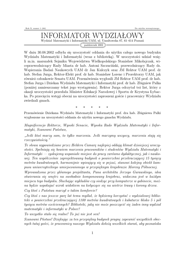 Rok X, numer 1 (84) Do użytku wewnętrznego INFORMATOR WYDZIAŁOWY Wydział Matematyki i Informatyki UAM, ul. Umultowska 87, 61–614 Poznań październik 2002 W dniu 30.08.2002 odbyła się uroczystość oddania do użytku całego nowego budynku Wydziału Matematyki i Informatyki (wraz z biblioteką). W uroczystości udział wzięli m.in. marszałek Sejmiku Województwa Wielkopolskiego Stanisław Mikołajczak, wiceprzewodniczący Rady Miasta dr hab. Antoni Szczuciński, przewodniczący Rady ds. Wspierania Badań Naukowych UAM dr Jan Kulczyk oraz JM Rektor UAM prof. dr hab. Stefan Jurga, Rektor-Elekt prof. dr hab. Stanisław Lorenc i Prorektorzy UAM, jak również członkowie Senatu UAM. Przemówienia wygłosili JM Rektor UAM prof. dr hab. Stefan Jurga i Dziekan Wydziału Matematyki i Informatyki prof. dr hab. Zbigniew Palka (poniżej zamieszczamy tekst jego wystąpienia). Rektor Jurga odczytał też list, który z okazji uroczystości przesłała Minister Edukacji Narodowej i Sportu dr Krystyna Łybacka. Po przecięciu wstęgi obecni na uroczystości zaproszeni goście i pracownicy Wydziału zwiedzali gmach. ? ? ? ? ? Przemówienie Dziekana Wydziału Matematyki i Informatyki prof. dra hab. Zbigniewa Palki wygłoszone na uroczystości oddania do użytku nowego gmachu Wydziału. Magnificencjo Rektorze, Wysoki Senacie, Wysoka Rado Wydziału Matematyki i Informatyki, Szanowni Państwo, „Jeśli ktoś marzy sam, to tylko marzenia. Jeśli marzymy wszyscy, marzenia stają się rzeczywistością.” Te słowa wypowiedziane przez Heldera Camarę najlepiej oddają klimat dzisiejszej uroczystości. Spełniają się bowiem marzenia pracowników i studentów Wydziału Matematyki i Informatyki — zyskujemy wspaniałe miejsce do pracy zwrówno dydaktycznej, jak i naukowej. Ten współcześnie zaprojektowany budynek o powierzchni przekraczającej 15 tysięcy metrów kwadratowych, harmonijnie wpisujący się w pejzaż, stanowi kolejny obiekt kampusu uniwersyteckiego umiejscowionego w przepięknym krajobrazie Moreny Północnej. Wprowadzona przez głównego projektanta, Pana architekta Jerzego Gurawskiego, idea otwierania się wnętrz na swobodnie komponowany krajobraz, widoczna jest w każdym miejscu tego budynku. Słuchając wykładów czy siedząc przy komputerze w gabinecie, można będzie uspokajać wzrok widokiem na kołyszące się na wietrze trawy i korony drzew. Czy ktoś z Państwa marzył o takim komforcie? Czy ktoś z nas jeszcze parę lat temu myślał, że będziemy korzystać z wydziałowej biblioteki o powierzchni przekraczającej 1100 metrów kwadratowych i kubaturze blisko 5 i pół tysiąca metrów sześciennych? Biblioteki, jaką nie może poszczycić się żaden inny wydział matematyki i informatyki w Polsce? To wszystko stało się realne! To już nie jest sen! Szanowni Pństwo! Dziękując za ten przepiękny budynek pragnę zapewnić wszystkich obecnych tutaj gości, że pracownicy naszego Wydziału dołożą wszelkich starań, aby poznańska 1 matematyka i informatyka w dalszym ciągu cieszyła się zasłużoną renomą w kraju i za granicą. Jako nauczyciele i wychowawcy młodzieży akademickiej uczynimy wszystko, aby dyplomy ukończenia naszej Alma Mater były dobrą przepustką do dalszych sukcesów w pracy zawodowej i życiu osobistym. Będzie to nasza spłata długu zaciągniętego wobec Rządu Rzeczypospolitej Polskiej. Szanowni Państwo! Fakt, że dzisiaj przejmujemy od władz Uniwersytetu ten wspaniały obiekt zawdzięczamy niezwykłemu i bardzo konsekwentnemu działaniu JM Rektora Profesora Stefana Jurgi. Magnificencjo Rektorze! W imieniu wszystkich pracowników i studentów Wydziału Matematyki i Informatyki i oczywiście swoim własnym, pragnę z całego serca podziękować Panu za to wszystko, co Pan zrobił dla naszego Wydziału, a tym samym dla całej społeczności uniwersyteckiej. Zapewniam Pana, Panie Rektorze, że będziemy zawsze pamiętali o tym, że to wspaniałe dzieło jest Pańskim dziełem! Panie Rektorze! Dzisiejsza uroczystość jest również pięknym ukoronowaniem Pańskiej sześcioletniej działalności na najwyższym stanowisku naszego Uniwersytetu. Pozwolą Państwo, że korzystając z okazji podziękuję Panu Rektorowi za liczne inspiracje, jakich nie skąpił żadnemu z nas, dzieląc się z nami chętnie swoim doświadczeniem, nie odmawiając nikomu swojej pomocy. Pragnę zatem raz jeszcze w imieniu całego Senatu i całej społeczności uniwersyteckiej gorąco podziękować Panu, Panie Rektorze, za to, że w ciągu tych minionych lat tak szczodrze ofiarował Pan swój czas i umiejętności naszej Alma Mater! Jednocześnie chciałbym zapewnić nowe władze rektorskie, że ten wspaniały budynek będzie służył nie tylko studentom i pracownikom Wydziału Matematyki i Informatyki, ale całej społeczności akademickiej naszego Uniwersytetu. ? ? ? ? ? W dniu 1.07.2002 odbyła się publiczna obrona rozprawy doktorskiej mgr Agaty Narloch z Instytutu Matematyki Uniwersytetu Szczecińskiego. Tytuł rozprawy brzmiał „Struktura wybranych rzeczywistych i zespolonych funkcyjnych siatek Banacha”. Jej promotorem był prof. dr hab. Henryk Hudzik, a recenzentami prof. dr hab. Roman Ger (Instytut Matematyki Uniwersytetu Śląskiego w Katowicach) i prof. dr hab. Julian Musielak (UAM). W wyniku obrony komisja postanowiła wystąpić do Rady Wydziału z wnioskiem o nadanie mgr Agacie Narloch stopnia naukowego doktora nauk matematycznych w zakresie matematyki. Komisja uznała też rozprawę doktorską mgr A. Narloch za wyróżniającą się. ? ? ? ? ? W dniu 13.09.2002 odbyła się publiczna obrona rozprawy doktorskiej mgr inż. Kingi Cichoń, słuchaczki Studium Doktoranckiego przy naszym Wydziale. Tytuł rozprawy brzmiał „Operatory punktowego mnożenia na wagowych przestrzeniach Bergmana funkcji analitycznych”. Jej promotorem był prof. dr hab. Paweł Domański, a recenzentami prof. dr hab. Marek Nawrocki (UAM) i prof. dr hab. Przemysław Wojtaszczy