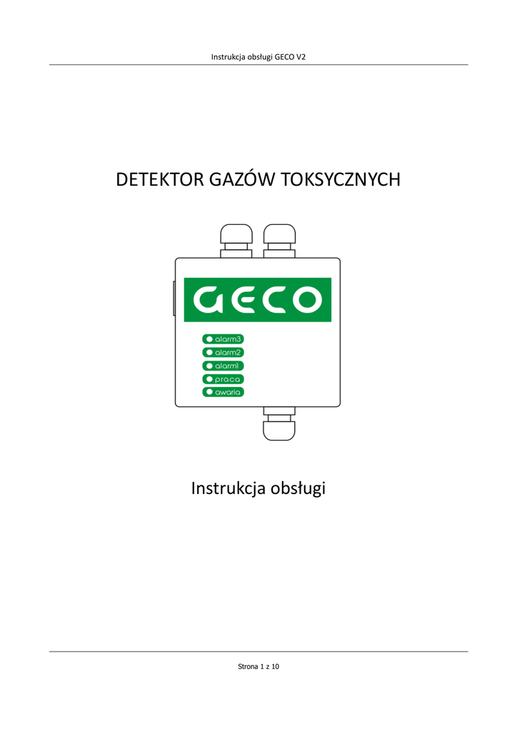 Instrukcja obsługi GECO V2 DETEKTOR GAZÓW TOKSYCZNYCH Instrukcja obsługi Strona 1 z 10 Instrukcja obsługi GECO V2 Producent: PILECKI ELECTRONICS Aleksander Pilecki ul. Traugutta 83 44-120 Pyskowice www.pgaz.pl Strona 2 z 10 Instrukcja obsługi GECO V2 SPIS TREŚCI: Przeznaczenie…................................................................................…................................................. 4 Tlenek Węgla – ZAGROŻENIA…........................................................…................................................. 4 PARAMETRY TECHNICZNE …............................................................…................................................. 5 OPIS DETEKTORA…..........................................................................…................................................. 6 ZASADA DZIAŁANIA….......................................................................…................................................. 6 INSTRUKCJA MONTAŻU….................................................................…................................................. 6 URUCHOMIENIE…............................................................................…................................................. 7 KONSEWACJA I EKSPLOATACJA…......................................................…................................................. 7 Strona 3 z 10 Instrukcja obsługi GECO V2 PRZEZNACZENIE Detektor serii GECO jest urządzeniem służącym do pomiaru stężenia gazów toksycznych w obiektach użyteczności publicznej, garażach i parkingach podziemnych, obiektach przemysłowych. Detektor dostępny jest z sensorem elektrochemicznym (E) oraz półprzewodnikowym (P). Podstawowe cechy eksploatacyjne to: • łatwość montażu (ergonomiczne kątowe złącze), • łączenie elementów systemu w magistrale, • brak ograniczeń ilości czujników wpiętych w strefę wentylacyjną, • możliwość kalibracji czujnika poprzez wymianę płytki sensora (skrócenie czasu kalibracji), • cztery wyjścia sterujące, trzy progi + awaria, • sygnalizacja awarii czujnika, • długotrwała stabilna praca, • wezwanie użytkownika do powtórnej kalibracji po trzech latach od ostatniej (usługa może być wykonywana na miejscu przez ASO), • dzięki narzędziu do diagnostyki multiPRO przeglądy oraz zmiana progów stała się prosta jak nigdy dotąd. Powyższe cechy, przy niezwykle atrakcyjnej cenie powodują, że detektory GECO są idealnym rozwiązaniem dla ekonomicznych zastosowań np. w budownictwie publicznym. Tlenek węgla – ZAGROŻENIA Tlenek węgla najczęściej powstaje na skutek niepełnego spalania różnych paliw. Jest gazem bezwonnym i bezbarwnym. Jest gazem niewiele lżejszym od powietrza przez co stanowi niebezpieczny czynnik dla życia i zdrowia człowieka. Stężenie CO w powietrzu Czas wdychania, objawy ok. 30 ÷ 200 ppm Lekki ból głowy po kilku godzinach ok. 400 ppm Ból głowy, wymioty, mdłości, osłabienie mięśni po 1÷2 godz. ok. 800 ppm Zapaść, utrata przytomności po 2 godzinach ok. 1 600 ppm Zapaść w ciągu 30 minut, ryzyko zgonu po 2 godzinach ok. 3 400 ppm Zapaść po 5÷10 minutach, ryzyko zgonu po 30 min. ok. 7 000 ppm Zapaść po 1÷2 minutach, ryzyko zgonu po 15 min. ok. 13 000 ppm Zgon po czasie 1 do 3 minut! Strona 4 z 10 Instrukcja obsługi GECO V2 PARAMETRY TECHNICZNE Zasilanie 230V AC lub 12V DC (zależy od wersji) Moc 4W Mierzony gaz Tlenek węgla Rodzaj czujnika / Żywotność Półprzewodnikowy do 10 lat Elektrochemiczny do 8 lat Zakres 30 ÷ 1000ppm 0 ÷ 10 000ppm Substancje zakłócające Wodór, znaczny niedobór tlenu Wodór Warunki środowiskowe temperatura otoczenia • wilgotność względna • -10 ÷ +45ºC 10 ÷ 95% bez kondensacji pary Stopień ochrony IP 33 Wyjścia sterujące Cztery wyjścia przekaźnikowe COM-NO-NC dla stężenia ALARM 1, ALARM 2, ALARM 3 oraz AWARII Wpusty kablowe 2x PG11 Wymiary 125mm x 115mm x 59mm Mocowanie 2 otwory mocujące na wkręty/śruby Progi alarmowe (standardowe) A1 – 50ppm, A2 – 100ppm, A3 – 200ppm Rodzaj pomiaru Dyfuzyjny Rysunek nr.1 Strona 5 z 10 Instrukcja obsługi GECO V2 OPIS DETEKTORA Listwa zaciskowa. Zastosowana w urządzeniu listwa przyłączeniowa pozwala w łatwy i szybki sposób podłączyć detektor do zasilania i sterowania. Bezpiecznik. Urządzenie wyposażone jest w bezpiecznik topikowy 100mA. Złącze 4-20mA pozwala w łatwy sposób rozbudować system detekcji dodatkowy detektor np. w garażu podziemnym o czujnik LPG lub podłączenie detektora to sterownika z wejściem prądowym. Klawisz „TEST” służy do sprawdzenia popranego montażu wyjść sterujących detektora. Lampki kontrolne sygnalizują aktualną pracę, alarmy oraz awarie detektora. Złącze serwisowe dzięki narzędziu diagnostycznemu multiPRO powala w szybki sposób zweryfikować awarię detektora, zmienić progi alarmów, zaktualizować oprogramowanie i wykonać kalibrację. Moduł sensora jest elementem wymiennym pasuje do każdej wersji detektora GECO, pozwala użytkownikowi w szybki sposób wykonać wzorcowanie systemu detekcji (przez wymianę modułu). ZASADA DZIAŁANIA Detektor jest autonomicznym urządzeniem, które nie wymaga podłączenia do centrali. Urządzenie wyposażone jest w moduł sensora, który dokonuje cyklicznych pomiarów stężenia tlenku węgla w powietrzu. Informacja o przekroczonych progach stężenia wyświetlana jest za pomocą kontrolek na przednim panelu detektora, wraz z zaświeceniem kontrolki załączany jest odpowiedni przekaźnik sterujący. INSTRUKCJA MONTAŻU Instalacja elektryczna Do podłączenia zasilania sieciowego służy złącze zaciskowe opisane „230V AC”. Połączenie należy realizować przewodem o przekroju 1,5mm2 np.: YDY 5x 1,5mm2 Do łączenia głównego detektora z głowicą LPG należy używać przewodu o 3-żyłowych o przekrojach 0,75 mm2 lub 1mm2 i długości ok. 120-140cm. Istnieje możliwoś