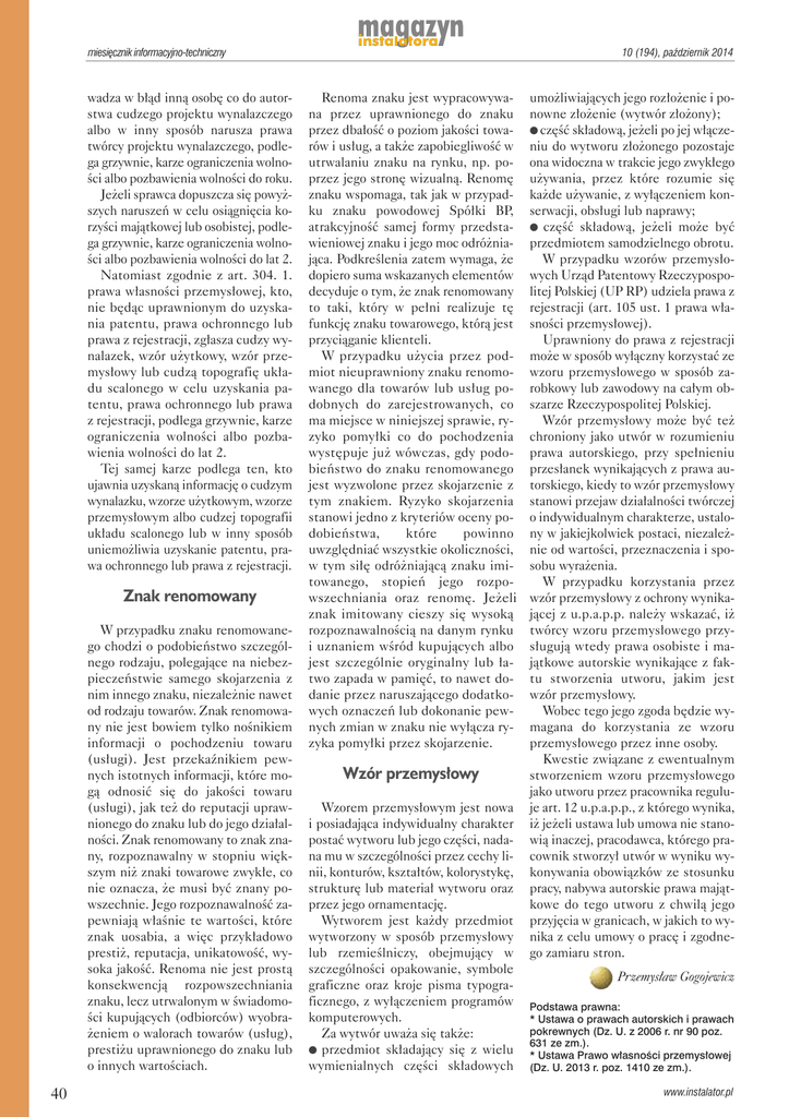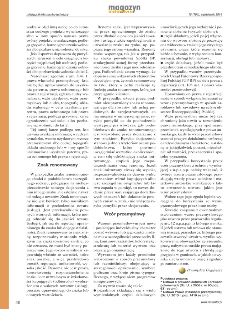 miesięcznik informacyjno-techniczny wadza w błąd inną osobę co do autorstwa cudzego projektu wynalazczego albo w inny sposób narusza prawa twórcy projektu wynalazczego, podlega grzywnie, karze ograniczenia wolności albo pozbawienia wolności do roku. Jeżeli sprawca dopuszcza się powyższych naruszeń w celu osiągnięcia korzyści majątkowej lub osobistej, podlega grzywnie, karze ograniczenia wolności albo pozbawienia wolności do lat 2. Natomiast zgodnie z art. 304. 1. prawa własności przemysłowej, kto, nie będąc uprawnionym do uzyskania patentu, prawa ochronnego lub prawa z rejestracji, zgłasza cudzy wynalazek, wzór użytkowy, wzór przemysłowy lub cudzą topografię układu scalonego w celu uzyskania patentu, prawa ochronnego lub prawa z rejestracji, podlega grzywnie, karze ograniczenia wolności albo pozbawienia wolności do lat 2. Tej samej karze podlega ten, kto ujawnia uzyskaną informację o cudzym wynalazku, wzorze użytkowym, wzorze przemysłowym albo cudzej topografii układu scalonego lub w inny sposób uniemożliwia uzyskanie patentu, prawa ochronnego lub prawa z rejestracji. Znak renomowany W przypadku znaku renomowanego chodzi o podobieństwo szczególnego rodzaju, polegające na niebezpieczeństwie samego skojarzenia z nim innego znaku, niezależnie nawet od rodzaju towarów. Znak renomowany nie jest bowiem tylko nośnikiem informacji o pochodzeniu towaru (usługi). Jest przekaźnikiem pewnych istotnych informacji, które mogą odnosić się do jakości towaru (usługi), jak też do reputacji uprawnionego do znaku lub do jego działalności. Znak renomowany to znak znany, rozpoznawalny w stopniu większym niż znaki towarowe zwykłe, co nie oznacza, że musi być znany powszechnie. Jego rozpoznawalność zapewniają właśnie te wartości, które znak uosabia, a więc przykładowo prestiż, reputacja, unikatowość, wysoka jakość. Renoma nie jest prostą konsekwencją rozpowszechniania znaku, lecz utrwalonym w świadomości kupujących (odbiorców) wyobrażeniem o walorach towarów (usług), prestiżu uprawnionego do znaku lub o innych wartościach. 40 10 (194), październik 2014 Renoma znaku jest wypracowywana przez uprawnionego do znaku przez dbałość o poziom jakości towarów i usług, a także zapobiegliwość w utrwalaniu znaku na rynku, np. poprzez jego stronę wizualną. Renomę znaku wspomaga, tak jak w przypadku znaku powodowej Spółki BP, atrakcyjność samej formy przedstawieniowej znaku i jego moc odróżniająca. Podkreślenia zatem wymaga, że dopiero suma wskazanych elementów decyduje o tym, że znak renomowany to taki, który w pełni realizuje tę funkcję znaku towarowego, którą jest przyciąganie klienteli. W przypadku użycia przez podmiot nieuprawniony znaku renomowanego dla towarów lub usług podobnych do zarejestrowanych, co ma miejsce w niniejszej sprawie, ryzyko pomyłki co do pochodzenia występuje już wówczas, gdy podobieństwo do znaku renomowanego jest wyzwolone przez skojarzenie z tym znakiem. Ryzyko skojarzenia stanowi jedno z kryteriów oceny podobieństwa, które powinno uwzględniać wszystkie okoliczności, w tym siłę odróżniającą znaku imitowanego, stopień jego rozpowszechniania oraz renomę. Jeżeli znak imitowany cieszy się wysoką rozpoznawalnością na danym rynku i uznaniem wśród kupujących albo jest szczególnie oryginalny lub łatwo zapada w pamięć, to nawet dodanie przez naruszającego dodatkowych oznaczeń lub dokonanie pewnych zmian w znaku nie wyłącza ryzyka pomyłki przez skojarzenie. Wzór przemysłowy Wzorem przemysłowym jest nowa i posiadająca indywidualny charakter postać wytworu lub jego części, nadana mu w szczególności przez cechy linii, konturów, kształtów, kolorystykę, strukturę lub materiał wytworu oraz przez jego ornamentację. Wytworem jest każdy przedmiot wytworzony w sposób przemysłowy lub rzemieślniczy, obejmujący w szczególności opakowanie, symbole graficzne oraz kroje pisma typograficznego, z wyłączeniem programów komputerowych. Za wytwór uważa się także: l przedmiot składający się z wielu wymienialnych części składowych umożliwiających jego rozłożenie i ponowne złożenie (wytwór złożony); l część składową, jeżeli po jej włączeniu do wytworu złożonego pozostaje ona widoczna w trakcie jego zwykłego używania, przez które rozumie się każde używanie, z wyłączeniem konserwacji, obsługi lub naprawy; l część składową, jeżeli może być przedmiotem samodzielnego obrotu. W przypadku wzorów przemysłowych Urząd Patentowy Rzeczypospolitej Polskiej (UP RP) udziela prawa z rejestracji (art. 105 ust. 1 prawa własności przemysłowej). Uprawniony do prawa z rejestracji może w sposób wyłączny korzystać ze wzoru przemysłowego w sposób zarobkowy lub zawodowy na całym obszarze Rzeczypospolitej Polskiej. Wzór przemysłowy może być też chroniony jako utwór w rozumieniu prawa autorskiego, przy spełnieniu przesłanek wynikających z prawa autorskiego, kiedy to wzór przemysłowy stanowi przejaw działalności twórczej o indywidualnym charakterze, ustalony w jakiejkolwiek postaci, niezależnie od wartości, przeznaczenia i sposobu wyrażenia. W przypadku korzystania przez wzór przemysłowy z ochrony wynikającej z u.p.a.p.p. należy wskazać, iż twórcy wzoru przemysłowego przysługują wtedy prawa osobiste i majątkowe autorskie wynikające z faktu stworzenia utworu, jakim jest wzór przemysłowy. Wobec tego jego zgoda będzie wymagana do korzystania ze wzoru przemysłowego przez inne osoby. Kwestie związane z ewentualnym stworzeniem wzoru przemysłowego jako utworu przez pracownika reguluje art. 12 u.p.a.p.p., z którego wynika, iż jeżeli ustawa lub umowa nie stanowią inaczej, pracodawca, którego pracownik stworzył utwór w wyniku wykonywania obowiązków ze stosunku pracy, nabywa autorskie prawa majątkowe do tego utworu z chwilą jego przyjęcia w granicach, w jakich to wynika z celu umowy 