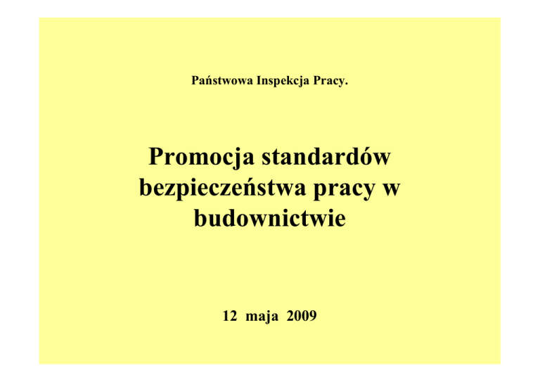 Państwowa Inspekcja Pracy. Promocja standardów bezpieczeństwa pracy w budownictwie 12 maja 2009 Prawo budowlane Ustawa z dnia 7 lipca 1994 r. (Dz. U. z 2006r. nr 156, poz. 1118 z p. zm .) Ogólne załoŜenia prawa budowlanego Obiekt budowlany wraz ze związanymi z nim urządzeniami budowlanymi naleŜy projektować i budować w sposób określony w przepisach, w tym techniczno-budowlanych, oraz zgodnie z zasadami wiedzy technicznej, zapewniając: - warunki bezpieczeństwa i higieny pracy; (art. 5 ust.1 pkt.5) - warunki bezpieczeństwa i ochrony zdrowia osób przebywających na terenie budowy; (art. 5 ust.1 pkt.10) Prawa i obowiązki stron procesu budowlanego (art.17) Uczestnikami procesu budowlanego, w rozumieniu ustawy, są: 1) inwestor; 2) inspektor nadzoru inwestorskiego; 3) projektant; 4) kierownik budowy lub kierownik robót. (art. 18 prawa budowlanego) Do obowiązków inwestora naleŜy: zorganizowanie procesu budowy, z uwzględnieniem zawartych w przepisach zasad bezpieczeństwa i ochrony zdrowia, a w szczególności : 1) opracowania projektu budowlanego i, stosownie do potrzeb, innych projektów, 2) objęcia kierownictwa budowy przez kierownika budowy, 3) opracowania planu bezpieczeństwa i ochrony zdrowia, 4) wykonania i odbioru robót budowlanych, 5) w przypadkach uzasadnionych wysokim stopniem skomplikowania robót budowlanych lub warunkami gruntowymi, nadzoru nad wykonywaniem robót budowlanych - przez osoby o odpowiednich kwalifikacjach zawodowych. 2. Inwestor moŜe ustanowić inspektora nadzoru inwestorskiego na budowie. 3. Inwestor moŜe zobowiązać projektanta do sprawowania nadzoru autorskiego. Do podstawowych obowiązków projektanta naleŜy: Sporządzenie informacji dotyczącej bezpieczeństwa i ochrony zdrowia ze względu na specyfikę projektowanego obiektu budowlanego, uwzględnianej w planie bezpieczeństwa i ochrony zdrowia; (art. 20 ust.1 pkt.1b) Projektant, w trakcie realizacji budowy, ma prawo: Ŝądania wpisem do dziennika budowy wstrzymania robót budowlanych w razie: a) stwierdzenia moŜliwości powstania zagroŜenia, b) wykonywania ich niezgodnie z projektem. (art. 21 pkt. 2) Kierownik budowy jest obowiązany, w oparciu o informację, o której mowa w art. 20 ust. 1 pkt 1b, lub zapewnić sporządzenie, przed sporządzić rozpoczęciem budowy, planu bezpieczeństwa i ochrony zdrowia, uwzględniając specyfikę obiektu budowlanego i warunki prowadzenia robót budowlanych, w tym planowane jednoczesne prowadzenie robót budowlanych i produkcji przemysłowej. (art. 21a ust.1) Do podstawowych obowiązków kierownika budowy naleŜy: Koordynowanie działań zapewniających przestrzeganie podczas wykonywania robót budowlanych zasad bezpieczeństwa i ochrony zdrowia zawartych w przepisach, o których mowa w art. 21a ust. 3, (przepisach bhp) oraz w planie bezpieczeństwa i ochrony zdrowia; (art. 22 pkt. 3b) Kierownik budowy ma prawo: Występowania do inwestora o zmiany w rozwiązaniach projektowych, jeŜeli są one uzasadnione koniecznością zwiększenia bezpieczeństwa realizacji robót budowlanych lub usprawnienia procesu budowy; (art. 23 pkt. 1) Do podstawowych obowiązków inspektora nadzoru inwestorskiego naleŜy: Reprezentowanie inwestora na budowie przez sprawowanie kontroli zgodności jej realizacji z projektem i pozwoleniem na budowę, przepisami oraz zasadami wiedzy technicznej; (art.25 pkt 1) Inspektor nadzoru inwestorskiego ma prawo: Wydawać kierownikowi budowy lub kierownikowi robót polecenia, potwierdzone wpisem do dziennika budowy, dotyczące: usunięcia nieprawidłowości lub zagroŜeń, (art.26 pkt 1) Inspektor nadzoru budowlanego ma prawo: (art.26 pkt 2) śądać od kierownika budowy lub kierownika robót wstrzymania dalszych robót budowlanych w przypadku, gdyby ich kontynuacja mogła wywołać zagroŜenie bądź spowodować niedopuszczalną niezgodność z projektem lub pozwoleniem na budowę. Najstosowniejsze rozwiązanie to wpis do Dziennika Budowy. Dopuszczalne inne formy potwierdzone na piśmie. KODEKS PRACY Ustawa z dnia 26 czerwca 1974 r. KODEKS PRACY (J.t.: Dz. U. z 1998 r. Nr 21, poz. 94 z późn. zmianami) Prawa i obowiązki stron stosunku pracy w zakresie bhp Podstawowe obowiązki pracodawcy Art. 207. § 1. Pracodawca ponosi odpowiedzialność za stan bezpieczeństwa i higieny pracy w zakładzie pracy. § 2. Pracodawca jest obowiązany chronić zdrowie i Ŝycie pracowników poprzez zapewnienie bezpiecznych i higienicznych warunków pracy przy odpowiednim wykorzystaniu osiągnięć nauki i techniki. W szczególności pracodawca jest obowiązany: 1) organizować pracę w sposób zapewniający bezpieczne i higieniczne warunki pracy, 2) zapewniać przestrzeganie w zakładzie pracy przepisów oraz zasad bezpieczeństwa i higieny pracy, wydawać polecenia usunięcia uchybień w tym zakresie oraz kontrolować wykonanie tych poleceń, Prawa i obowiązki pracownika Art. 210. § 1. W razie gdy warunki pracy nie odpowiadają przepisom bezpieczeństwa i higieny pracy i stwarzają bezpośrednie zagroŜenie dla zdrowia lub Ŝycia pracownika albo gdy wykonywana przez niego praca grozi takim niebezpieczeństwem innym osobom, pracownik ma prawo powstrzymać się od wykonywania pracy, zawiadamiając o tym niezwłocznie przełoŜonego. § 4. Pracownik ma prawo, po uprzednim zawiadomieniu przełoŜonego, powstrzymać się od wykonywania pracy wymagającej szczególnej sprawności psychofizycznej w przypadku, gdy jego stan psychofizyczny nie zapewnia bezpiecznego wykonywania pracy i stwarza zagroŜenie dla innych osób. Art. 211. Przestrzeganie przepisów i zasad bezpieczeństwa i higieny pracy jest podstawowym obowiązkiem pracownika. W szczególności pracownik jest obowiązany: 1) znać przepisy i zasady bezpieczeństwa i higieny pracy, brać udział w szkoleniu i instruktaŜu z tego zakresu oraz poddawać się wymaganym egzaminom sprawdzającym, 2) wykonywać pracę w sposób zgodny z przepisami i zasadami bezpieczeństwa i higieny pracy oraz stosow