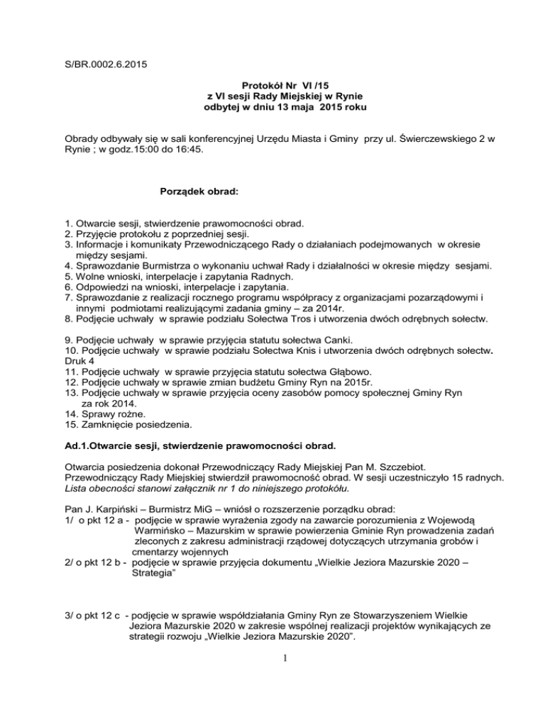 S/BR.0002.6.2015 Protokół Nr VI /15 z VI sesji Rady Miejskiej w Rynie odbytej w dniu 13 maja 2015 roku Obrady odbywały się w sali konferencyjnej Urzędu Miasta i Gminy przy ul. Świerczewskiego 2 w Rynie ; w godz.15:00 do 16:45. Porządek obrad: 1. Otwarcie sesji, stwierdzenie prawomocności obrad. 2. Przyjęcie protokołu z poprzedniej sesji. 3. Informacje i komunikaty Przewodniczącego Rady o działaniach podejmowanych w okresie między sesjami. 4. Sprawozdanie Burmistrza o wykonaniu uchwał Rady i działalności w okresie między sesjami. 5. Wolne wnioski, interpelacje i zapytania Radnych. 6. Odpowiedzi na wnioski, interpelacje i zapytania. 7. Sprawozdanie z realizacji rocznego programu współpracy z organizacjami pozarządowymi i innymi podmiotami realizującymi zadania gminy – za 2014r. 8. Podjęcie uchwały w sprawie podziału Sołectwa Tros i utworzenia dwóch odrębnych sołectw. 9. Podjęcie uchwały w sprawie przyjęcia statutu sołectwa Canki. 10. Podjęcie uchwały w sprawie podziału Sołectwa Knis i utworzenia dwóch odrębnych sołectw. Druk 4 11. Podjęcie uchwały w sprawie przyjęcia statutu sołectwa Głąbowo. 12. Podjęcie uchwały w sprawie zmian budżetu Gminy Ryn na 2015r. 13. Podjęcie uchwały w sprawie przyjęcia oceny zasobów pomocy społecznej Gminy Ryn za rok 2014. 14. Sprawy rożne. 15. Zamknięcie posiedzenia. Ad.1.Otwarcie sesji, stwierdzenie prawomocności obrad. Otwarcia posiedzenia dokonał Przewodniczący Rady Miejskiej Pan M. Szczebiot. Przewodniczący Rady Miejskiej stwierdził prawomocność obrad. W sesji uczestniczyło 15 radnych. Lista obecności stanowi załącznik nr 1 do niniejszego protokółu. Pan J. Karpiński – Burmistrz MiG – wniósł o rozszerzenie porządku obrad: 1/ o pkt 12 a - podjęcie w sprawie wyrażenia zgody na zawarcie porozumienia z Wojewodą Warmińsko – Mazurskim w sprawie powierzenia Gminie Ryn prowadzenia zadań zleconych z zakresu administracji rządowej dotyczących utrzymania grobów i cmentarzy wojennych 2/ o pkt 12 b - podjęcie w sprawie przyjęcia dokumentu „Wielkie Jeziora Mazurskie 2020 – Strategia” 3/ o pkt 12 c - podjęcie w sprawie współdziałania Gminy Ryn ze Stowarzyszeniem Wielkie Jeziora Mazurskie 2020 w zakresie wspólnej realizacji projektów wynikających ze strategii rozwoju „Wielkie Jeziora Mazurskie 2020”. 1 Przewodniczący Rady Miejskiej - Pan M. Szczebiot – poddał pod głosowanie proponowane zmiany do porządku obrad. W wyniku przeprowadzonego głosowania Rada Miejska większością głosów, opowiedziała się za rozszerzeniem porządku obrad o powyższe punkty. Za - rozszerzeniem porządku – opowiedziało się 14 radnych; przeciw – nie było; 1 radny – wstrzymał się od głosu. Ad.2 Przyjęcie protokółu z poprzedniej sesji. Przewodniczący Rady Miejskiej - Pan M. Szczebiot – poddał pod głosowanie protokół z poprzedniej sesji Rady Miejskiej. W wyniku przeprowadzonego głosowania za przyjęciem protokółu - opowiedziało się 13 radnych; przeciw – nie było; 2 radnych wstrzymało się od głosu. Pan A. Majgier nadmienił, że w protokole jest błędny zapis dotyczący radnych nieobecnych na poprzedniej sesji. Zapisano, że nieobecni to : Pani A. Jucewicz i Pan A. Nieckarz , a powinno być: Pani A. Jucewicz i Pan A. Majgier . Ad.3 Informacje i komunikaty Przewodniczącego Rady o działaniach podejmowanych w okresie między sesjami. Przewodniczący Rady Miejskiej - Pan M. Szczebiot – poinformował o rozstrzygnięciu nadzorczym Regionalnej Izby Obrachunkowej w Olsztynie - Nr 0102-108/15 - doręczone 23.04.2015r. stwierdzające nieważność uchwały Nr IV/26/15 Rady Miejskiej w Rynie z dnia 25 lutego 2015r. w sprawie poboru łącznego zobowiązania pieniężnego, podatku rolnego, leśnego i od nieruchomości w drodze inkasa oraz określenia inkasentów i wynagrodzenia za inkaso. Przewodniczący Rady Miejskiej przypomniał, że na poprzedniej sesji Rada Miejska podjęła już właściwą uchwałę w tej sprawie. Ad.4 Sprawozdanie Burmistrza o wykonaniu uchwał Rady i działalności w okresie między sesjami. Sprawozdanie stanowi załącznik nr 2 do niniejszego protokółu. Pan J. Karpiński – Burmistrz MiG – poinformował, że: 1/ udało się pozyskać 60.000 zł na drogę w Sterławkach Wielkich z funduszu ochrony gruntów rolnych 2/ odbyły się spotkania dotyczące wdrażania strategii - Wielkie Jeziora Mazurskie - w zakresie Mazurskiej Pętli Rowerowej; w projekcie, jako partnerzy będą uczestniczyły nadleśnictwa 3/ odbyły się konsultacje społeczne w Sołectwie Knis oraz Sołectwie Tros; mieszkańcy opowiedzieli się za podziałem tych sołectw Sołectw 4/ została zrealizowana inwestycja w zakresie wodociągu i kanalizacji dla miejscowości Mrówki i jednocześnie bajpasu spinającego kanalizację dla Ławek i Skorupek - w razie awarii 5/ odbył się przegląd gwarancyjny inwestycji nad Jez. Ołów: pomosty, targ rybny, trafostacja – z uwagami do wykonania oraz przegląd Ekomariny i utwardzenia placu w Sterławkach Wielkich 6/ z Panią Kierownik MGOPS uczestniczyli w Salonie Samorządowym zorganizowanym w Nowym Mieście Lubawskim , na którym poruszane były sprawy związane z pomocą społeczną 7/ w Mikołajkach odbyło się kolejne spotkanie dotyczące strategii Wielkich Jezior Mazurskich poświęcone zdolności realizacji projektów kluczowych przez poszczególne samorządy 12 gmin 8/ już trzeci rok z rzędu promują się wspólnie miasta w ramach „7 Cudów Mazur „; w roku ubiegłym odeszło miasto Pisz w związku z trudnościami finansowymi; w tym roku wycofało się kolejne miasto Ruciane Nida, a dołączyło miasto Orzysz 2 9/ mieliśmy presję, żeby uczestniczyć w programie promocyjnym TVN pogoda - realizowanym przez Regionalną Grupę Turystyczną 10/ odbyły się konsultacje strategii lokalnego programu rewitalizacji dla miasta Ryn 11/ uczestniczył w walnym zgromadzeniu Mazurskiego Banku Spółdzielczego, w którym gmin
