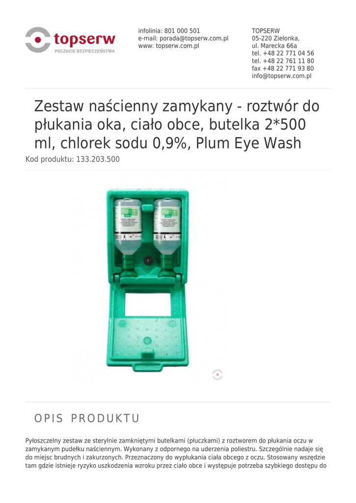 infolinia: 801 000 501 e-mail: [email protected] www: topserw.com.pl TOPSERW 05-220 Zielonka, ul. Marecka 66a tel. +48 22 771 04 56 tel. +48 22 761 11 80 fax +48 22 771 93 80 [email protected] Zestaw naścienny zamykany - roztwór do płukania oka, ciało obce, butelka 2*500 ml, chlorek sodu 0,9%, Plum Eye Wash Kod produktu: 133.203.500 OPIS PRODUKTU Pyłoszczelny zestaw ze sterylnie zamkniętymi butelkami (płuczkami) z roztworem do płukania oczu w zamykanym pudełku naściennym. Wykonany z odpornego na uderzenia poliestru. Szczególnie nadaje się do miejsc brudnych i zakurzonych. Przeznaczony do wypłukania ciała obcego z oczu. Stosowany wszędzie tam gdzie istnieje ryzyko uszkodzenia wzroku przez ciało obce i występuje potrzeba szybkiego dostępu do płuczek. Wystarczy wyjąć butelkę ze stacji, odkręcić nakrętkę i rozpocząć płukanie. Nakrętka jest jednocześnie wylewką płuczki. Jej kształt pokrywa się z naturalną krzywizną oka, co czyni produkt wygodnym, higienicznym i łatwym w użyciu. Piktogramy na ścianie i butelkach oraz prosta i jasna instrukcja umożliwiają płukanie oczu w sposób prawidłowy i bezpieczny. Opcjonalnie dostępna wersja mrozoodporna. Model Plum Eye Wash Zestaw, pojemność 2*500 ml, okres przydatności do użycia 3 lata, czas płukania około 10 min, roztwór - chlorek sodu 0,9%, piktogram ścienny, lustro, znak CE. DANE TECHNICZNE Pojemność 2*500 ml Typ Zestaw naścienny Wypłukiwanie Ciało obce z oka CZĘŚCI ZAMIENNE Roztwór do płukania oka, ciało obce, butelka 500 ml, chlorek sodu 0,9%, Plum Eye Wash 133.100.500