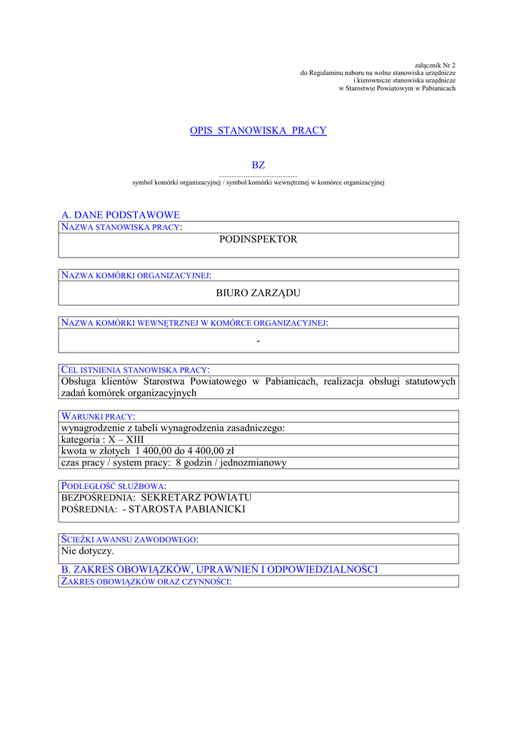 załącznik Nr 2 do Regulaminu naboru na wolne stanowiska urzędnicze i kierownicze stanowiska urzędnicze w Starostwie Powiatowym w Pabianicach OPIS STANOWISKA PRACY BZ ............................................. symbol komórki organizacyjnej / symbol komórki wewnętrznej w komórce organizacyjnej A. DANE PODSTAWOWE NAZWA STANOWISKA PRACY: PODINSPEKTOR NAZWA KOMÓRKI ORGANIZACYJNEJ: BIURO ZARZĄDU NAZWA KOMÓRKI WEWNĘTRZNEJ W KOMÓRCE ORGANIZACYJNEJ: CEL ISTNIENIA STANOWISKA PRACY: Obsługa klientów Starostwa Powiatowego w Pabianicach, realizacja obsługi statutowych zadań komórek organizacyjnych WARUNKI PRACY: wynagrodzenie z tabeli wynagrodzenia zasadniczego: kategoria : X – XIII kwota w złotych 1 400,00 do 4 400,00 zł czas pracy / system pracy: 8 godzin / jednozmianowy PODLEGŁOŚĆ SŁUŻBOWA: BEZPOŚREDNIA: SEKRETARZ POWIATU POŚREDNIA: - STAROSTA PABIANICKI ŚCIEŻKI AWANSU ZAWODOWEGO: Nie dotyczy. B. ZAKRES OBOWIĄZKÓW, UPRAWNIEŃ I ODPOWIEDZIALNOŚCI ZAKRES OBOWIĄZKÓW ORAZ CZYNNOŚCI: 1. Codzienna obsługa centrali telefonicznej Starostwa Powiatowego w Pabianicach w tym : - przyjmowanie rozmów telefonicznych przychodzących i łączenie ich z odpowiednimi numerami wewnętrznymi, - bieżące kontaktowania się z informatykiem zatrudnionym w Biurze Zarządu Powiatu w sprawach dotyczących bieżącej eksploatacji, konserwacji oraz napraw centrali telefonicznej, sieci telefonicznej i telefonów zainstalowanych w poszczególnych komórkach organizacyjnych Starostwa Powiatowego w Pabianicach, - obsługa punktu kancelaryjnego – przyjmowanie bezpośrednio od interesantów korespondencji do urzędu oraz potwierdzanie ich przyjęcia stosowną pieczęcią i własnoręcznym podpisem, - obsługa systemu elektronicznego obiegu dokumentacji, - obsługa urządzeń umożliwiających wjazd na dziedziniec urzędu. 2. Udzielanie interesantom Starostwa Powiatowego w Pabianicach informacji werbalnej i telefonicznej o czasie pracy oraz zadaniach poszczególnych komórek organizacyjnych, samodzielnych stanowisk Starostwa Powiatowego w Pabianicach oraz powiatowych jednostek organizacyjnych. 3. Przyjmowanie korespondencji odebranej przez upoważnionych pracowników Biura Zarządu Powiatu z PUPP Poczta Polska lub innego operatora publicznego. 4. Wprowadzanie na bieżąco przyjętej korespondencji ( bezpośrednio otrzymanej od interesantów i z PUPP Poczta Polska lub innego operatora publicznego) do systemu elektronicznego obiegu dokumentów zgodnie z instrukcją kancelaryjną. 5. Dokonywanie aktualizacji wykazu danych teleadresowych komórek organizacyjnych i samodzielnych stanowisk Starostwa Powiatowego w Pabianicach oraz powiatowych jednostek organizacyjnych i bieżące przesyłanie ich wśród pracowników w/w oraz w kontakcie z pracownikiem Biura Zarządu Powiatu przekazywanie do publikacji na stronie internetowej urzędu. 6. Dokonywanie rozdziału wysyłanej korespondencji i przekazywanie jej gońcowi do rozniesienia lub kierowcy – pracownika Biura Zarządu Powiatu do zawiezienia do siedziby firmy realizującej dla Starostwa Powiatowego w Pabianicach usługi pocztowe. 7. Przyjmowanie od poszczególnych komórek organizacyjnych korespondencji do wysłania oraz prowadzenie w tym zakresie stosownej dokumentacji. 8. Prowadzenie rejestru ewidencji czasu pracy kierowców. 9. Wydawanie „Kart drogowych” kierowcom samochodów osobowych Starostwa Powiatowego w Pabianicach. 10. Przyjmowanie od kierowców „Kart drogowych” oraz dokonywanie rozliczenia zużycia paliwa przez poszczególne samochody osobowe. 11. Przygotowanie niezbędnych materiałów do przygotowania postępowania o udzielenie zamówienia publicznego na zakup paliwa do samochodów osobowych Starostwa Powiatowego w Pabianicach. 12. Prowadzenie ewidencji przejechanych kilometrów przez poszczególne samochody osobowe i przekazywanie Sekretarzowi Powiatu drogą elektroniczną miesięcznych sprawozdań w tym zakresie. 13. Przygotowanie niezbędnej dokumentacji dotyczącej zakupów materiałów eksploatacyjnych i do napraw samochodów osobowych. 14. Bieżące kontrolowanie stanu technicznego samochodów osobowych Starostwa Powiatowego w Pabianicach oraz zlecanie ich konserwacji i napraw po uzgodnieniu z Sekretarzem Powiatu. Prowadzenie ewidencji wszystkich kosztów eksploatacji (z wyjątkiem płac i pochodnych od płac kierowców) poszczególnych samochodów osobowych i przekazywanie Sekretarzowi drogą elektroniczną raz na kwartał sprawozdań w tym zakresie. 15. Prowadzenie ewidencji wszystkich kosztów eksploatacji (z wyjątkiem płac i pochodnych od płac kierowców) poszczególnych samochodów osobowych i przekazywanie Sekretarzowi drogą elektroniczną raz na kwartał sprawozdań w tym zakresie. 16. Zabezpieczenie organizacyjne uroczystości oraz spotkań organizowanych na sali kominkowej Starostwa przez Zarząd Powiatu lub instytucje zewnętrzne, organizacje które uzyskały zgodę Starosty Pabianickiego w tym udostępnianie w/w Sali w celu organizacji posiedzeń Rady Powiatu i komisji stałych Rady. 17. Kierowanie systemem ewakuacji pracowników w chwili wystąpienia zagrożeń podczas pracy urzędu w budynkach Starostwa Powiatowego w Pabianicach przy ul. Piłsudskiego 2. 18. Prowadzenie harmonogramu użytkowania w/w sali uwzględniającego wykorzystanie jej do w/w celów. 19. Wykonywanie innych zadań zleconych przez Sekretarza Powiatu. ZAKRES UPRAWNIEŃ SŁUŻBOWYCH I UPRAWNIEŃ ZWIĄZANYCH Z DANYM STANOWISKIEM: Wynikające z zakresu obowiązków. ZAKRES ODPOWIEDZIALNOŚCI: Pracownik ponosi odpowiedzialność za prawidłowe, zgodne z prawem i terminowe wykonywanie zadań oraz za przestrzeganie obowiązków wynikających z przepisów kodeksu pracy, regulaminu organizacyjnego Starostwa Powiatowego w Pabianicach oraz uchwał Rady Powiatu, Zarządu Powiatu i zarządzeń Starosty Pabianickiego. DOSTĘP DO INFORMACJI NIEJAWNYCH Zgodnie z uregulowaniami zawartymi w wewnętrznych przepisach Urzędu. DOSTĘP DO DANYCH OSOBO
