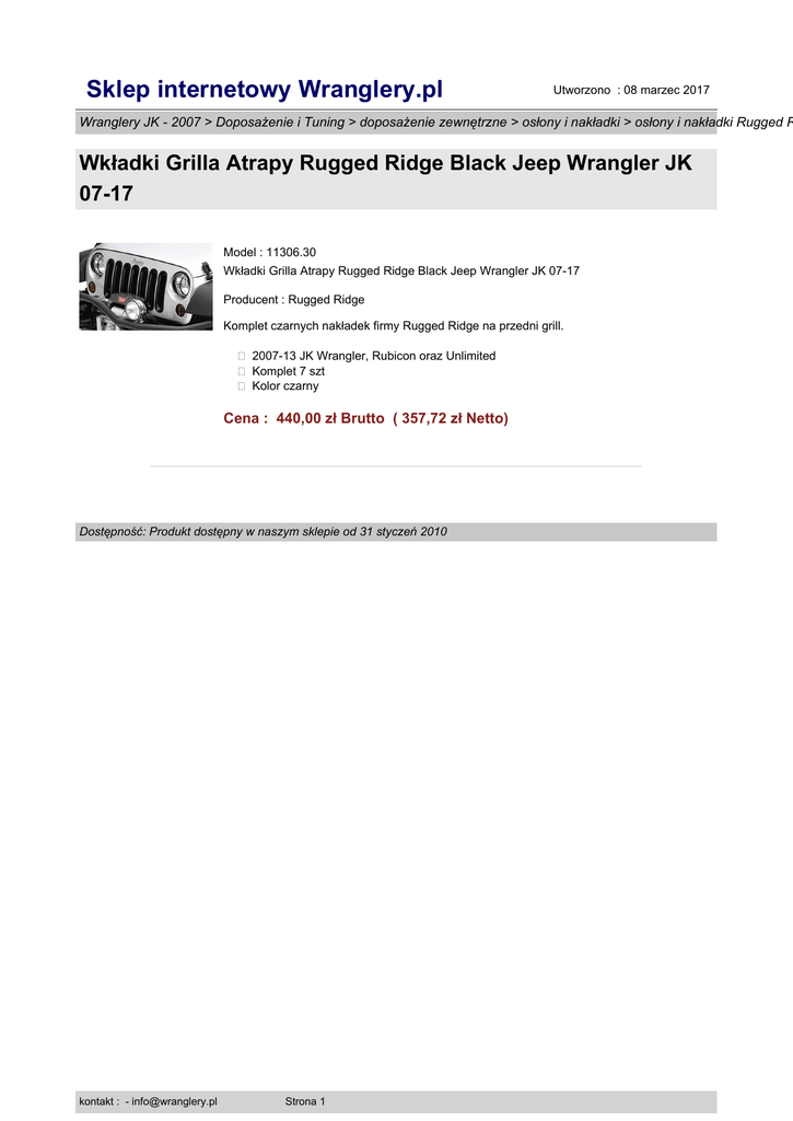 Sklep internetowy Wranglery.pl Utworzono : 08 marzec 2017 Wranglery JK - 2007 > Doposażenie i Tuning > doposażenie zewnętrzne > osłony i nakładki > osłony i nakładki Rugged R Wkładki Grilla Atrapy Rugged Ridge Black Jeep Wrangler JK 07-17 Model : 11306.30 Wkładki Grilla Atrapy Rugged Ridge Black Jeep Wrangler JK 07-17 Producent : Rugged Ridge Komplet czarnych nakładek firmy Rugged Ridge na przedni grill. � 2007-13 JK Wrangler, Rubicon oraz Unlimited � Komplet 7 szt � Kolor czarny Cena : 440,00 zł Brutto ( 357,72 zł Netto) Dostępność: Produkt dostępny w naszym sklepie od 31 styczeń 2010 kontakt : - [email protected] Strona 1