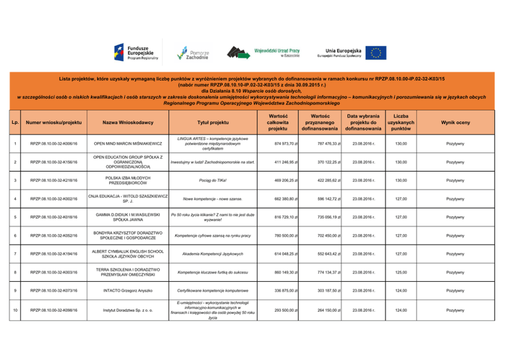 Lista projektów, które uzyskały wymaganą liczbę punktów z wyróżnieniem projektów wybranych do dofinansowania w ramach konkursu nr RPZP.08.10.00-IP.02-32-K03/15 (nabór numer RPZP.08.10.10-IP.02-32-K03/15 z dnia 30.09.2015 r.) dla Działania 8.10 Wsparcie osób dorosłych, w szczególności osób o niskich kwalifikacjach i osób starszych w zakresie doskonalenia umiejętności wykorzystywania technologii informacyjno – komunikacyjnych i porozumiewania się w językach obcych Regionalnego Programu Operacyjnego Województwa Zachodniopomorskiego Wartość całkowita projektu Wartośc przyznanego dofinansowania Data wybrania projektu do dofinansowania Liczba uzyskanych punktów Wynik oceny 787 476,33 zł 23.08.2016 r. 130,00 Pozytywny 411 246,95 zł 370 122,25 zł 23.08.2016 r. 130,00 Pozytywny Pociąg do TIKa! 469 206,25 zł 422 285,62 zł 23.08.2016 r. 130,00 Pozytywny CNJA EDUKACJA - WITOLD SZASZKIEWICZ SP. J. Nowe kompetencje - nowe szanse. 662 380,80 zł 596 142,72 zł 23.08.2016 r. 127,00 Pozytywny RPZP.08.10.00-32-K018/16 GAMMA D.DIDIUK I M.WASILEWSKI SPÓŁKA JAWNA Po 50 roku życia klikanie? Z nami to nie jest duże wyzwanie! 816 729,10 zł 735 056,19 zł 23.08.2016 r. 127,00 Pozytywny 6 RPZP.08.10.00-32-K052/16 BONDYRA KRZYSZTOF DORADZTWO SPOŁECZNE I GOSPODARCZE Kompetencje cyfrowe szansą na rynku pracy 780 500,00 zł 702 450,00 zł 23.08.2016 r. 127,00 Pozytywny 7 RPZP.08.10.00-32-K194/16 ALBERT CYMBALUK ENGLISH SCHOOL SZKOŁA JĘZYKÓW OBCYCH Akademia Kompetencji Językowych 614 048,25 zł 552 643,42 zł 23.08.2016 r. 127,00 Pozytywny 8 RPZP.08.10.00-32-K003/16 TERRA SZKOLENIA I DORADZTWO PRZEMYSŁAW OMIECZYŃSKI Kompetencje kluczowe furtką do sukcesu 860 149,30 zł 774 134,37 zł 23.08.2016 r. 125,00 Pozytywny 9 RPZP.08.10.00-32-K073/16 INTACTO Grzegorz Anyszko Certyfikowane kompetencje komputerowe 336 875,00 zł 303 187,50 zł 23.08.2016 r. 124,00 Pozytywny 10 RPZP.08.10.00-32-K098/16 Instytut Doradztwa Sp. z o. o. E-umiejętności - wykorzystanie technologii informacyjno-komunikacyjnych w finansach i księgowości dla osób powyżej 50 roku życia 293 500,00 zł 264 150,00 zł 23.08.2016 r. 124,00 Pozytywny Lp. Numer wniosku/projektu Nazwa Wnioskodawcy Tytuł projektu 1 RPZP.08.10.00-32-K006/16 OPEN MIND MARCIN MIŚNIAKIEWICZ LINGUA ARTES – kompetencje językowe potwierdzone międzynarodowym certyfikatem 874 973,70 zł 2 RPZP.08.10.00-32-K156/16 OPEN EDUCATION GROUP SPÓŁKA Z OGRANICZONĄ ODPOWIEDZIALNOŚCIĄ Inwestujmy w ludzi! Zachodniopomorskie na start. 3 RPZP.08.10.00-32-K218/16 POLSKA IZBA MŁODYCH PRZEDSIĘBIORCÓW 4 RPZP.08.10.00-32-K002/16 5 11 RPZP.08.10.00-32-K199/16 GDELA KRYSTYNA AKUSTICA.MED Kompetencje bez barier! 611 486,00 zł 550 337,40 zł 23.08.2016 r. 124,00 Pozytywny 12 RPZP.08.10.00-32-K033/16 MW CONSULTING MICHAŁ WASYLKO LEVEL UP - profesjonalne kursy języka angielskiego z certyfikatem TELC 808 857,90 zł 727 972,10 zł 23.08.2016 r. 122,00 Pozytywny 13 RPZP.08.10.00-32-K227/16 EUROSOLUTIONS JAN DYMEK Na języki przyszedł czas 550 070,85 zł 495 063,76 zł 23.08.2016 r. 121,00 Pozytywny 14 RPZP.08.10.00-32-K093/16 PLUSK POLSKA SPÓŁKA Z OGRANICZONĄ ODPOWIEDZIALNOŚCIĄ SPÓŁKA KOMANDYTOWA Więcej kompetencji - więcej możliwości! 1 058 033,28 zł 952 229,94 zł 121,00 Negatywny, projekt uzyskał wymaganą liczbę punktów, jednak kwota przeznaczona na dofinansowanie projektów w konkursie nie wystarcza na wybranie go do dofinansowania 15 RPZP.08.10.00-32-K169/16 AL EDUKACJA LENA ANDRZEJEWSKA CENTRUM SZKOLENIOWO-DORADCZE Nowe kompetencje kluczem do sukcesu! 541 656,15 zł 487 490,53 zł 121,00 Negatywny, projekt uzyskał wymaganą liczbę punktów, jednak kwota przeznaczona na dofinansowanie projektów w konkursie nie wystarcza na wybranie go do dofinansowania 16 RPZP.08.10.00-32-K219/16 ATForum Damian Dmuchowski 50 twarzy DIGCOMPA. Zintegrowany projekt wsparcia w zakresie TIK. 466 906,25 zł 420 126,25 zł 121,00 Negatywny, projekt uzyskał wymaganą liczbę punktów, jednak kwota przeznaczona na dofinansowanie projektów w konkursie nie wystarcza na wybranie go do dofinansowania 17 RPZP.08.10.00-32-K126/16 Instytut Badawczy Aparatury Rehabilitacyjnej i Medycznej Sp. z o.o. Podniesienie kompetencji TIK osób niepełnosprawnych z Województwa Zachodniopomorskiego 250 200,00 zł 221 400,00 zł 120,00 Negatywny, projekt uzyskał wymaganą liczbę punktów, jednak kwota przeznaczona na dofinansowanie projektów w konkursie nie wystarcza na wybranie go do dofinansowania 18 RPZP.08.10.00-32-K131/16 4AM GROUP Kluczowe kompetencje, ważne jak referencje 367 680,00 zł 330 912,00 zł 119,00 Negatywny, projekt uzyskał wymaganą liczbę punktów, jednak kwota przeznaczona na dofinansowanie projektów w konkursie nie wystarcza na wybranie go do dofinansowania 19 RPZP.08.10.00-32-K223/16 WIELKOPOLSKI INSTYTUT ROZWOJU PRZEDSIĘBIORCZOŚCI I EDUKACJI ŁUKASZ DYMEK Cyfrowy zawrót głowy 991 237,50 zł 892 113,75 zł 119,00 Negatywny, projekt uzyskał wymaganą liczbę punktów, jednak kwota przeznaczona na dofinansowanie projektów w konkursie nie wystarcza na wybranie go do dofinansowania 20 RPZP.08.10.00-32-K074/16 Fundacja IT Kompetencje w zakresie TIK i języka angielskiego 433 521,55 zł 390 159,71 zł 119,00 Negatywny, projekt uzyskał wymaganą liczbę punktów, jednak kwota przeznaczona na dofinansowanie projektów w konkursie nie wystarcza na wybranie go do dofinansowania 21 RPZP.08.10.00-32-K161/16 CONSULTORIS.PL TOMASZ ORDYSIŃSKI Nowoczesne stanowisko pracy szansą na wzmocnienie potencjału zawodowego 567 811,25 zł 508 411,25 zł 118,00 Negatywny, projekt uzyskał wymaganą liczbę punktów, jednak kwota przeznaczona na dofinansowanie projektów w konkursie nie wystarcza na wybranie go do dofinansowania 22 RPZP.08.10.00-32-K217/16 STOWARZYSZENIE EURO-CONCRET Akademia TIK na TAK 459 506,25 zł 412 575,62 zł 118,00 Negatywny, projekt uzyskał wymaganą liczbę punktów, jednak kwota przeznaczona na dofinansowanie projektów w konk