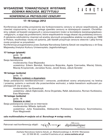 Wydarzenie towarzyszące wystawie Goshka Macuga. Bez tytułu KONFERENCJA Przyszłość cenzury 17–18 lutego 2012 Konferencja jest próbą przyjrzenia się funkcjonowaniu cenzury w sztuce współczesnej, jak również rozpoznania, na czym polega zjawisko cenzury w dzisiejszych czasach. Chcielibyśmy odejść od kwestii związanych z cenzurowaniem treści w kontekście światopoglądowo-religijnym, a zająć się problemami, które współcześnie mogą okazać się podstawą cenzury. Z założenia odchodzimy również od analizy słynnych przypadków ataków na sztukę po 1989 w Polsce, wychodząc raczej od pytania, jaki kształt przyjmuje cenzura obecnie i jaką formę może przybrać w przyszłości. Konferencja przygotowana przez Zachętę Narodową Galerię Sztuki we współpracy z dr Ewą Majewską (Instytut Kultury Uniwersytetu Jagiellońskiego). 17 lutego (piątek) godz. 18 Teorie i praktyki Sesja teoretyczna moderatorka: Ewa Majewska uczestnicy: Edwin Bendyk, Katarzyna Bojarska, Agata Czarnacka, Maciej Gdula, Maciej Kropiwnicki, Jarosław Kuisz, Janek Sowa, Jakub Szreder 18 lutego (sobota) godz. 13 Między rynkiem a dogmatem Sesja poświęcona neoliberalizmowi i cenzurze, podziałowi sceny artystycznej na lewicę i prawicę, pytaniu o wolność dla przeciwników wolności, a także kwestiom wykluczeń pojawiających się w języku moderatorka: Iza Kowalczyk uczestnicy: Jakub Dąbrowski, Anna Dryjańska, Rafał Jakubowicz, Roman Kurkiewicz, Ewa Majewska 18 lutego (sobota) godz. 16 Cenzura w sieci Sesja poświęcona cenzurze w internecie moderatorka: Miłada Jędrysik uczestnicy: Julia Koszewska, Aleksandra Polisiewicz, Katarzyna Szymielewicz, Piotr Waglowski sala multimedialna ■ wejście od ul. Burschego ■ wstęp wolny Patronat nad konferencją objęli: Zachęta Narodowa Galeria Sztuki, pl. Małachowskiego 3, 00-916 Warszawa tel.: 22 556 96 42; [email protected], www.zacheta.art.pl