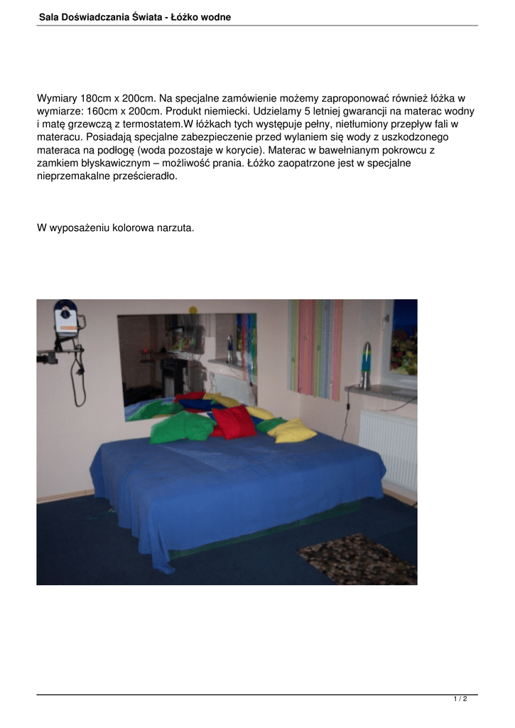 Sala Doświadczania Świata - Łóżko wodne Wymiary 180cm x 200cm. Na specjalne zamówienie możemy zaproponować również łóżka w wymiarze: 160cm x 200cm. Produkt niemiecki. Udzielamy 5 letniej gwarancji na materac wodny i matę grzewczą z termostatem.W łóżkach tych występuje pełny, nietłumiony przepływ fali w materacu. Posiadają specjalne zabezpieczenie przed wylaniem się wody z uszkodzonego materaca na podłogę (woda pozostaje w korycie). Materac w bawełnianym pokrowcu z zamkiem błyskawicznym – możliwość prania. Łóżko zaopatrzone jest w specjalne nieprzemakalne prześcieradło. W wyposażeniu kolorowa narzuta. 1/2 Sala Doświadczania Świata - Łóżko wodne 2/2