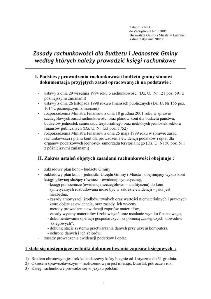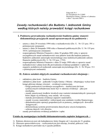 Załącznik Nr 1 do Zarządzenia Nr 3/2005 Burmistrza Gminy i Miasta w Lubrańcu z dnia 7 stycznia 2005 r. Zasady rachunkowości dla Budżetu i Jednostek Gminy według których należy prowadzić księgi rachunkowe I. Podstawę prowadzenia rachunkowości budżetu gminy stanowi dokumentacja przyjętych zasad opracowanych na podstawie : - - ustawy z dnia 29 września 1994 roku o rachunkowości (Dz. U. Nr 121 poz. 591 z późniejszymi zmianami) ustawy z dnia 26 listopada 1998 roku o finansach publicznych (Dz. U. Nr 155 poz. 1014 z późniejszymi zmianami) rozporządzenia Ministra Finansów z dnia 18 grudnia 2001 roku w sprawie szczegółowych zasad rachunkowości oraz planów kont dla budżetu państwa, budżetów jednostek samorządu terytorialnego oraz niektórych jednostek sektora finansów publicznych (Dz. U. Nr 153 poz. 1752) rozporządzenia Ministra Finansów z dnia 25 maja 1999 roku w sprawie zasad rachunkowości i planu kont dla prowadzenia ewidencji podatków i opłat dla organów podatkowych jednostek samorządu terytorialnego (Dz. U. Nr 50 poz. 511 z późniejszymi zmianami) II. Zakres ustaleń objętych zasadami rachunkowości obejmuje : - - zakładowy plan kont – budżetu Gminy zakładowy plan kont – jednostki Urzędu Gminy i Miasta - obejmujący wykaz kont księgi głównej służący również – ewidencji syntetycznej, - księgi pomocnicze (ewidencja szczegółowo – analityczna) do kont syntetycznych rozbudowana może być w zakresie ewidencji – jaka jest niezbędna, - zasady amortyzacji środków trwałych oraz wartości niematerialnych i prawnych które objęte są ewidencją, oraz zasady ich wyceny, - metody prowadzenia ewidencji zapasów materiałów, - zasady wyceny materiałów i zobowiązań oraz ustalanie wyniku finansowego, - dokumentowanie operacji gospodarczych za pomocą „zastępczych dowodów księgowych”, - dokumentację systemu przetwarzania danych przy użyciu komputera, - ochronę danych i ich zbiorów, zasady prowadzenia ewidencji podatków i opłat. Ustala się następujące techniki dokumentowania zapisów księgowych : 1) Rokiem obrotowym jest rok kalendarzowy który biegnie od 1 stycznia do 31 grudnia. 2) Okresem sprawozdawczym – rozliczeniowym jest miesiąc, kwartał, półrocze i rok. 3) Księgi rachunkowe prowadzi się w języku polskim. 1 4) Podstawę zapisów w księgach rachunkowych stanowią dowody księgowe stwierdzające dokonanie operacji gospodarczej, zwane „dowodami źródłowymi”. Zapisy zdarzeń gospodarczych w księgach rachunkowych ujmuje się w kolejności dat ich powstawania, co najmniej z podziałem na poszczególne okresy sprawozdawcze. 5) Wykazane w księgach rachunkowych na dzień ich zamknięcia stany aktywów i pasywów, ujmuje się w tej samej wysokości w bilansie otwarcia następnego roku obrotowego. 6) Księgi rachunkowe prowadzi się techniką mieszaną tj : - techniką ręczną, - techniką komputerową. 7) Księgi rachunkowe obejmują zbiory zapisów księgowych, obrotów, (sum zapisów) i sald wynikających z : - księgi głównej (ewidencji syntetycznej) w której obowiązuje ujęcie każdej operacji zgodnie z zasadą podwójnego zapisu (Wn –Ma), - ksiąg pomocniczych (analitycznych), - zestawień obrotów i sald księgi głównej i ksiąg pomocnicznych. Księga główna odzwierciedla zapisy w ujęciu syntetycznym, księgi pomocnicze stanowią uszczegółowienie księgi głównej. Zestawienia obrotów i sald sporządza się na podstawie sum zapisów na kontach księgi głównej i kontach analitycznych na koniec każdego miesiąca. 8) Zapisy w księgach rachunkowych dokonuje się na podstawie dowodów księgowych : - zewnętrznych (otrzymywanych od kontrahentów - przekazywanych kontrahentom), - wewnętrznych – (dotyczące operacji wewnątrz jednostki). Każdy dowód księgowy odzwierciedla rzeczywisty przebieg operacji gospodarczej wolny od błędów rachunkowych. Jeżeli jedną operację dokumentuje więcej niż jeden dowód, dopuszcza się stosowanie uproszczeń polegających na zbiorczym księgowaniu operacji gospodarczych jednorodnych przeprowadzanych w ciągu dnia. Dowód jest oznaczony numerem umożliwiającym powiązanie dowodu z zapisami księgowymi dokonanymi na jego podstawie. 9) Konta syntetyczne oznaczone są symbolami trzycyfrowymi. 10) Księgi rachunkowe prowadzi się na bieżąco i rzetelnie, właściwie kwalifikując dowody księgowe w odniesieniu do klasyfikacji budżetowej oraz zakładowego planu kont. 11) Rozliczanie i grupowanie kosztów następuje na kontach rodzajowych zespołu „4” z zachowaniem zgodności wydatków gminy za dany rok. 12) Dochody i wydatki budżetowe klasyfikuje się według : - działów i rozdziałów – określających rodzaj działalności, - paragrafów - określających rodzaj dochodu lub wydatku, zgodnie z obowiązującą klasyfikacją budżetową. 13) Wydatki budżetowe są realizowane : - w sposób celowy i oszczędny, - umożliwiający terminową realizację zadań, - w wysokości i terminach wynikających z wcześniej zaciągniętych zobowiązań, - zgodnie z zasadami określonymi w przepisach o zamówieniach publicznych, - nie powodując naruszeń dyscypliny budżetowej w rozumieniu art. 138 Ustawy z dnia 26 listopada 1998r. o finansach publicznych. 14) Korygowanie zapisów po zamknięciu okresu sprawozdawczego (miesiąca) następuje na podstawie dowodu wewnętrznego Pk – polecenie księgowania. Poprawianie zapisów w 2 księgach rachunkowych dokonuje się poprzez korektę zapisów ujemnych (tzw. czerwone storno) na tych samych stronach kont na których nastąpił błędny zapis. Zapewnia to prawidłową wysokość obrotów i czytelność zapisów księgowych. Błędy w dowodach wewnętrznych mogą być poprawiane przez skreślenie błędnej treści lub kwoty z utrzymaniem czytelności błędnego zapisu i wpisanie poprawnej treści. Za niedopuszczalne uznaje się dokonywanie w dowodach księgowych wymazywań, przeróbek lub poprawiania pojed