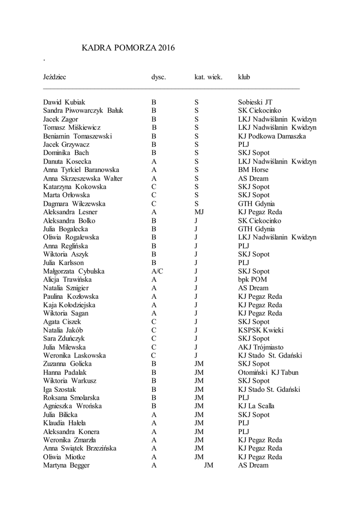 KADRA POMORZA 2016 . Jeździec dysc. kat. wiek. klub ______________________________________________________________________ Dawid Kubiak Sandra Piwowarczyk Bałuk Jacek Zagor Tomasz Miśkiewicz Beniamin Tomaszewski Jacek Grzywacz Dominika Bach Danuta Kosecka Anna Tyrkiel Baranowska Anna Skrzeszewska Walter Katarzyna Kokowska Marta Orłowska Dagmara Wilczewska Aleksandra Lesner Aleksandra Bolko Julia Bogalecka Oliwia Rogalewska Anna Reglińska Wiktoria Aszyk Julia Karlsson Małgorzata Cybulska Alicja Trawińska Natalia Sznigier Paulina Kozłowska Kaja Kołodziejska Wiktoria Sagan Agata Ciszek Natalia Jakób Sara Zduńczyk Julia Milewska Weronika Laskowska Zuzanna Golicka Hanna Padalak Wiktoria Warkusz Iga Szostak Roksana Smolarska Agnieszka Wrońska Julia Bilicka Klaudia Hałeła Aleksandra Konera Weronika Zmarzła Anna Swiątek Brzezińska Oliwia Miotke Martyna Begger B B B B B B B A A A C C C A B B B B B B A/C A A A A A C C C C C B B B B B B A A A A A A A S S S S S S S S S S S S S MJ J J J J J J J J J J J J J J J J J JM JM JM JM JM JM JM JM JM JM JM JM JM Sobieski JT SK Ciekocinko LKJ Nadwiślanin Kwidzyn LKJ Nadwiślanin Kwidzyn KJ Podkowa Damaszka PLJ SKJ Sopot LKJ Nadwiślanin Kwidzyn BM Horse AS Dream SKJ Sopot SKJ Sopot GTH Gdynia KJ Pegaz Reda SK Ciekocinko GTH Gdynia LKJ Nadwiślanin Kwidzyn PLJ SKJ Sopot PLJ SKJ Sopot bpk POM AS Dream KJ Pegaz Reda KJ Pegaz Reda KJ Pegaz Reda SKJ Sopot KSPSK Kwieki SKJ Sopot AKJ Trójmiasto KJ Stado St. Gdański SKJ Sopot Otomiński KJ Tabun SKJ Sopot KJ Stado St. Gdański PLJ KJ La Scalla SKJ Sopot PLJ PLJ KJ Pegaz Reda KJ Pegaz Reda KJ Pegaz Reda AS Dream Matylda Cybula Weronika Kaszuba Adrian Kowalczyk Milena Kot Jagoda Kazana Alicja Rotter Alicja Kowalczyk Diego Pieniaszek Natasza Wostal Julia Bisewska Natalia Anduła Martyna Dubieniecka Maria Padalak Maggi Misztal Paulina Kiempa Aniela Ziółkowska Maja Baranowska Natalia Plata Martyna Ossowska A A A C C C C C C C A/B B B A/B B A/B A A A JM JM JM JM JM JM JM JM JM JM M M M M M M M M M AS Dream PLJ KJ Pegaz Reda AKJ Trójmiasto KSPSK Kwieki AKJ KJ Stado St. Gdański KJ Stado St. Gdański KJ Stado St. Gdański AKJ Trójmiasto KJ Pegaz Reda PLJ Otomiński KJ Tabun KJ Pegaz Reda HKJ Lotna Słupsk AS Dream BM Horse bpk POM KJ Pegaz Reda