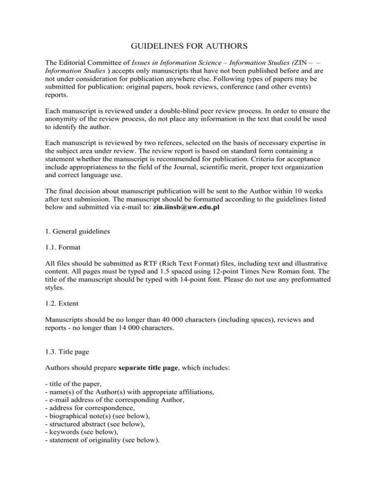GUIDELINES FOR AUTHORS The Editorial Committee of Issues in Information Science – Information Studies (ZIN – – Information Studies ) accepts only manuscripts that have not been published before and are not under consideration for publication anywhere else. Following types of papers may be submitted for publication: original papers, book reviews, conference (and other events) reports. Each manuscript is reviewed under a double-blind peer review process. In order to ensure the anonymity of the review process, do not place any information in the text that could be used to identify the author. Each manuscript is reviewed by two referees, selected on the basis of necessary expertise in the subject area under review. The review report is based on standard form containing a statement whether the manuscript is recommended for publication. Criteria for acceptance include appropriateness to the field of the Journal, scientific merit, proper text organization and correct language use. The final decision about manuscript publication will be sent to the Author within 10 weeks after text submission. The manuscript should be formatted according to the guidelines listed below and submitted via e-mail to: [email protected] 1. General guidelines 1.1. Format All files should be submitted as RTF (Rich Text Format) files, including text and illustrative content. All pages must be typed and 1.5 spaced using 12-point Times New Roman font. The title of the manuscript should be typed with 14-point font. Please do not use any preformatted styles. 1.2. Extent Manuscripts should be no longer than 40 000 characters (including spaces), reviews and reports - no longer than 14 000 characters. 1.3. Title page Authors should prepare separate title page, which includes: - title of the paper, - name(s) of the Author(s) with appropriate affiliations, - e-mail address of the corresponding Author, - address for correspondence, - biographical note(s) (see below), - structured abstract (see below), - keywords (see below), - statement of originality (see below). According to the Journal policy against ghostwriting and guest authorship, Authors are requested to list on this page names and affiliations of each person that contributed to the text (the author of the idea, methods, etc. used in the submitted manuscript as well as thepercentage of this author’s contribution to the research process and text compilation). Authors are also requested to describe sources of founding that have supported the work and the financial involvement of research institutes, associations and other entities (financial disclosure). 1.4. Author(s) biographical note(s) The title page should include concise biographical notes (about 70 words each) of all authors: academic degrees or professional positions, current places of work and positions, areas of interest, the most important publications (max. 3). Authors should also provide their contact details: e-mail, postal address. 1.5. Structured abstract Each submitted manuscript should be accompanied by an abstract 100 words or 1000 characters long and placed on the title page. The abstract should be formatted according to the categories listed below. Author(s) should identify at least four mandatory sections: - Purpose/thesis (mandatory) - Approach/methods (mandatory) - Results and conclusions (mandatory) - Research limitations (optional) - Practical implications (optional) - Originality/value (mandatory) 1.6. Keywords The title page should include keywords (4 to 10) - noun phrases in singular form, where first element is capitalized. Keywords in alphabetical order should be delimited by full stop. 1.7. Statement of originality Author(s) should include on the title page a statement that the submitted text has not been published before and is not under consideration for publication anywhere else. If the paper was presented at a scientific meeting, provide detailed information about the event and the conference proceedings. If the paper is planned to become a part of the Author's book, provide its details and planned publishing date. 2. Manuscript formatting and preparation 2.1. Body of the paper The text should be organized into entitled sections and subsections. It should start with Introduction, giving an overview and stating the purpose, and end with Conclusion, giving the summary of the author’s contribution to the study. Author(s) may use three levels of headings. Each heading should have its own title and number according to the following pattern: 1. First-level heading 1.1. Second-level heading 1.1.1 Third-level heading 2.2. References Bibliographic citations are not allowed in footnotes. The reference list should be prepared according to APA 6-th Edition citation style (see below). Footnotes can be used only to give additional information or commentary. Footnotes are numbered consecutively with Arabic numerals. It is recommended to limit the amount of footnotes per page. 2.3. Titles in the body of the text Titles of exhibitions, conferences, programs, etc. should be written within double quotation marks. Use italics for publication titles (books, journals, papers, etc.). 2.4. Emphasis Bold face should be used to emphasize certain words or passages. 2.5. Illustrative content All illustrations (tables, charts, figures etc.) should be converted to greyscale. All illustrations should be cited in the text according to their form (Table, Figure, Photograph, etc.) and have title and consecutive number (e.g. Table 1. Metadata levels). Use the abbreviation in the text when referring to the illustrative content (e.g. see Tab.1, see. Figure 5). 2.6. Citations and reference list Use APA 6-th Edition as a citation and reference list format. The references list should only include works that are cited in the text. Cite references in the text by the name(s) of the author(s) and year of publication in parentheses: (Name, Year of publication), eg. (Dembowska, 1991). If there are two authors, put their name
