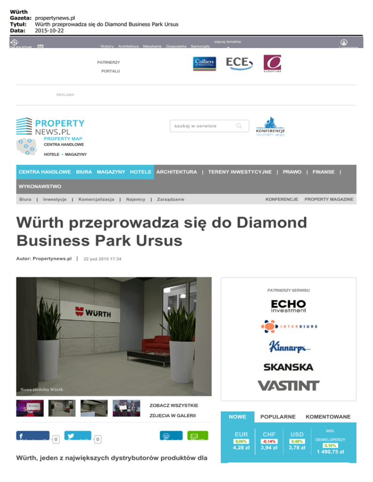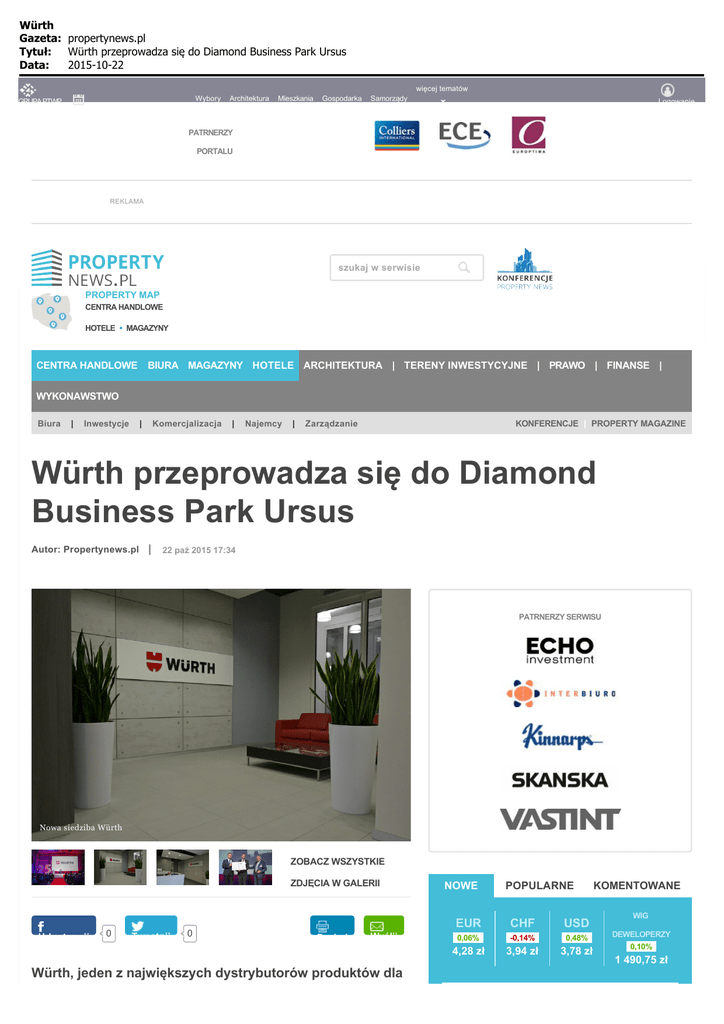 Würth Gazeta: propertynews.pl Tytuł: Würth przeprowadza się do Diamond Business Park Ursus Data: 2015-10-22 więcej tematów Wybory Architektura Mieszkania Gospodarka Samorządy GRUPA PTWP Logowanie / Rejestracja Czwartek, 22 października 2015 r. PATRNERZY PORTALU REKLAMA szukaj w serwisie PROPERTY MAP CENTRA HANDLOWE HOTELE • MAGAZYNY CENTRA HANDLOWE BIURA MAGAZYNY HOTELE ARCHITEKTURA | TERENY INWESTYCYJNE | PRAWO | FINANSE | WYKONAWSTWO Biura | Inwestycje | Komercjalizacja | Najemcy | Zarządzanie KONFERENCJE | PROPERTY MAGAZINE Würth przeprowadza się do Diamond Business Park Ursus Autor: Propertynews.pl 22 paź 2015 17:34 PATRNERZY SERWISU Nowa siedziba Würth ZOBACZ WSZYSTKIE ZDJĘCIA W GALERII Udostępnij 0 Tweetnij 0 Drukuj Wyślij Würth, jeden z największych dystrybutorów produktów dla NOWE POPULARNE EUR CHF USD 0,06% -0,14% 0,48% 4,28 zł 3,94 zł 3,78 zł KOMENTOWANE WIG DEWELOPERZY 0,10% 1 490,75 zł Würth Gazeta: propertynews.pl Tytuł: Würth przeprowadza się do Diamond Business Park Ursus Data: 2015-10-22 przemysłu świętuje 25-lecie działalności firmy na polskim rynku. Gala odbyła się w nowej siedzibie firmy, która znajduje się w warszawskim biurowcu Diamond Business Park Ursus. Grupa Würth została założona w 1945 r. w Niemczech i obecnie składa się z 400 samodzielnych firm, rozmieszczonych w 80 krajach na wszystkich kontynentach. Zatrudnia blisko 67 tys. osób, z czego ponad 30 tys. to przedstawiciele handlowi. Würth to również ponad 3 miliony lojalnych klientów oraz przeszło 10 mld euro wartości sprzedaży. Polski oddział firmy funkcjonuje pod szyldem Würth Polska. Obecnie posiada 18 sklepów rozmieszczonych na terenie całego kraju oraz sklep on-line. W ofercie Würth Polska znajduje się ponad 100 tys. produktów. Koncern prowadzi sprzedaż wyłącznie firmom i osobom prowadzącym działalność gospodarczą. 18:13 Lokalizacja kluczowa dla sukcesu hotelu 18:07 CH Auchan Gdańsk stawia na komunikację kolejową 18:04 Selfie w ofercie stołecznego Domu Mody Klif 18:01 Hanna Milczarek: przestój na rynku inwestycyjnym wkrótce się skończy 17:58 Condohotels Management przejmie zarządzanie termami w Lidzbarku 17:54 Focus Mall Bydgoszcz wzmacnia segment modowy 17:48 2 października 2015 r. spółka Würth Polska świętowała 25-lecie istnienia firmy w naszym kraju. Gala jubileuszowa odbyła się w nowej siedzibie firmy, która mieści się przy ul. Posag 7 Panien 1, w dzielnicy Ursus w Warszawie, na terenie nowo wybudowanego Diamond Business Parku. W nowej lokalizacji firma dysponuje nowoczesnym centrum logistycznym o powierzchni niemal 5000 mkw. , które zapewnia większą przepustowość i tym samym szybszą realizację większej ilości zamówień – powyżej 6600 pozycji dziennie. Diamond Business Parku Wurth RSS biura komercjalizacja POLECAMY Inwestycje w miastach regionalnych jeszcze nigdy nie były tak popularne WIĘCEJ WIADOMOŚCI REKLAMA BĄDŹ NA BIEŻĄCO RSS RSS NEWSLETTER podaj adres e-mail Skomentuj (Brak komentarzy - Bądź pierwszy!) REKOMENDOWANE DLA CIEBIE Hanna Milczarek: przestój na rynku inwestycyjnym wkrótce się skończy Inwestycje w miastach regionalnych jeszcze nigdy nie były tak popularne ZAPISZ Najważniejsze informacje portalu propertynews.pl prosto na Twój e-mail Würth Gazeta: propertynews.pl Tytuł: Würth przeprowadza się do Diamond Business Park Ursus Data: 2015-10-22 Ostatnie tygodnie wieżowca byłej DOKP Milion metrów kwadratowych biur przedmiotem umów w 2015 roku REKLAMA REDAKCJA REKLAMA REGULAMIN POLITYKA PRYWATNOŚCI POLITYKA COOKIES KONTAKT • • • • • • MODUŁY INFORMACJI • RSS PARTNERZY •