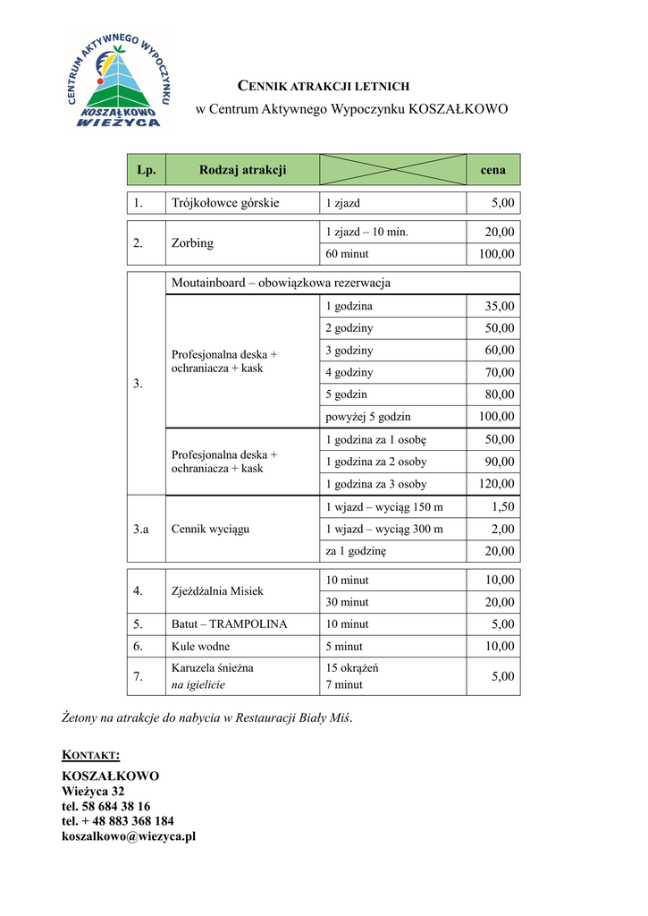 CENNIK ATRAKCJI LETNICH w Centrum Aktywnego Wypoczynku KOSZAŁKOWO Lp. Rodzaj atrakcji 1. Trójkołowce górskie 2. Zorbing cena 1 zjazd 1 zjazd – 10 min. 60 minut 5,00 20,00 100,00 Moutainboard – obowiązkowa rezerwacja Profesjonalna deska + ochraniacza + kask 3. 1 godzina 35,00 2 godziny 50,00 3 godziny 60,00 4 godziny 70,00 5 godzin 80,00 powyżej 5 godzin Profesjonalna deska + ochraniacza + kask 3.a Cennik wyciągu 100,00 1 godzina za 1 osobę 50,00 1 godzina za 2 osoby 90,00 1 godzina za 3 osoby 120,00 1 wjazd – wyciąg 150 m 1,50 1 wjazd – wyciąg 300 m 2,00 za 1 godzinę 20,00 10 minut 10,00 30 minut 20,00 4. Zjeżdżalnia Misiek 5. Batut – TRAMPOLINA 10 minut 5,00 6. Kule wodne 5 minut 10,00 7. Karuzela śnieżna na igielicie 15 okrążeń 7 minut Żetony na atrakcje do nabycia w Restauracji Biały Miś. KONTAKT: KOSZAŁKOWO Wieżyca 32 tel. 58 684 38 16 tel. + 48 883 368 184 [email protected] 5,00