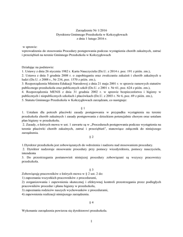 Zarządzenie Nr 1/2016 Dyrektora Gminnego Przedszkola w Kołczygłowach z dnia 1 lutego 2016 r. w sprawie: wprowadzenia do stosowania Procedury postępowania podczas wystąpienia chorób zakaźnych, zatruć i przeziębień na terenie Gminnego Przedszkola w Kołczygłowach Działając na podstawie: 1. Ustawy z dnia 26 stycznia 1982 r. Karta Nauczyciela (Dz.U. z 2014 r. poz. 191 z późn. zm.), 2. Ustawa z dnia 5 grudnia 2008 r. o zapobieganiu oraz zwalczaniu zakażeń i chorób zakaźnych u ludzi (Dz.U. z 2008 r., Nr 234, poz. 1570 z późn. zm.), 3. Rozporządzenia Ministra Edukacji Narodowej z dnia 21 maja 2001 r. w sprawie ramowych statutów publicznego przedszkola oraz publicznych szkół (Dz.U. z 2001 r. Nr 61, poz. 624 z późn. zm.), 4. Rozporządzenia MENiS z dnia 31 grudnia 2002 r. w sprawie bezpieczeństwa i higieny w publicznych i niepublicznych szkołach i placówkach (Dz.U. z 2003 r. Nr 6, poz. 69 z późn. zm.), 5. Statutu Gminnego Przedszkola w Kołczygłowach zarządzam, co następuje: §1 1. Ustalam dla potrzeb placówki zasady postępowania w przypadku wystąpienia na terenie przedszkola chorób zakaźnych i zasady postępowania z dzieckiem potencjalnie chorym oraz ustalam plan higieny w przedszkolu. 2. Zasady, o których mowa w ust. 1 zawarte są w „Procedurach postępowania podczas wystąpienia na terenie placówki chorób zakaźnych, zatruć i przeziębień”, stanowiące załącznik do niniejszego zarządzenia. §2 1.Dyrektor przedszkola jest zobowiązanych do wdrożenia i nadzoru nad stosowaniem procedury. 2. Dyrektor nadzoruje stosowanie procedury przy pomocy wicedyrektora, pomocy nauczyciela, intendenta 3. Do przestrzegania postanowień niniejszej procedury zobowiązani są wszyscy pracownicy przedszkola. §3 Zobowiązuję pracowników o których mowa w § 2 ust. 2 do: 1) zapoznania wszystkich pracowników z procedurami, 2) zorganizowania i zapewnienia skutecznej i efektywnej kontroli przestrzegania przez podległych pracowników procedur i planu higieny w przedszkolu, 3) zapoznania rodziców naszych wychowanków z procedurami, 4) zapewnienia realizacji niniejszego zarządzenia. §4 Wykonanie zarządzenia powierza się dyrektorowi przedszkola. 1 §5 Zarządzenie wchodzi w życie z dniem podpisania. Dyrektor Przedszkola mgr Małgorzata Jankowska 2 Zał. do Zarządzenia Nr 1 /2016 Dyrektora Gminnego Przedszkola w Kołczygłowach z dnia 1 lutego 2016 r. Procedura postępowania na wypadek wystąpienia choroby zakaźnej w Gminnym Przedszkolu w Kołczygłowach I. Cel procedury Bezpieczeństwo wychowanków może być zagrożone, gdy zdrowe dzieci są zmuszone do kontaktu z chorymi w grupie. Placówka nie może represjonować żadnego dziecka, a kwestia oceny, czy jest ono przeziębione i zaraża, czy zdrowe, jest kwestią subiektywną. Nauczyciel czy dyrektor nie może odmówić przyjęcia dziecka potencjalnie chorego. Celem niniejszej procedury jest zatem ustalenie zasad postępowania z dziećmi potencjalnie chorymi oraz ustalenie planów higieny w przedszkolu tak aby zdrowe dzieci nie były narażane na niebezpieczeństwo zarażenia się od dziecka chorego lub ustalenie działań, które zminimalizują to ryzyko. Niniejsza procedura jest tylko wytyczną do postępowania, jednak wszystko jest kwestią zdrowego rozsądku, rozmów i współpracy z rodzicami. II. Przedmiot i zakres procedury Przedmiotem niniejszej procedury jest określenie: 1. określenie zasad postępowania z dzieckiem chorym, określenie zasad postępowania z dzieckiem chorym – objawy chorób, 3. określenie zasad higieny w przedszkolu. 2. Zakres stosowania dotyczy wszystkich pracowników placówek przedszkola, wychowanków przedszkola, a także rodziców i opiekunów prawnych wychowanków placówki. III. Definicje Choroba – ogólne określenie każdego odstępstwa od pełni zdrowia organizmu. Choroba polega na zaburzeniu funkcji lub uszkodzeniu struktury organizmu. O zaistnieniu choroby można mówić wtedy, gdy działanie czynnika chorobotwórczego wywołuje niepożądane objawy, różniące się od czynności zdrowego organizmu. 3 Przeziębienie – wirusowa infekcja górnych dróg oddechowych. Główne objawy to katar, kaszel, ból gardła i podwyższona temperatura ciała. Objawy zwykle ustępują po 5-7 dniach. Zatrucie –zespół objawów chorobowych wywołanych działaniem trucizny na organizm. Wirusy - (łac. virus – trucizna, jad) – skomplikowane cząsteczki organiczne nie mające struktury komórkowej, zbudowane z białek i kwasów nukleinowych. Zawierają materiał genetyczny w postaci RNA (wirusy RNA) lub DNA, wykazują jednak zarówno cechy komórkowych organizmów żywych, jak i materii nieożywionej. Bakterie -(łac. bacteria, od gr. bakterion – pałeczka) – grupa mikroorganizmów, stanowiących osobne królestwo. Są to jednokomórkowce lub zespoły komórek o budowie prokariotycznej. Choroby zakaźne, choroby infekcyjne – grupa chorób ludzi, będących następstwem zakażenia ustroju czynnikiem zakaźnym i złamania sił odpornościowych organizmu (lub w odwrotnej kolejności) lub obecności w organizmie bioaktywnych toksyn (jadów) drobnoustrojów. Do niedawna mianem choroby zakaźnej określano choroby wywoływane także przez robaki (np. owsica), pierwotniaki (np. malaria) i małe stawonogi (np. wszawica). Obecnie te choroby nazywane są chorobami pasożytniczymi. Choroba zakaźna, która może łatwo przenosić się pomiędzy organizmami w sposób pośredni lub bezpośredni nosi nazwę choroby zaraźliwej. IV. Odpowiedzialność 1. Za wdrożenie i nadzór nad stosowaniem procedury odpowiada dyrektor placówki. 2.Do przestrzegania postanowień procedury zobowiązani są wszyscy pracownicy przedszkola. 3. Za zapoznanie pracowników i rodziców lub opiekunów prawnych wychowanków z zakresu niniejszej procedury odpowiada dyrektor placówki. V. Tryb postępowania 1. Profilaktyka zdrowotna Profilaktyka zdrowotna są to działania mające na celu zapobieganie chorobom,