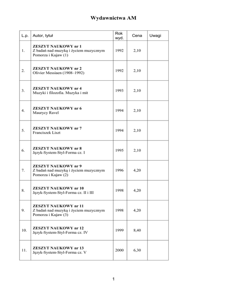 Wydawnictwa AM L.p. Autor, tytuł Rok wyd. Cena 1. ZESZYT NAUKOWY nr 1 Z badań nad muzyką i życiem muzycznym Pomorza i Kujaw (1) 1992 2,10 2. ZESZYT NAUKOWY nr 2 Olivier Messiaen (1908–1992) 1992 2,10 3. ZESZYT NAUKOWY nr 4 Muzyki i filozofia. Muzyka i mit 1993 2,10 4. ZESZYT NAUKOWY nr 6 Maurycy Ravel 1994 2,10 5. ZESZYT NAUKOWY nr 7 Franciszek Liszt 1994 2,10 6. ZESZYT NAUKOWY nr 8 Język-System-Styl-Forma cz. I 1995 2,10 7. ZESZYT NAUKOWY nr 9 Z badań nad muzyką i życiem muzycznym Pomorza i Kujaw (2) 1996 4,20 8. ZESZYT NAUKOWY nr 10 Język-System-Styl-Forma cz. II i III 1998 4,20 9. ZESZYT NAUKOWY nr 11 Z badań nad muzyką i życiem muzycznym Pomorza i Kujaw (3) 1998 4,20 10. ZESZYT NAUKOWY nr 12 Język-System-Styl-Forma cz. IV 1999 8,40 11. ZESZYT NAUKOWY nr 13 Język-System-Styl-Forma cz. V 2000 6,30 1 Uwagi Rok wyd. Cena 2002 10,50 2002 15,75 2004 17,85 2005 26,25 16. PRACA ZBIOROWA nr 22 Dzieło muzyczne i jego archetyp (2) The musical work and its archetype (2) 2006 31,50 17. PRACA ZBIOROWA nr 23 Wydarzenia muzyczne na Pomorzu i Kujawach z serii: Z badań nad muzyką i życiem muzycznym Pomorza i Kujaw (9) 2006 21 18. PRACA ZBIOROWA nr 24 Dzieło muzyczne jako fenomen dźwiękowy (3) 2007 31,50 19. PRACA ZBIOROWA nr 25 Nauczanie muzyki na Pomorzu i Kujawach z serii: Z badań nad muzyką i życiem muzycznym Pomorza i Kujaw (10) 2007 27,30 20. PRACA ZBIOROWA nr 26 Dzieło muzyczne i jego rezonans (4) 2008 36,75 21. PRACA ZBIOROWA nr 27 Nauczyciele muzyki na Pomorzu i Kujawach z serii: Z badań nad muzyką i życiem muzycznym Pomorza i Kujaw (11) 2008 36,75 22. PRACA ZBIOROWA nr 28 Musica ecclesiastica z serii: Z badań nad muzyką i życiem muzycznym Pomorza i Kujaw (12) 2009 29,40 23. PRACA ZBIOROWA nr 29 Dzieło muzyczne i jego konteksty (5) 2009 31,50 L.p. Autor, tytuł 12. 13. 14. 15. ZESZYT NAUKOWY nr 15 Tradycje muzyki instrumentalnej na Pomorzu i Kujawach z serii: Z badań nad muzyką i życiem muzycznym Pomorza i Kujaw (5) PRACA ZBIOROWA nr 17 Muzyka i media na Pomorzu i Kujawach z serii: Z badań nad muzyką i życiem muzycznym Pomorza i Kujaw (7) PRACA ZBIOROWA nr 20 Muzyka w instytucjach i stowarzyszeniach na Pomorzu i Kujawach [17 ] z serii: Z badań nad muzyką i życiem muzycznym Pomorza i Kujaw (8) PRACA ZBIOROWA nr 21 Dzieło muzyczne, jego estetyka, struktura i recepcja (1) The musical work, its aesthetics, structure and reception (1) 2 Uwagi L.p. Autor, tytuł Rok wyd. Cena 24. PRACA ZBIOROWA nr 30 Dzieło muzyczne i jego funkcje (6) 2010 36,75 25. PRACA ZBIOROWA nr 31 Muzyka i polityka na Pomorzu i Kujawach 2011 25,00 26. PRACA ZBIOROWA nr 32 Traces and Echoes of Chopin's Work (7) 2011 40,00 27. PRACA ZBIOROWA nr 33 Materialne ślady kultury muzycznej na Pomorzu i Kujawach 2012 27,00 28. PRACA ZBIOROWA nr 34 Dzieło muzyczne jako znak (8) 2012 30,00 29. PRACA ZBIOROWA nr 35 Świadkowie kultury muzycznej na Pomorzu i Kujawach 2013 30,00 30. Musica Varia 2008 21,00 31. Anna Nowak Pomorska Orkiestra Symfoniczna 1946-1952 1994 32. Alicja Weber Z dziejów opery w Bydgoszczy 1996 33. Andrzej Łęgowski Wprowadzenie do gry na instrumentach dętych 1997 34. Violetta Przech Polska twórczość na fortepian solo 19561985. Nowatorskie techniki i kierunki 2004 35. Barbara Gogol-Drożniakiewicz Życie muzyczne Bydgoszczy w latach 19201939 2005 3 1,05 1,05 8,40 26,25 26,25 Uwagi L.p. Autor, tytuł Rok wyd. Cena 25,20 36. Michał Zieliński Twórczość orkiestrowa Tadeusza Bairda w kontekście techniki instrumentacji 2005 37. Violetta Przech Katalog tematyczny dzieł Ryszarda Kwiatkowskiego 2005 38. Aleksandra Kłaput-Wiśniewska Wielka filharmonia. Filharmonia Pomorska w latach 1953-1990 2006 39. Karol Szymanowski Sześciopałkowa technika gry na wibrafonie. Metoda Karola Szymanowskiego 2007 40. Beata Jasik Katalog tematyczny utworów Franciszka Woźniaka 2007 41. 42. Urszula Jankowiak Bel canto i ekspresja we włoskiej operze I połowy XIX wieku na przykładzie partii Adalgisy w operze "Norma" Vincenzo Belliniego Profesor Jerzy Godziszewski. Pierwszy Doktor Honoris Causa Akademii Muzycznej w Bydgoszczy publikacja okolicznościowa 2008 2007 43. Dang Thai Son. Doktor Honoris Causa Akademii Muzycznej w Bydgoszczy publikacja okolicznościowa 2010 44. Profesor Mieczysław Tomaszewski. Doktor Honoris Causa Akademii Muzycznej w Bydgoszczy publikacja okolicznościowa 2010 45. Elżbieta Szczurko Twórczość Antoniego Szałowskiego w kontekście muzyki XX wieku 2008 46. Piotr Biskupski Hi-Hat. Spojrzenie od kulis 2009 47. Monika Wilkiewicz Repertuar chóralny i jego zastosowanie w procesie nauczania przedmiotu "dyrygowanie" 2009 4 15,75 18,90 21,00 23,10 21,00 21,00 Cena 15,75 15,75 36,75 31,50 21,00 Uwagi Rok wyd. L.p. Autor, tytuł Cena 36,75 48. Michał Zieliński Model mozartowskiej orkiestry symfonicznej 49. Joanna Krempeć-Kaczor 2010 Adolf Misek "Sonaty na kontrabas i fortepian" 50. Marek Moździerz "Sześć monologów Jedermanna" Franka Martin. Musica de morte 2011 51. Karol Szymanowski Struktury akordowe w grze wibrafonisty jazzowego – czterodźwięki 2011 52. Piotr Biskupski Aspekty linearnej interpretacji przebiegów rytmicznych 2011 53. Katarzyna Rajs Chopinowski idiom mazurkowy w fortepianowych mazurkach Romana Maciejewskiego. Wybrane aspekty poetyki muzycznej 2011 54. Karol Szymanowski Wibrafon jako instrument harmoniczny w zespole jazzowym 2012 44,00 55. Danuta Dobrowolska-Marucha Jak słuchać aby słyszeć? (cz. I i II) 2012 70,00 56. Agnieszka Ledzińska, Violetta Przech Zbigniew Bargielski. Katalog tematyczny utworów 2012 30,00 57. Witold Szulc Aktor a partytura 2013 35,00 58. Franciszek Woźniak 12 Etiud na fortepian 1995 59. Marek Jasiński Carl Loewe in memoriam na organy 1999 2010 5 21,00 20,00 40,00 20,00 20,00 8,40 5,25 Uwagi Rok wyd. L.p. Autor, tytuł 60. red. Urszuli Bartkiewicz Polska muzyka klawiszowa z Wydawnictw Józefa Elsnera (1803–1805) na klawesyn lub fortepian 2008 61. Zbigniew Bargielski Egad na akordeon i wibrafon 2009 62. Zbignie