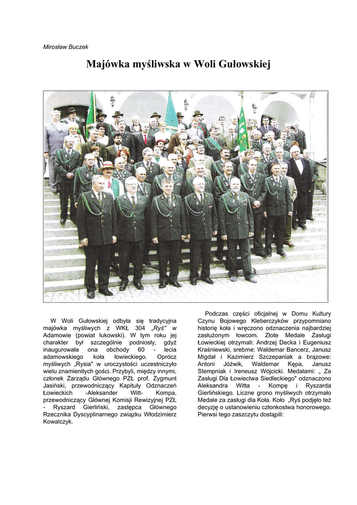 Mirosław Buczek Majówka myśliwska w Woli Gułowskiej W Woli Gułowskiej odbyła się tradycyjna majówka myśliwych z WKŁ 304 „Ryś" w Adamowie (powiat łukowski). W tym roku jej charakter był szczególnie podniosły, gdyż inaugurowała ona obchody 60 - lecia adamowskiego koła łowieckiego. Oprócz myśliwych „Rysia" w uroczystości uczestniczyło wielu znamienitych gości. Przybyli, między innymi, członek Zarządu Głównego PZŁ prof. Zygmunt Jasiński, przewodniczący Kapituły Odznaczeń Łowieckich -Aleksander WittKompa, przewodniczący Głównej Komisji Rewizyjnej PZŁ - Ryszard Gierliński, zastępca Głównego Rzecznika Dyscyplinarnego związku Włodzimierz Kowalczyk. Podczas części oficjalnej w Domu Kultury Czynu Bojowego Kleberczyków przypomniano historię koła i wręczono odznaczenia najbardziej zasłużonym łowcom. Złote Medale Zasługi Łowieckiej otrzymali: Andrzej Decka i Eugeniusz Kraśniewski, srebrne: Waldemar Bancerz, Janusz Migdał i Kazimierz Szczepaniak a brązowe: Antoni Jóżwik, Waldemar Kępa, Janusz Stempniak i Ireneusz Wójcicki. Medalami: „ Za Zasługi Dla Łowiectwa Siedleckiego" odznaczono Aleksandra Witta - Kompę i Ryszarda Gierlińskiego. Liczne grono myśliwych otrzymało Medale za zasługi dla Koła. Koło „Ryś podjęło też decyzję o ustanowieniu członkostwa honorowego. Pierwsi tego zaszczytu dostąpili: Leokadia Antoniewicz, Stanisław Anczura i Wtadysław Stablewski. - Moje związki z kołem „Ryś" sięgają czterdziestu lat - wspominał wójt gminy Adamów, Sławomir Skwarek. - Jako młody chłopak byłem naganiaczem. Do tego koła należał mój świętej pamięci ojciec, Stanisław Skwarek. On właśnie wprowadzał do grona myśliwych Antoniego Jóźwika. W „Rysiu" poluje mój uczeń, Hubert Kraśniewski. Koło zajmuje się nie tylko gospodarką łowiecką, ale też uczy i wychowuje. - Na szczególne uznanie zasługuje działalność koła „Ryś' w sferze kultywowania tradycji, gościnność, inicjatywy społeczne i kulturalne podkreślił wiceprzewodniczący Okręgowej Rady Łowieckiej w Siedlcach, Eugeniusz Ochnio. - Koło jest wzorem promowania łowiectwa i pokazywania go z najlepszej strony. Ważną częścią uroczystości była hubertowska msza święta odprawiona w tamtejszym Sanktuarium Maryjnym z udziałem Reprezentacyjnego Zespołu Muzyki Myśliwskiej PZŁ pod dyrekcją Mieczysława Leśniczaka z solistą Sławomirem Olgierdem Krammem. Koncelebrowali ją: przeor Klasztoru Ojców Karmelitów w Woli Gułowskiej o. Mieczysław Jankowski i kapelan siedleckiej organizacji łowieckiej ks. Marek Antonowicz. Przed rozpoczęciem mszy duchowni poświęcili rzeźbę św. Huberta wykonaną przez Adama Wydrę, a podczas mszy ikonę patrona myśliwych, którą wykonała i podarowała łukowska artystka Joanna Zabagło. - Niektórzy chcą widzieć myśliwych jako tych, którzy tylko korzystają ze środowiska naturalnego, chodzą ze strzelbami i myślą tylko o pozyskaniu zwierzyny - powiedział podczas okolicznościowej homilii ksiądz Marek Antonowicz. - Prawda jest jednak zupełnie inna. Gdyby nie troska myśliwych, nie byłoby już na Ziemi wielu gatunków zwierząt. To dzięki myśliwym są okresy ochronne, podczas których zwierzyna ma spokój. (...) Sześćdziesiąt lat to długi okres. Nie ma już wśród nas tych, którzy zakładali koło „Ryś . Czynili sobie ziemię poddaną, ale myśleli nie tylko o sobie, ale także o przyszłych pokoleniach. Dbali, ażeby następcom nie zabrakło dóbr przyrody. Działalność WKŁ „Ryś" i jego prezesa Adama Stępniaka mocno komplementował o. Mieczysław Jankowski. - Myśliwi z „Rysia" z prezesem na czele podejmują wiele ciekawych i pożytecznych inicjatyw - mówił przeor. - Prezes zresztą często nas odwiedza i dzieli się z zakonnikami upolowaną zwierzyną. Bardzo mu za to dziękujemy. Ostatnim punktem uroczystości był poczęstunek w ogrodach przyklasztornych, a później biesiada myśliwska w Domu Kultury Czynu Bojowego Kleeberczyków. Jakości podawanych tam potraw mógłby pozazdrościć nawet wielki znawca kuchni myśliwskiej i staropolskiej kolega Grzegorz Russak.