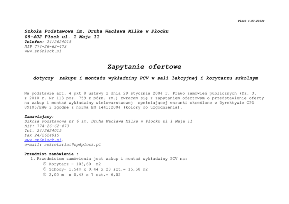 Zapytanie ofertowe - Szkoła Podstawowa nr 6 w Płocku