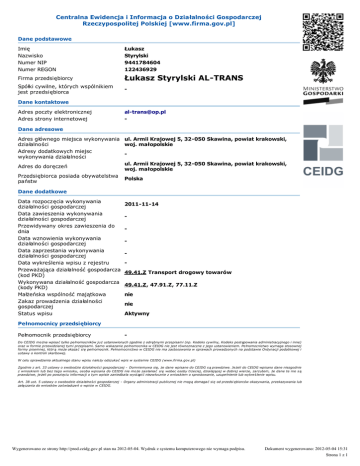 Centralna Ewidencja i Informacja o Działalności Gospodarczej Rzeczypospolitej Polskiej [www.firma.gov.pl] Dane podstawowe Imię Nazwisko Numer NIP Numer REGON Łukasz Styrylski 9441784604 122436929 Firma przedsiębiorcy Łukasz Styrylski AL-TRANS Spółki cywilne, których wspólnikiem jest przedsiębiorca - Dane kontaktowe Adres poczty elektronicznej Adres strony internetowej [email protected] - Dane adresowe Adres głównego miejsca wykonywania ul. Armii Krajowej 5, 32-050 Skawina, powiat krakowski, działalności woj. małopolskie Adresy dodatkowych miejsc wykonywania działalności ul. Armii Krajowej 5, 32-050 Skawina, powiat krakowski, Adres do doręczeń woj. małopolskie Przedsiębiorca posiada obywatelstwa Polska państw Dane dodatkowe Data rozpoczęcia wykonywania działalności gospodarczej Data zawieszenia wykonywania działalności gospodarczej Przewidywany okres zawieszenia do dnia Data wznowienia wykonywania działalności gospodarczej Data zaprzestania wykonywania działalności gospodarczej Data wykreślenia wpisu z rejestru Przeważająca działalność gospodarcza (kod PKD) Wykonywana działalność gospodarcza (kody PKD) Małżeńska wspólność majątkowa Zakaz prowadzenia działalności gospodarczej Status wpisu 2011-11-14 49.41.Z Transport drogowy towarów 49.41.Z, 47.91.Z, 77.11.Z nie nie Aktywny Pełnomocnicy przedsiębiorcy Pełnomocnik przedsiębiorcy - Do CEIDG mo żna wpisać tylko pełnomocników ju ż ustanowionych zgodnie z odrębnymi przepisami (np. Kodeks cywilny, Kodeks post ępowania administracyjnego i inne) oraz w formie przewidzianej tymi przepisami. Samo wskazanie pe łnomocnika w CEIDG nie jest równoznaczne z jego ustanowieniem. Pe łnomocnictwo wymaga stosownej formy pisemnej, któr ą może okazać si ę pełnomocnik. Pe łnomocnictwo w CEIDG nie ma zastosowania w sprawach prowadzonych na podstawie Ordynacji podatkowej i ustawy o kontroli skarbowej. W celu sprawdzenia aktualnego stanu wpisu nale ży odszukać wpis w systemie CEIDG (www.firma.gov.pl) Zgodnie z art. 33 ustawy o swobodzie dzia łalności gospodarczej - Domniemywa się, że dane wpisane do CEIDG s ą prawdziwe. Je żeli do CEIDG wpisano dane niezgodnie z wnioskiem lub bez tego wniosku, osoba wpisana do CEIDG nie mo że zas łaniać si ę wobec osoby trzeciej, dzia łającej w dobrej wierze, zarzutem, że dane te nie s ą prawdziwe, je żeli po powzięciu informacji o tym wpisie zaniedba ła wyst ąpi ć niezwłocznie z wnioskiem o sprostowanie, uzupe łnienie lub wykreślenie wpisu. Art. 38 ust. 5 ustawy o swobodzie dzia łalności gospodarczej - Organy administracji publicznej nie mog ą domagać si ę od przedsi ębiorców okazywania, przekazywania lub załączania do wniosków zaświadczeń o wpisie w CEIDG. Wygenerowano ze strony http://prod.ceidg.gov.pl stan na 2012-05-04. Wydruk z systemu komputerowego nie wymaga podpisu. Dokument wygenerowano: 2012-05-04 15:31 Strona 1 z 1