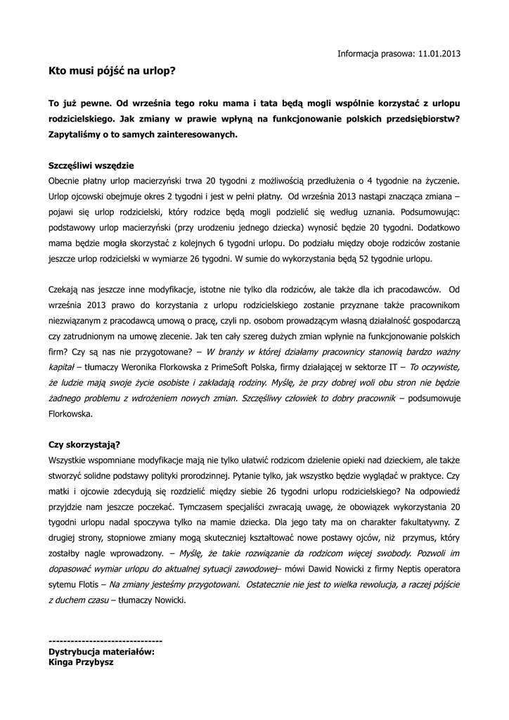 Informacja prasowa: 11.01.2013 Kto musi pójść na urlop? To już pewne. Od września tego roku mama i tata będą mogli wspólnie korzystać z urlopu rodzicielskiego. Jak zmiany w prawie wpłyną na funkcjonowanie polskich przedsiębiorstw? Zapytaliśmy o to samych zainteresowanych. Szczęśliwi wszędzie Obecnie płatny urlop macierzyński trwa 20 tygodni z możliwością przedłużenia o 4 tygodnie na życzenie. Urlop ojcowski obejmuje okres 2 tygodni i jest w pełni płatny. Od września 2013 nastąpi znacząca zmiana – pojawi się urlop rodzicielski, który rodzice będą mogli podzielić się według uznania. Podsumowując: podstawowy urlop macierzyński (przy urodzeniu jednego dziecka) wynosić będzie 20 tygodni. Dodatkowo mama będzie mogła skorzystać z kolejnych 6 tygodni urlopu. Do podziału między oboje rodziców zostanie jeszcze urlop rodzicielski w wymiarze 26 tygodni. W sumie do wykorzystania będą 52 tygodnie urlopu. Czekają nas jeszcze inne modyfikacje, istotne nie tylko dla rodziców, ale także dla ich pracodawców. Od września 2013 prawo do korzystania z urlopu rodzicielskiego zostanie przyznane także pracownikom niezwiązanym z pracodawcą umową o pracę, czyli np. osobom prowadzącym własną działalność gospodarczą czy zatrudnionym na umowę zlecenie. Jak ten cały szereg dużych zmian wpłynie na funkcjonowanie polskich firm? Czy są nas nie przygotowane? – W branży w której działamy pracownicy stanowią bardzo ważny kapitał – tłumaczy Weronika Florkowska z PrimeSoft Polska, firmy działającej w sektorze IT – To oczywiste, że ludzie mają swoje życie osobiste i zakładają rodziny. Myślę, że przy dobrej woli obu stron nie będzie żadnego problemu z wdrożeniem nowych zmian. Szczęśliwy człowiek to dobry pracownik – podsumowuje Florkowska. Czy skorzystają? Wszystkie wspomniane modyfikacje mają nie tylko ułatwić rodzicom dzielenie opieki nad dzieckiem, ale także stworzyć solidne podstawy polityki prorodzinnej. Pytanie tylko, jak wszystko będzie wyglądać w praktyce. Czy matki i ojcowie zdecydują się rozdzielić między siebie 26 tygodni urlopu rodzicielskiego? Na odpowiedź przyjdzie nam jeszcze poczekać. Tymczasem specjaliści zwracają uwagę, że obowiązek wykorzystania 20 tygodni urlopu nadal spoczywa tylko na mamie dziecka. Dla jego taty ma on charakter fakultatywny. Z drugiej strony, stopniowe zmiany mogą skuteczniej kształtować nowe postawy ojców, niż przymus, który zostałby nagle wprowadzony. – Myślę, że takie rozwiązanie da rodzicom więcej swobody. Pozwoli im dopasować wymiar urlopu do aktualnej sytuacji zawodowej– mówi Dawid Nowicki z firmy Neptis operatora sytemu Flotis – Na zmiany jesteśmy przygotowani. Ostatecznie nie jest to wielka rewolucja, a raczej pójście z duchem czasu – tłumaczy Nowicki. ------------------------------Dystrybucja materiałów: Kinga Przybysz [email protected] kom./+48/ 519-181-900