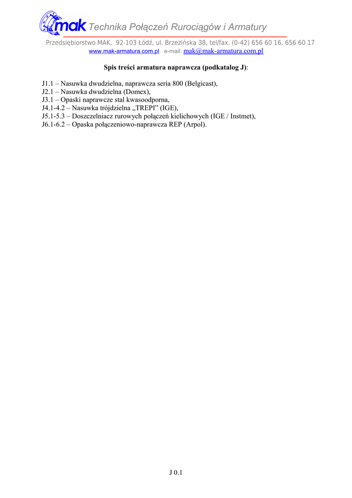 Technika Połączeń Rurociągów i Armatury Przedsiębiorstwo MAK, 92-103 Łódź, ul. Brzezińska 38, tel/fax. (0-42) 656 60 16, 656 60 17 www.mak-armatura.com.pl e-mail: [email protected] Spis treści armatura naprawcza (podkatalog J): J1.1 – Nasuwka dwudzielna, naprawcza seria 800 (Belgicast), J2.1 – Nasuwka dwudzielna (Domex), J3.1 – Opaski naprawcze stal kwasoodporna, J4.1-4.2 – Nasuwka trójdzielna „TREPI” (IGE), J5.1-5.3 – Doszczelniacz rurowych połączeń kielichowych (IGE / Instmet), J6.1-6.2 – Opaska połączeniowo-naprawcza REP (Arpol). J 0.1