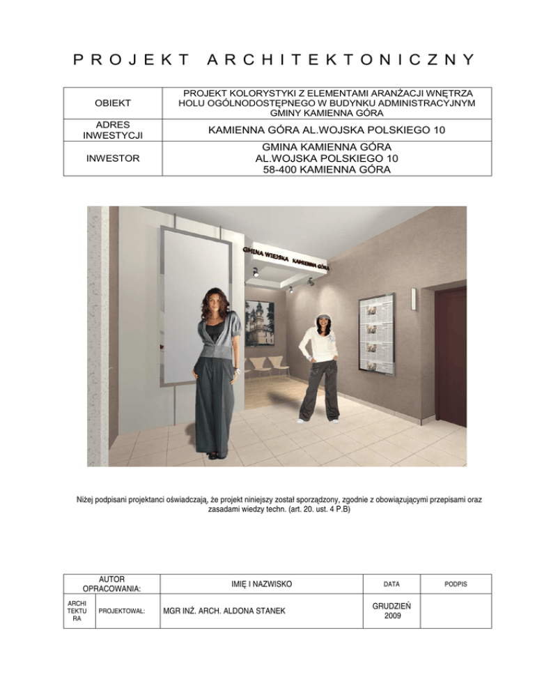 P R O J E K T A R C H I T E K T O N I C Z N Y OBIEKT PROJEKT KOLORYSTYKI Z ELEMENTAMI ARANśACJI WNĘTRZA HOLU OGÓLNODOSTĘPNEGO W BUDYNKU ADMINISTRACYJNYM GMINY KAMIENNA GÓRA ADRES INWESTYCJI KAMIENNA GÓRA AL.WOJSKA POLSKIEGO 10 INWESTOR GMINA KAMIENNA GÓRA AL.WOJSKA POLSKIEGO 10 58-400 KAMIENNA GÓRA NiŜej podpisani projektanci oświadczają, Ŝe projekt niniejszy został sporządzony, zgodnie z obowiązującymi przepisami oraz zasadami wiedzy techn. (art. 20. ust. 4 P.B) AUTOR OPRACOWANIA: ARCHI TEKTU RA PROJEKTOWAŁ: IMIĘ I NAZWISKO MGR INś. ARCH. ALDONA STANEK DATA GRUDZIEŃ 2009 PODPIS SPIS TREŚCI A.PROJEKT ARANśACJI WNĘTRZA HOLU WEJŚCIOWEGO CZĘŚĆ OPISOWA 1.PRZEDMIOT INWESTYCJI 2.PRACE PRZYGOTOWAWCZE 3.CHARAKTERYSTYKA FORMY WNĘTRZA OBIEKTU 4.ROZWIĄZANA BUDOWLANE, KONSTRUKCYJNO – MATERIAŁOWE 4.1 4.2 4.3 4.4 4.5 4.6 4.7 4.8 STOLARKA DRZWIOWA TYNKI I FARBY WEWNĘTRZNE POSADZKI KLATKA SCHODOWA SUFITY PODWIESZANE ŚCIANKI Z PŁYT G/K OŚWIETLENIE ELEMENTY WYPOSAśENIA B.PROJEKT ARANśACJI WNĘTRZA HOLU WEJŚCIOWEGO -CZĘŚĆ RYSUNKOWA A1 A2 A3 A4 A5 RZUT PARTERU RZUT PIĘTRA RZUT II PIĘTRA,RZUT PODDASZA PRZEKRÓJ A-A,PRZEKRÓJ C-C PRZEKRÓJ B-B,PRZEKRÓJ D-D PROJEKT ARANśACJI WNĘTRZA -WIZUALIZACJE KARTY KATALOGOWE 1. CZĘŚĆ OPISOWA 1. PRZEDMIOT INWESTYCJI Przedmiotem inwestycji jest modernizacja oraz aranŜacja wnętrza : • holu wejściowego do budynku, • holu ogólnodostępnego piętra, II piętra, oraz poddasza, • modernizacja klatki schodowej. Projektuje się rozmieszczenie dodatkowych punktów oświetleniowych na poszczególnych piętrach holu, modernizację istniejącej posadzki, nowy układ posadzek i kolorystykę ścian, modernizacje balustrady biegów klatki schodowej, oraz częściową wymianę stolarki drzwiowej prowadzonej z komunikacji ogólnej do poszczególnych pomieszczeń biurowych. 2. PRACE PRZYGOTOWAWCZE Do demontaŜu przewidziano następujące elementy: • na parterze –ścianę wskazaną na rys. nr A-1, stolarkę drzwiową (do pomieszczeń biurowych i gospodarczych),oznaczoną na poszczególnych rysunkach. • na piętrze-okładzinę z paneli PCV wraz z listwami przyściennymi, nawierzchnię z wykładziny linoleum, nawierzchnię z płytek podłogowych, stolarkę drzwiową, element nadwieszonej ścianki (wg. części rysunkowej) • na II piętrze-nawierzchnię z płytek podłogowych, nawierzchnię z paneli podłogowych, tynk mozaikowy (wg. części rysunkowej) • na poddaszu-stolarkę drzwiową, • na klatce schodowej-płytki podłogowe; • boczne wykończenie biegów klatki schodowej(usunięcie wierzchniej warstwy farby olejnej) • usunięcie z elementów metalowych balustrady oraz z jej drewnianego pochwytu warstw farby olejnej, • tynki na ścianach oraz na suficie, • tablice informacyjne (na kaŜdej z kondygnacji znajdujące się na ścianach oraz nad wejściami do poszczególnych pomieszczeń) • na wszystkich kondygnacjach usunięcie tynku mozaikowego. 3. CHARAKTERYSTYKA FORMY WNĘTRZA OBIEKTU PARTER Modernizacja holu wejściowego w głównym budynku administracyjnym gminy polega na usunięciu znajdującej się w niej ścianki działowej. Dzięki takiemu zabiegowi hol zyska więcej przestrzeni ,w której znajdą się miejsca siedzące dla klientów oraz miejsca przeznaczone pod banery informacyjne. Nad częścią holu zastosowano sufit podwieszany z montowanym do niego punktowym oświetleniem. Do sufitu zamocowano napis:” GMINA KAMIENNA GÓRA” wykonany z czarnej plexi gr.5mm. I PIĘTRO Strefa ogólnodostępna I piętra oparta jest na planie prostokąta o wym.ok.21m.x 2m.Dla zmniejszenia optycznego wydłuŜającego się holu wyeksponowano istniejące, przysufitowe łuki układające się w poprzek holu-za pomocą ich zróŜnicowania kolorystycznego względem sufitów. Podobny zabieg zastosowano względem wykładziny podłogowej-układając ją poprzecznie do ciągu komunikacyjnego korytarza. Zaprojektowano podświetlane wnęki z płyt g/k przeznaczone na lokalizację wniosków i folderów reklamowych gminy Oblicowanie ścianek we wnęce oraz półki wykonano z płyty meblowej w kolorze: machoń.(rys.2 det.B).W części korytarza,(znajdującej się naprzeciw biegów klatki schodowej) zaprojektowano zabudowę ze ścianki o lekkiej konstrukcji, maskującą istniejący kanał kominowy. Zabudowa stanowi odrębny element całości wnętrza holu pod względem kolorystycznym i funkcjonalnym. Na całej jej powierzchni zastosowano motyw powtarzającego się, nieregularnie rozmieszczonego nadruku(wizualizacja I Piętro). W zabudowie umieszczono równieŜ przeszkloną, podświetlaną gablotę ekspozycyjną wykonaną z płyty meblowej w kolorze: machoń.(rys.2 det.C).Na końcu korytarza zaproponowano zabudowę szaf (na materiały biurowe),wykonanych z płyty meblowej w kolorze jasnego dębu. W całości holu wyznaczono miejsca na lokalizację tablic informacyjnych oraz tabliczek z numerami pomieszczeń. Tablice informacyjne zawieszane w miejscu skrzynek licznikowych naleŜy uprzednio montować do odpowiednich stelaŜy z płyty meblowej w kolorze: machoń. II PIĘTRO Strefa ogólnodostępna II piętra oparta jest na planie prostokąta o wym.ok.18m.x 2m.Dla zmniejszenia optycznego wydłuŜającego się holu, zaprojektowano przy suficie rząd układających się w poprzek holu drewnianych belek. Dodatkowo efekt potęguje zróŜnicowanie kolorystyczne belek w stosunku do sufitu. Na II piętrze zaprojektowano podświetlane wnęki z płyt g/k przeznaczone na lokalizację wniosków i folderów reklamowych gminy Oblicowanie ścianek we wnęce oraz półki wykonano z płyty meblowej w kolorze: machoń. W części korytarza,(znajdującej się naprzeciw biegów klatki schodowej) zaprojektowano zabudowę ze ścianki o lekkiej konstrukcji, maskującą istniejący kanał kominowy. Zabudowa stanowi odrębny element całości wnętrza holu pod względem kolorystycznym i funkcjonalnym. Na całej jej powierzchni zastosowano motyw powtarzającego si