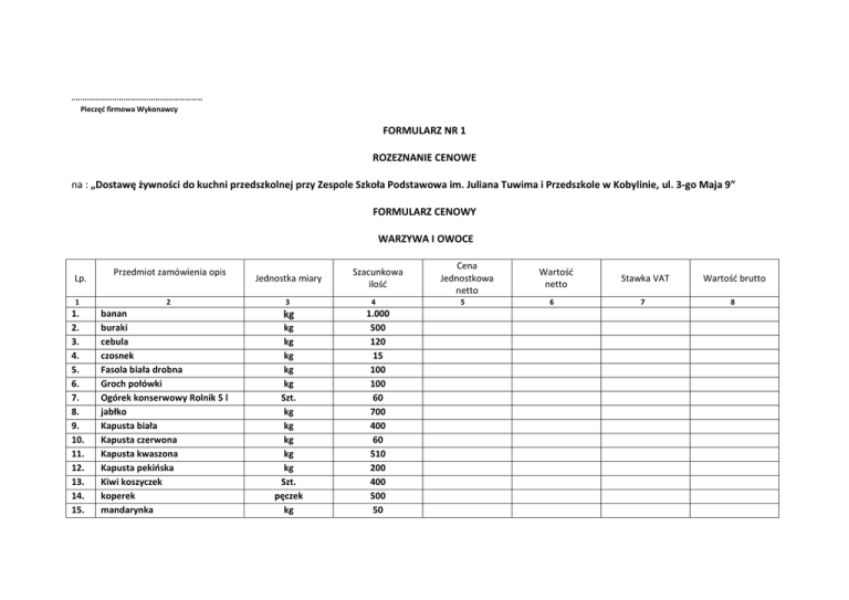 ............................................................. Pieczęć firmowa Wykonawcy FORMULARZ NR 1 ROZEZNANIE CENOWE na : „Dostawę żywności do kuchni przedszkolnej przy Zespole Szkoła Podstawowa im. Juliana Tuwima i Przedszkole w Kobylinie, ul. 3-go Maja 9” FORMULARZ CENOWY WARZYWA I OWOCE Lp. 1 1. 2. 3. 4. 5. 6. 7. 8. 9. 10. 11. 12. 13. 14. 15. Przedmiot zamówienia opis 2 banan buraki cebula czosnek Fasola biała drobna Groch połówki Ogórek konserwowy Rolnik 5 l jabłko Kapusta biała Kapusta czerwona Kapusta kwaszona Kapusta pekińska Kiwi koszyczek koperek mandarynka Jednostka miary 3 kg kg kg kg kg kg Szt. kg kg kg kg kg Szt. pęczek kg Szacunkowa ilość 4 1.000 500 120 15 100 100 60 700 400 60 510 200 400 500 50 Cena Jednostkowa netto 5 Wartość netto 6 Stawka VAT 7 Wartość brutto 8 16. 17. 18. 19. 20. 21. 22. 23. 24. 25. 26. 27. 28. 29. 30. marchew Pietruszka natka pomidory por sałata Seler korzeń Ogórek kwaszony Ogórek zielony pietruszka Cytryna pieczarki Cebula czerwona Sałata lodowa Śliwka rabarbar kg pęczek kg Szt. Szt. kg kg kg kg kg kg kg Szt. kg kg 300 300 10 180 10 150 300 110 140 270 200 20 30 40 10 RAZEM X .................................................... ……………………………………………………………………………………… miejscowość, data pieczęcie imienne i podpisy osób uprawnionych do reprezentowania wykonawcy ….......................................................... Pieczęć firmowa Wykonawcy FORMULARZ NR 2 ROZEZNIANIE CENOWE na : „Dostawę żywności do kuchni przedszkolnej przy Zespole Szkoła Podstawowa im. Juliana Tuwima i Przedszkole w Kobylinie, ul. 3-go Maja 9” FORMULARZ CENOWY PRZETWORY OWOCOWE I WARZYWNE Lp. Przedmiot zamówienia opis 1. 2. 3. 4. 5. 6. 9. 10. 11. Buraczki tarte Moryń 292 gram Buraczki wiórki (Skorupka) Brzoskwinie w puszce Kompot truskawkowy Kompot węgierkowy Kompot wiśniowy Przecier pomidorowy 1 l Kotlin Pomidor konserwowy Kompot czereśnia Producent Lub nazwa produktu Jednostka miary Szacunkowa ilość Szt. Szt. Szt. Szt. Szt. Szt. Szt. Szt. Szt. 450 100 260 500 500 500 220 140 500 RAZEM ………………………………………………………………………… miejscowość, data Cena jednostkowa netto Wartość netto Stawka VAT Wartość brutto X ……………………………………………………………………………………………….. pieczęcie imienne i podpisy osób uprawnionych do reprezentowania wykonawcy ............................................................. Pieczęć firmowa Wykonawcy FORMULARZ NR 3 ROZEZNANIE CENOWE na : „Dostawę żywności do kuchni przedszkolnej przy Zespole Szkoła Podstawowa im. Juliana Tuwima i Przedszkole w Kobylinie, ul. 3-go Maja 9” FORMULARZ CENOWY ZIEMNIAKI Lp. 1. Przedmiot zamówienia opis Producent ZIEMNIAKI Lub nazwa produktu Jednostka miary Kg Szacunkowa ilość miejscowość, data Wartość netto Stawka VAT Wartość brutto 9.000 RAZEM ………………………………………………………………………… Cena jednostkowa netto X ……………………………………………………………………………………………….. pieczęcie imienne i podpisy osób uprawnionych do reprezentowania wykonawcy ............................................................. Pieczęć firmowa Wykonawcy FORMULARZ NR 4 ROZEZNANIE CENOWE na : „Dostawę żywności do kuchni przedszkolnej przy Zespole Szkoła Podstawowa im. Juliana Tuwima i Przedszkole w Kobylinie, ul. 3-go Maja 9” FORMULARZ CENOWY SOKI OWOCOWE I WARZYWNE Lp. Przedmiot zamówienia opis Producent Lub nazwa produktu Jednostka miary Szacunkowa ilość 1. 2. 3. 4. 5. Woda niegazowana 0,5 l Sok pomidorowy Tymbark 1l Sok pomarańczowy Tymbark 0,33 Sok jabłkowy Tymbark 0,33 Sok marchwiowy Kubuś 300 ml lub ŁOWICZ Szt. Szt. Szt. Szt. Szt. 10.000 300 4.000 4.000 4.000 6. Sok pomidorowy 0,33 Szt. 4.000 RAZEM ………………………………………………………………………… miejscowość, data Cena jednostkowa netto Wartość netto Stawka VAT Wartość brutto X ……………………………………………………………………………………………….. pieczęcie imienne i podpisy osób uprawnionych do reprezentowania wykonawcy ............................................................. Pieczęć firmowa Wykonawcy FORMULARZ NR 5 ROZEZNANIE CENOWE na : „Dostawę żywności do kuchni przedszkolnej przy Zespole Szkoła Podstawowa im. Juliana Tuwima i Przedszkole w Kobylinie, ul. 3-go Maja 9” FORMULARZ CENOWY WARZYWA I INNE PRZETWORY MROŻONE Lp. 1. 2. 3. 4. 5. 6. 7. 8. 10. 11. Przedmiot zamówienia i opis Truskawki mrożone Nordis Fasolka szparagowa Groszek z marchewką Kalafior mrożony Marchew mrożona Knedle truskawkowe Nordis Zupa jarzynowa Włoszczyzna mrożona Pierogi ruskie Bukiet warzyw Producent lub nazwa produktu, gramatura/pojemność Jednostka miary kg kg kg kg kg kg kg kg kg kg Cena Szacunkowa Jednostkowa ilość netto miejscowość, data Stawka VAT Wartość brutto 50 370 50 80 150 400 320 1.600 300 200 Razem ……………………………………………………………………… Wartość netto x ……………………………………………………………………………………………….. pieczęcie imienne i podpisy osób uprawnionych do reprezentowania wykonawcy ............................................................. Pieczęć firmowa Wykonawcy FORMULARZ NR 6 ROZEZNANIE CENOWE na : „Dostawę żywności do kuchni przedszkolnej przy Zespole Szkoła Podstawowa im. Juliana Tuwima i Przedszkole w Kobylinie, ul. 3-go Maja 9” FORMULARZ CENOWY RYBY Lp. 1. 2. Przedmiot zamówienia i opis Ryba w panierce (filet) Ryba miruna bez skóry, bez wody Producent lub nazwa produktu, gramatura/pojemność Jednostka miary kg kg Cena Szacunkowa Jednostkowa ilość netto miejscowość, data Stawka VAT Wartość brutto 150 200 Razem …